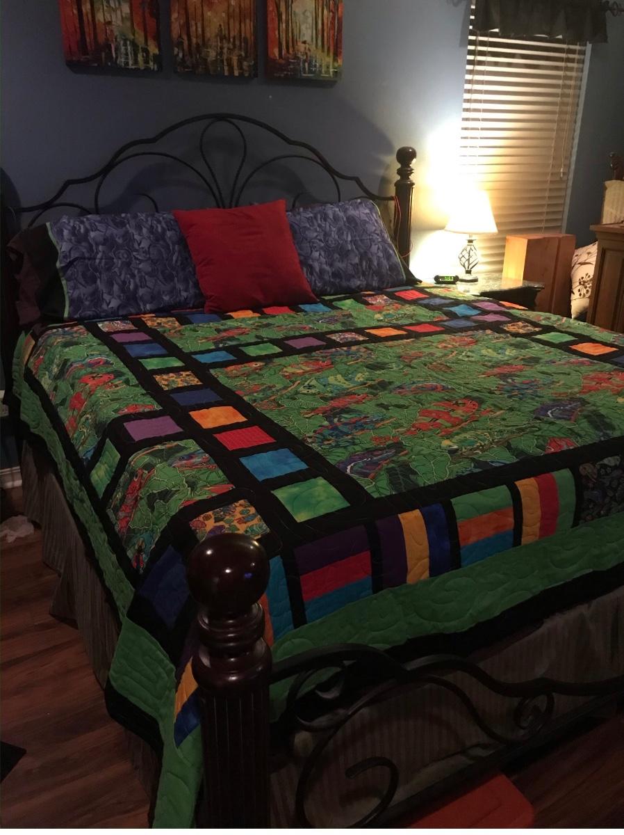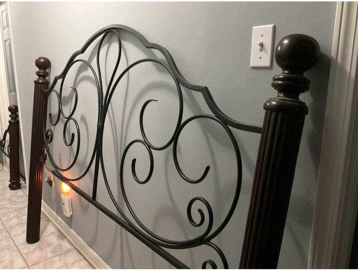 . Beautiful solid oak (stained cherry) & heavy iron king size headboard & footboard with rails included. All hardware included also. Renaissance style. Pick up in Mandeville