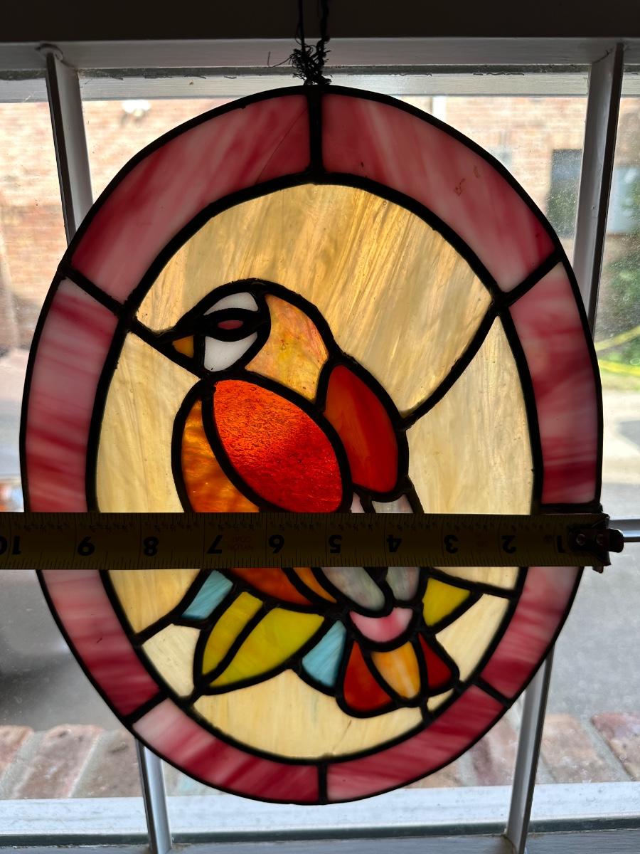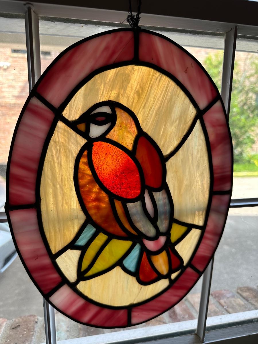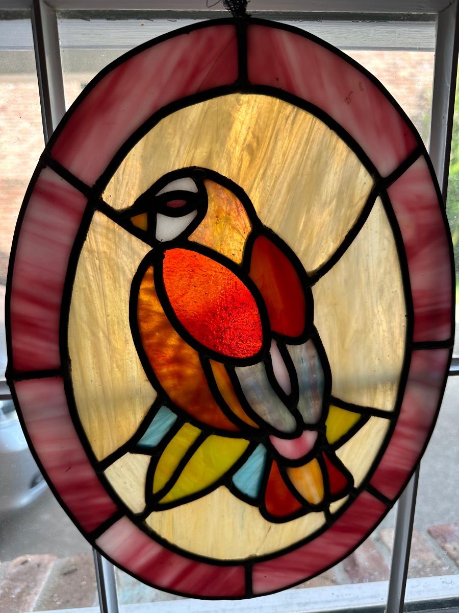 Stained glass bird has minor cracks in the glass but it is still solid.