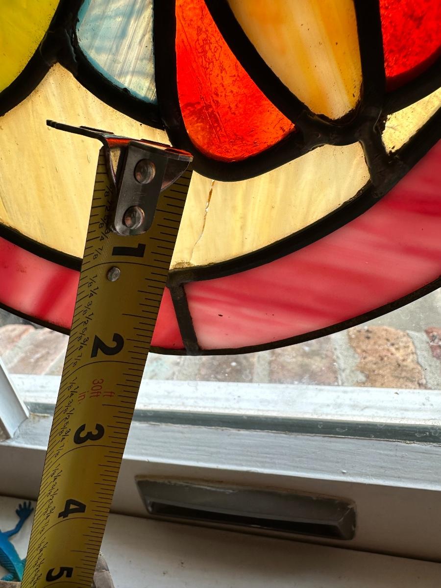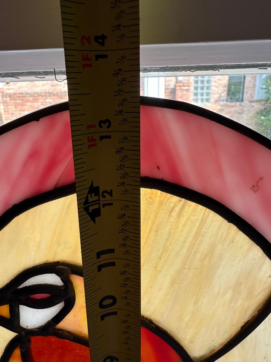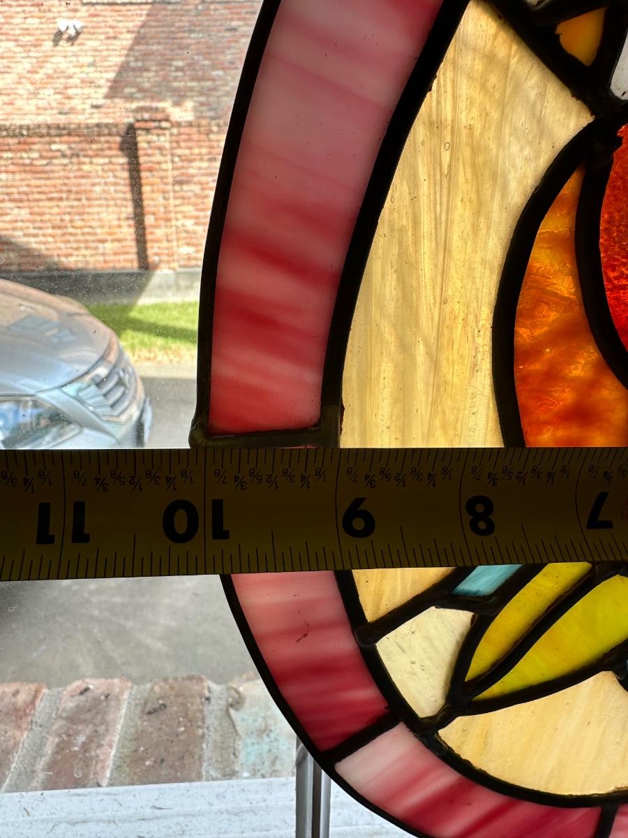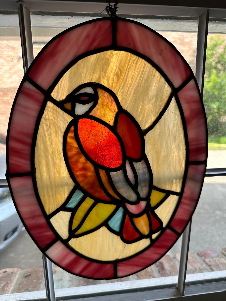 Stained glass bird has minor cracks in the glass but it is still solid.