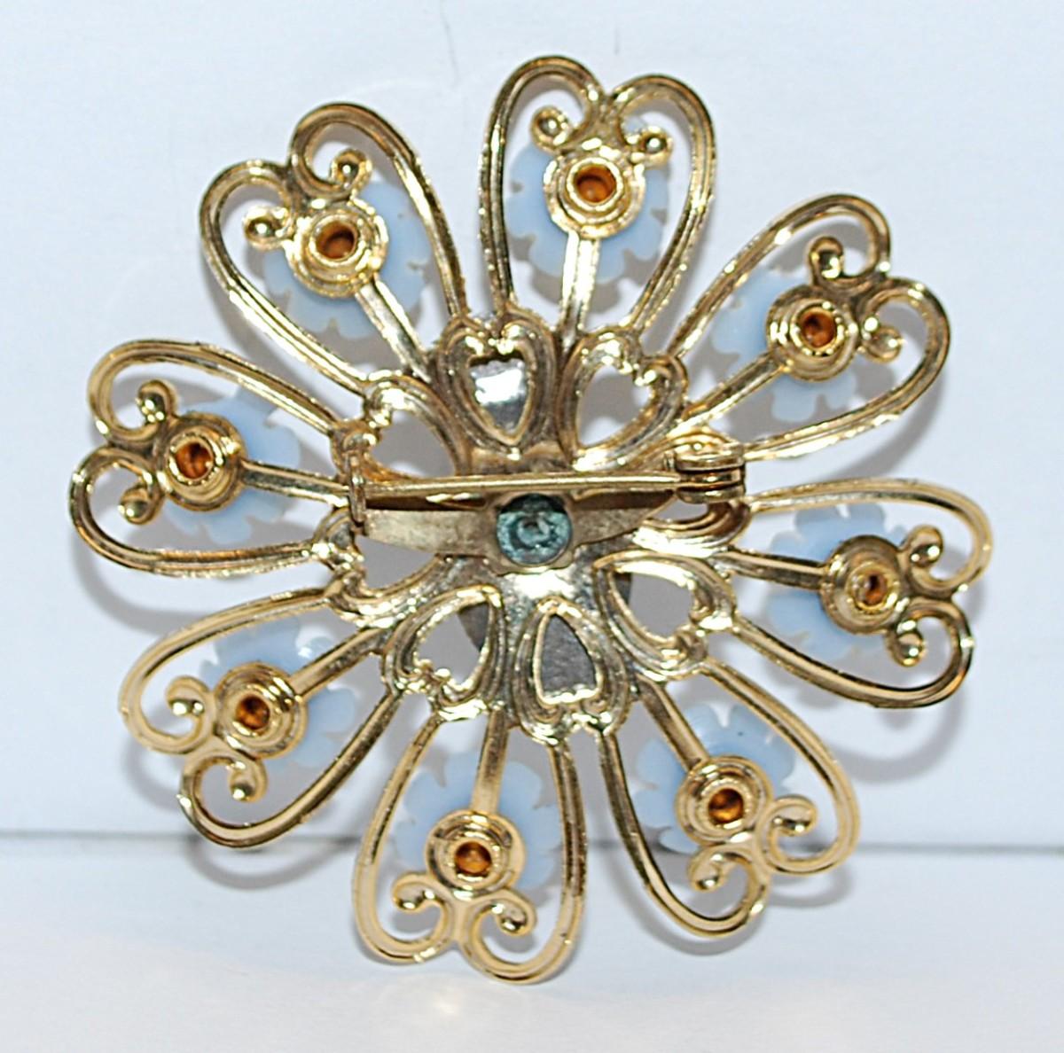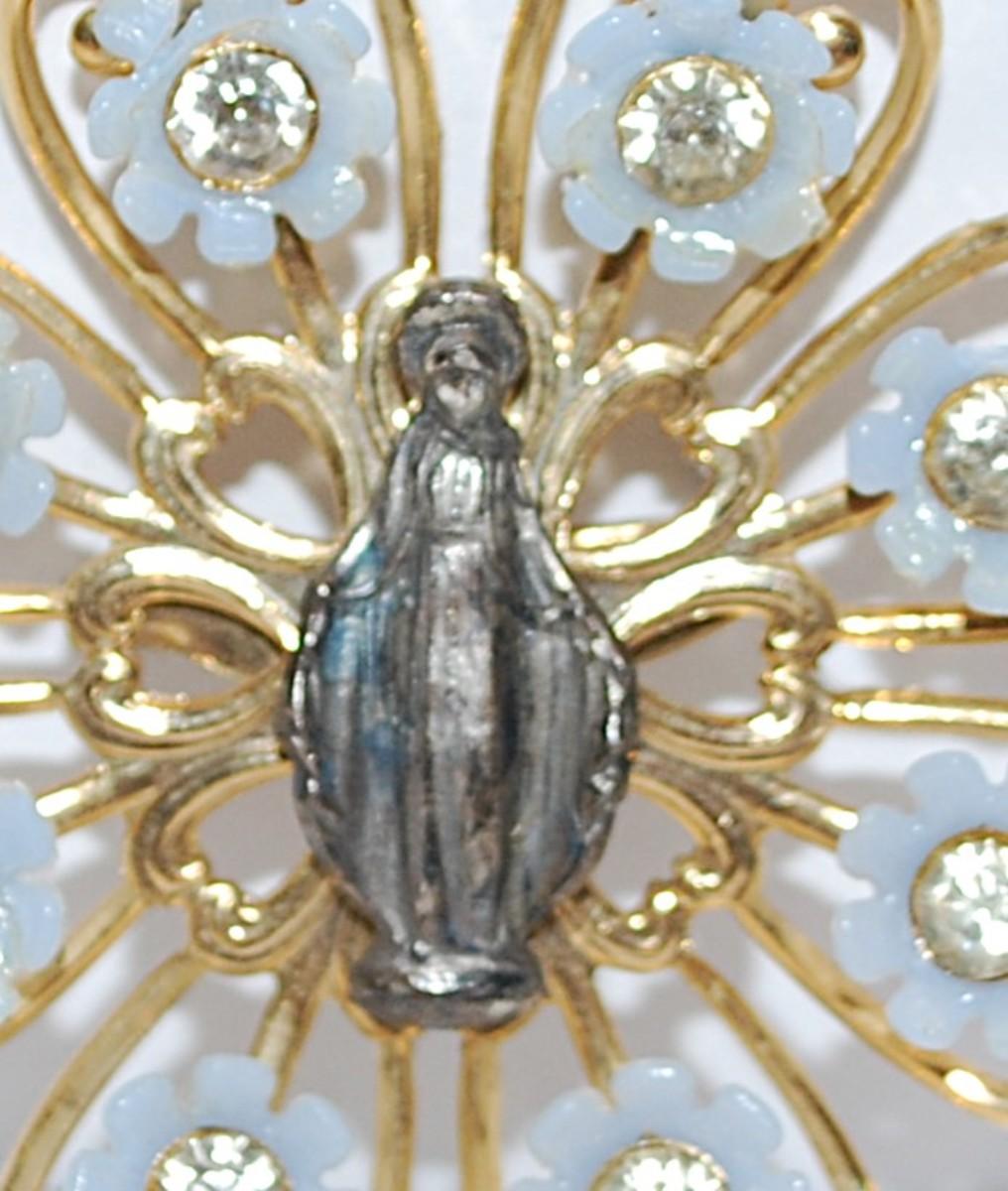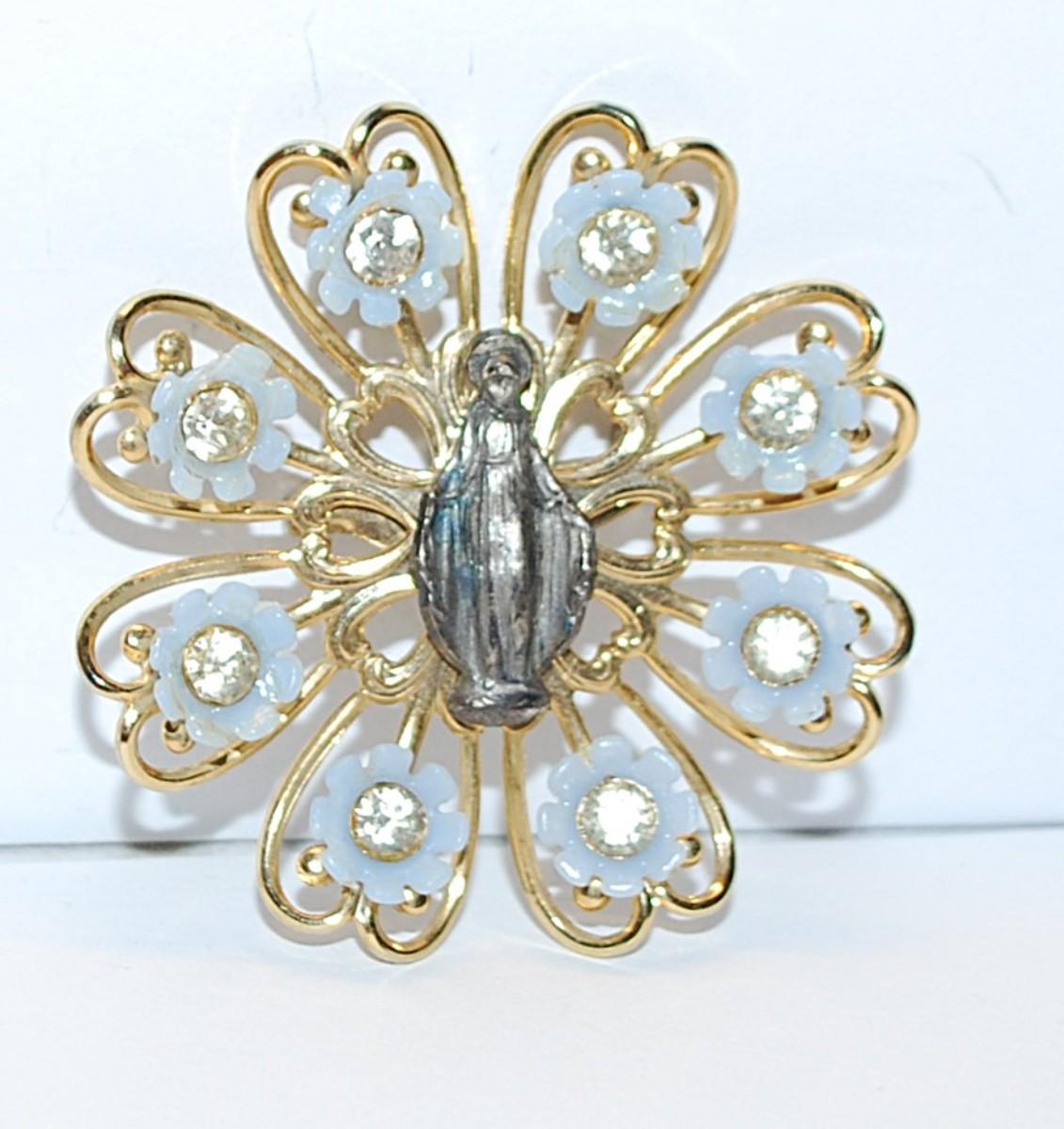Beautiful "Statue of Mary" FLOWER BROOCH (1¾" Diam.) with Light Blue Circle of Flowers on a Gold Tone Setting