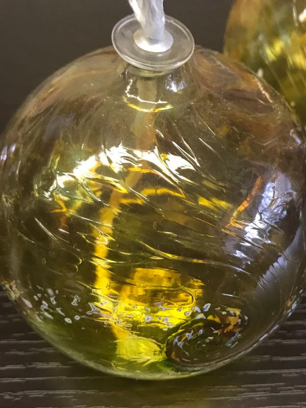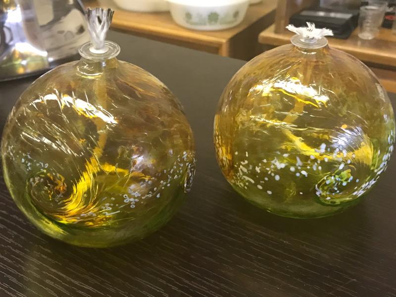 Beautiful Swirl Design Amber Glass Oil Lamps. 4" diameter each