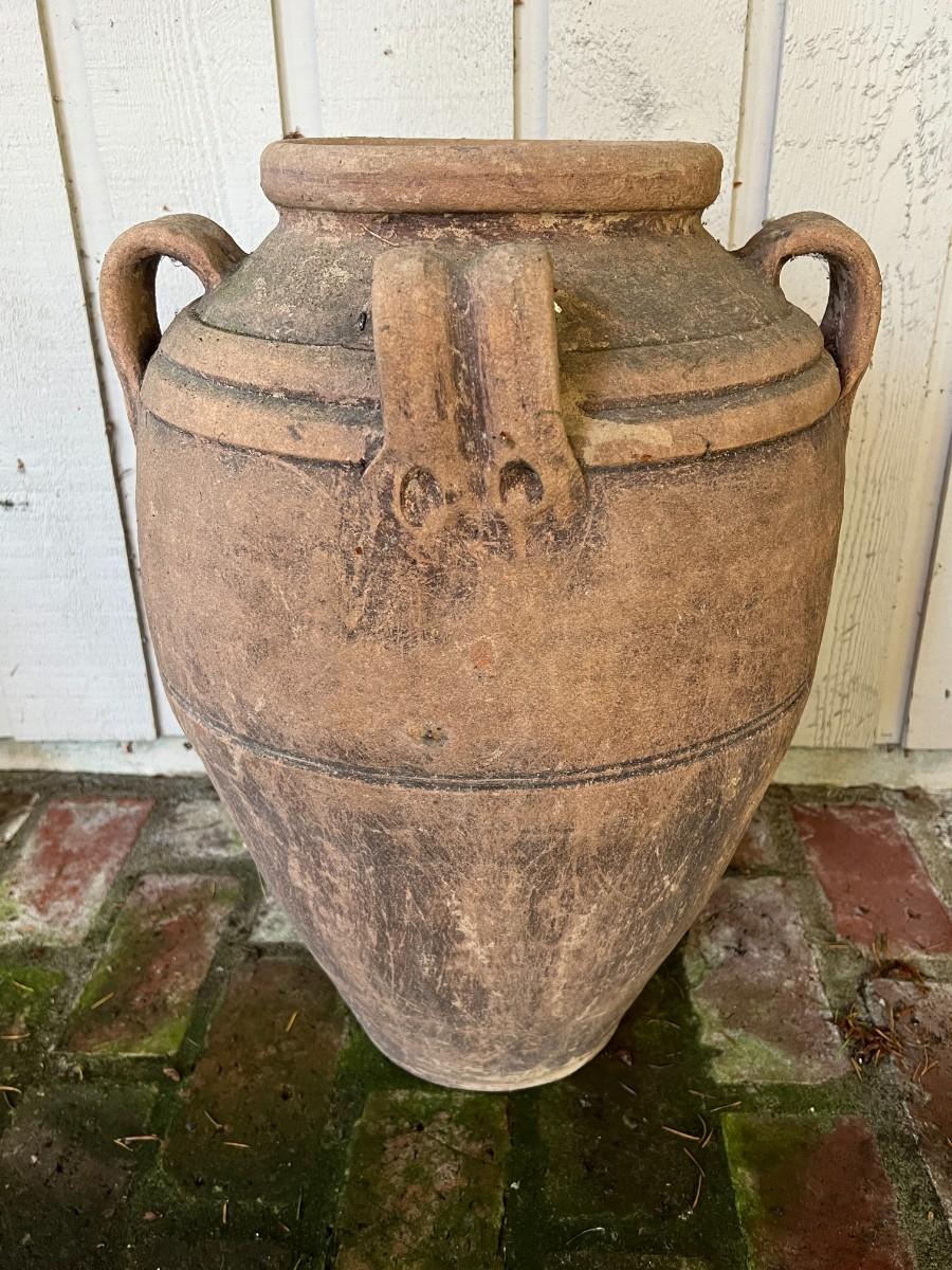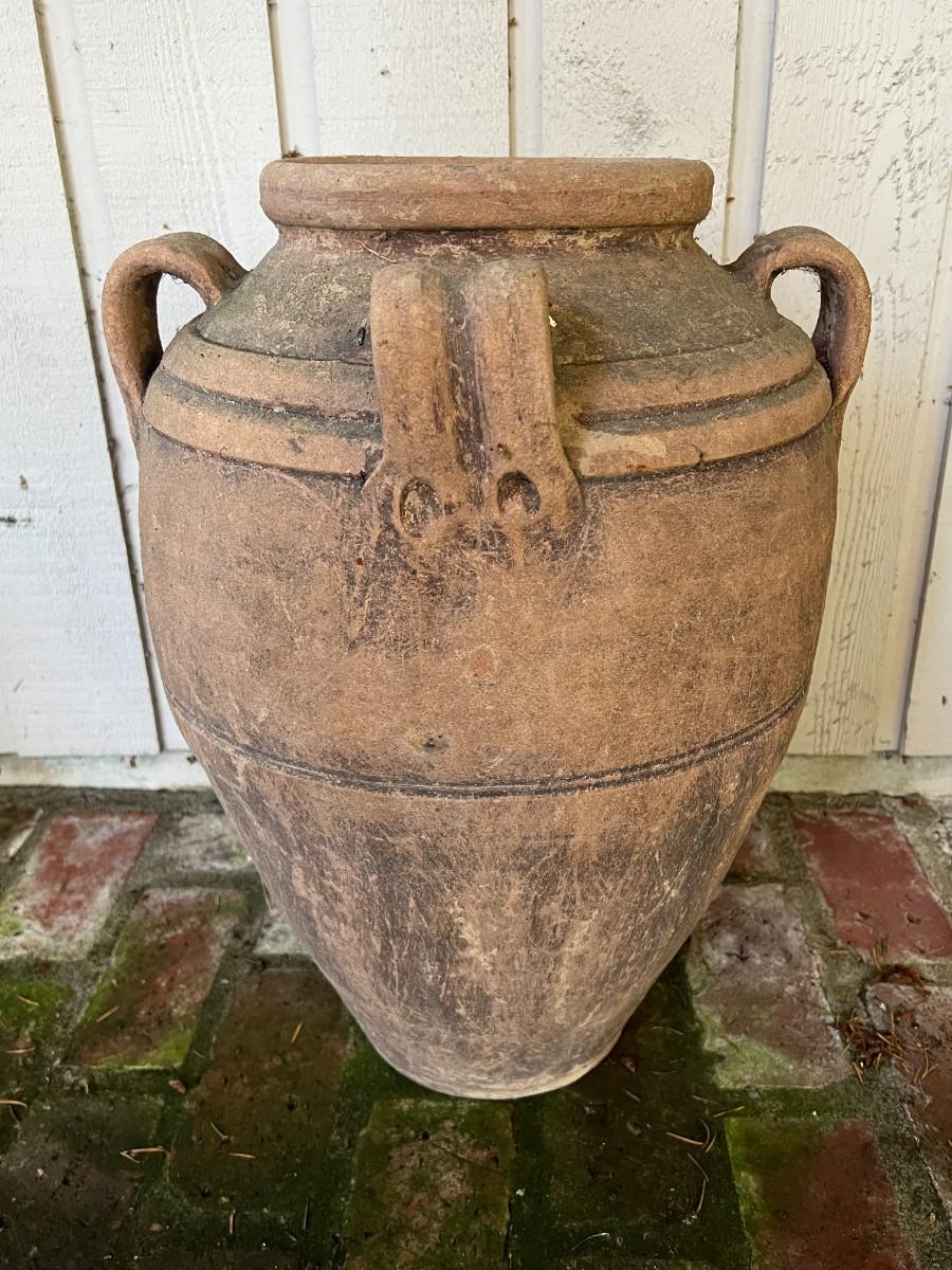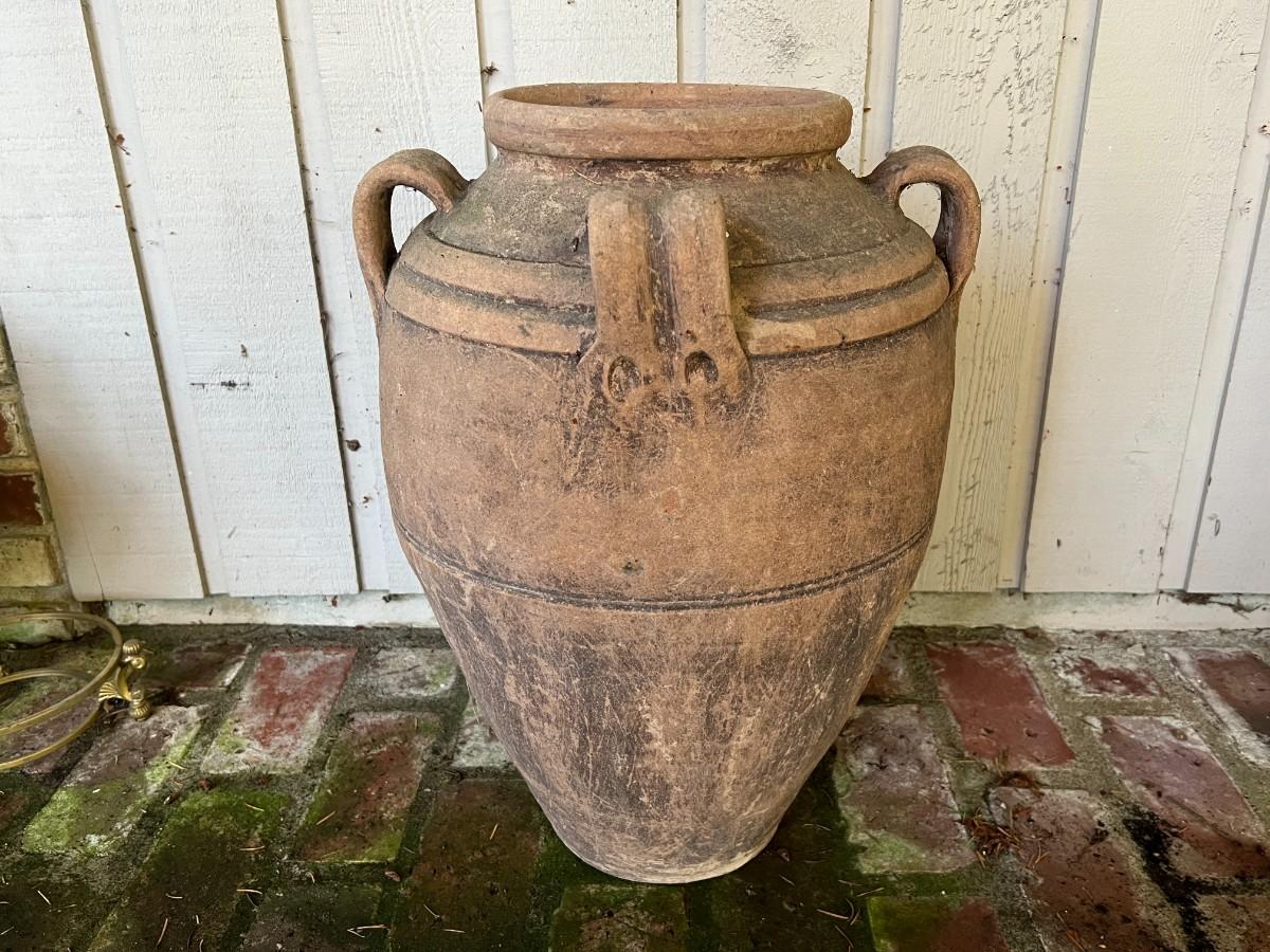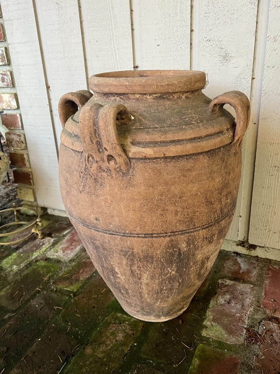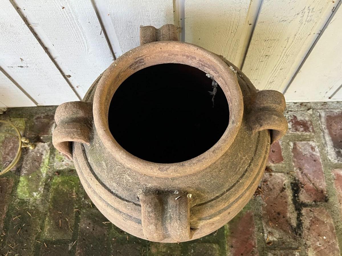 Beautiful Terracotta tone ceramic urn style planter with four decorative handles. Rustic or primitive style, appears hand made. Kept on a covered patio. In good condition, as shown.