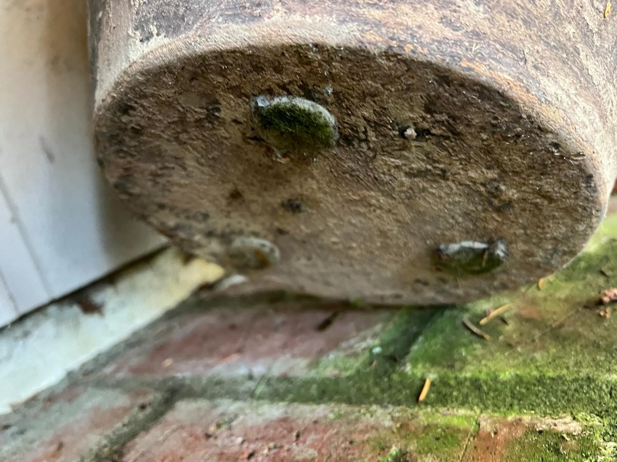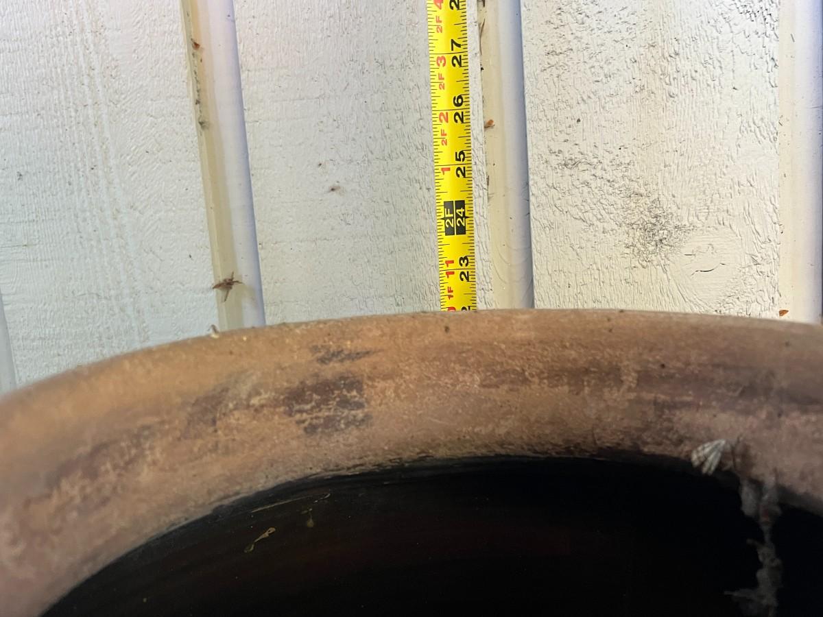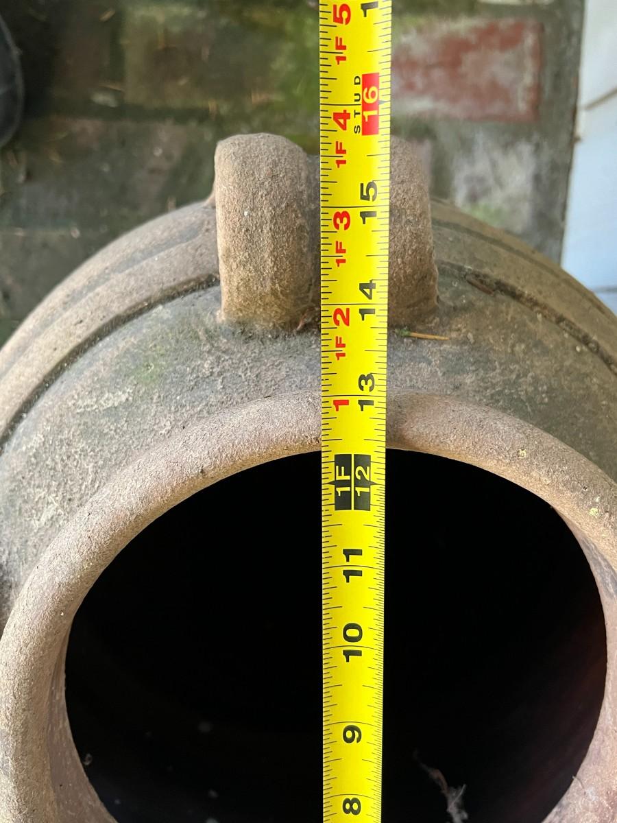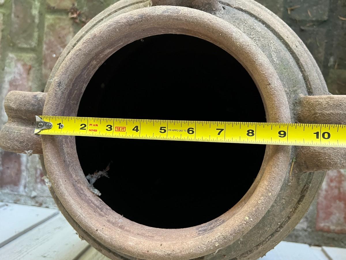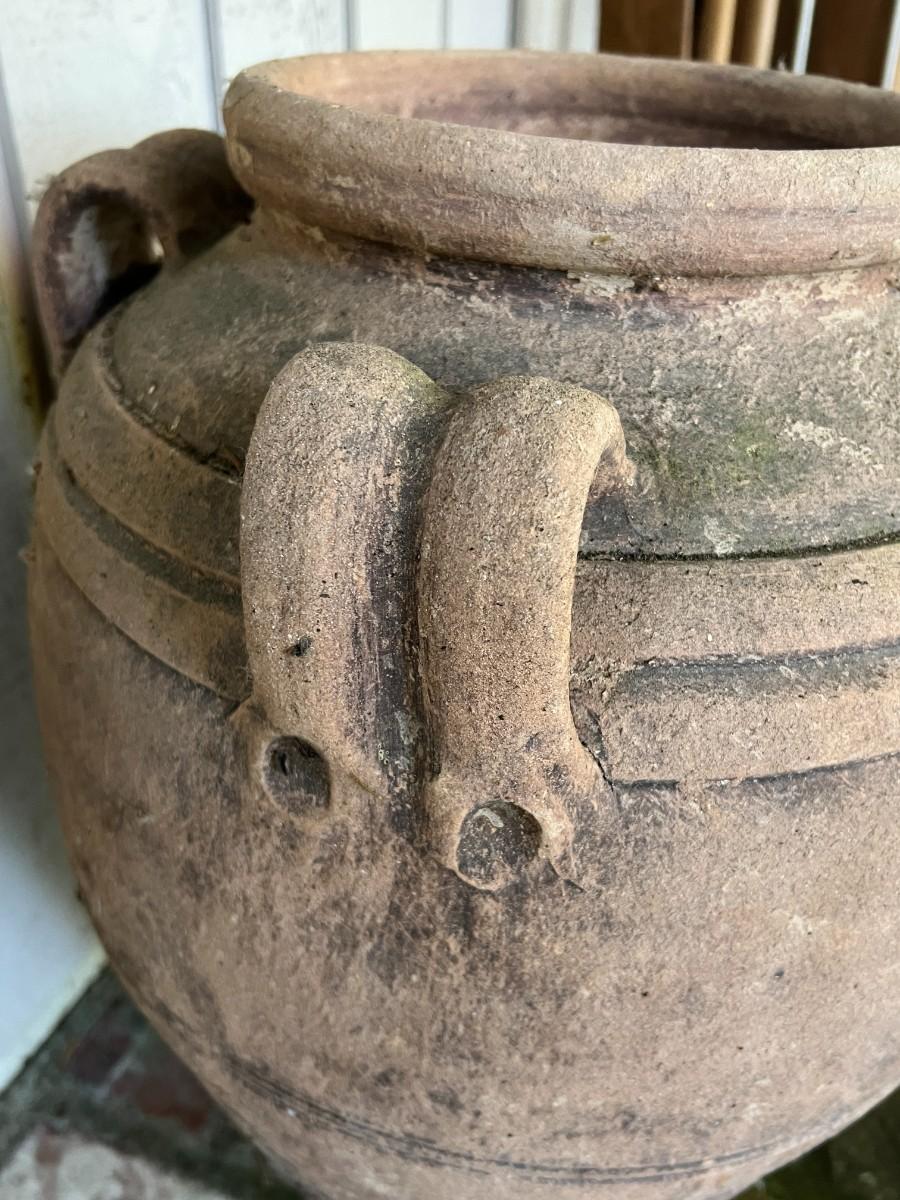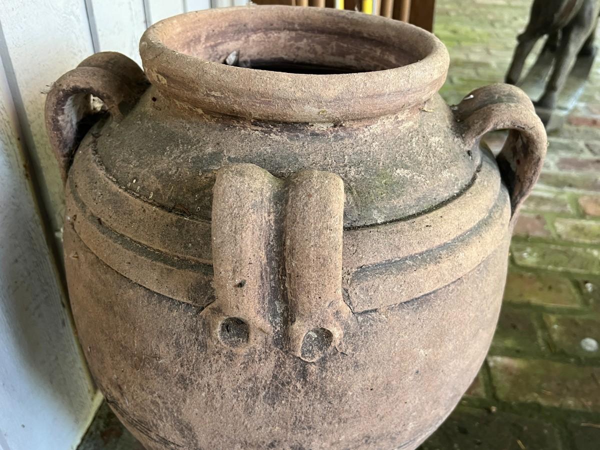 Beautiful Terracotta tone ceramic urn style planter with four decorative handles. Rustic or primitive style, appears hand made. Kept on a covered patio. In good condition, as shown.