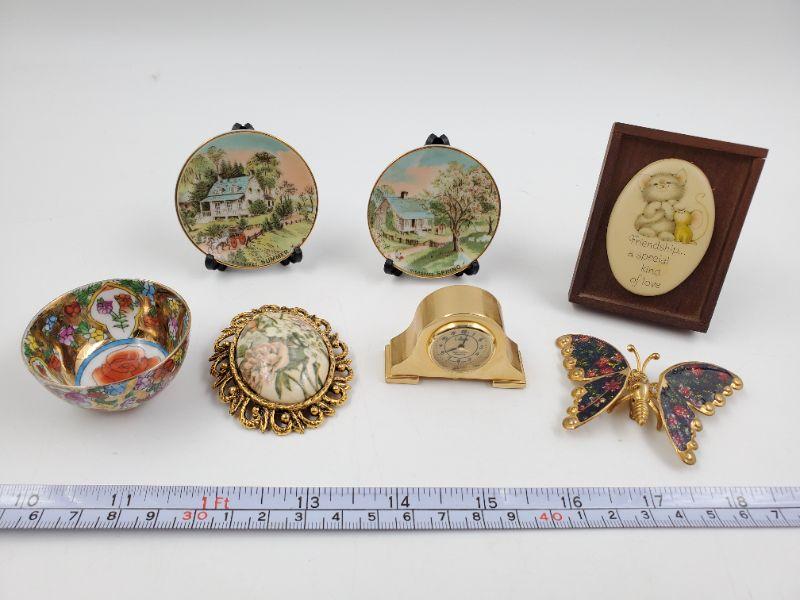 Pins, plates, a clock (untested), tiny bowl and a wooden framed picture. All good condition.