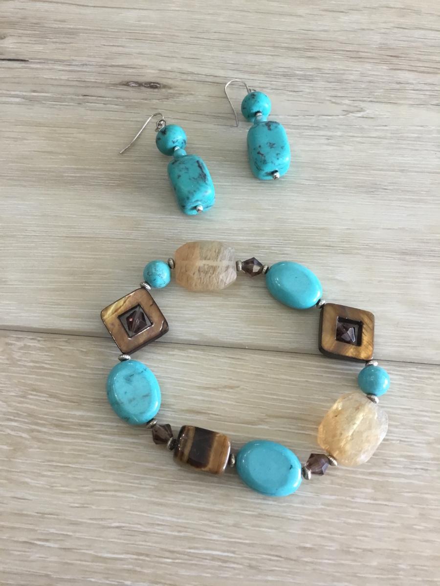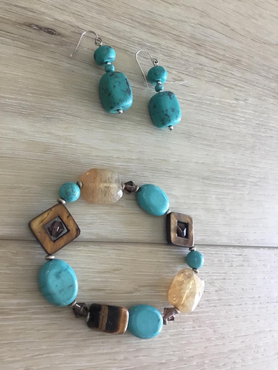 Beautiful turquoise dangle drop earrings with turquoise Tiger’s eye, other precious stone stretchy bracelet set