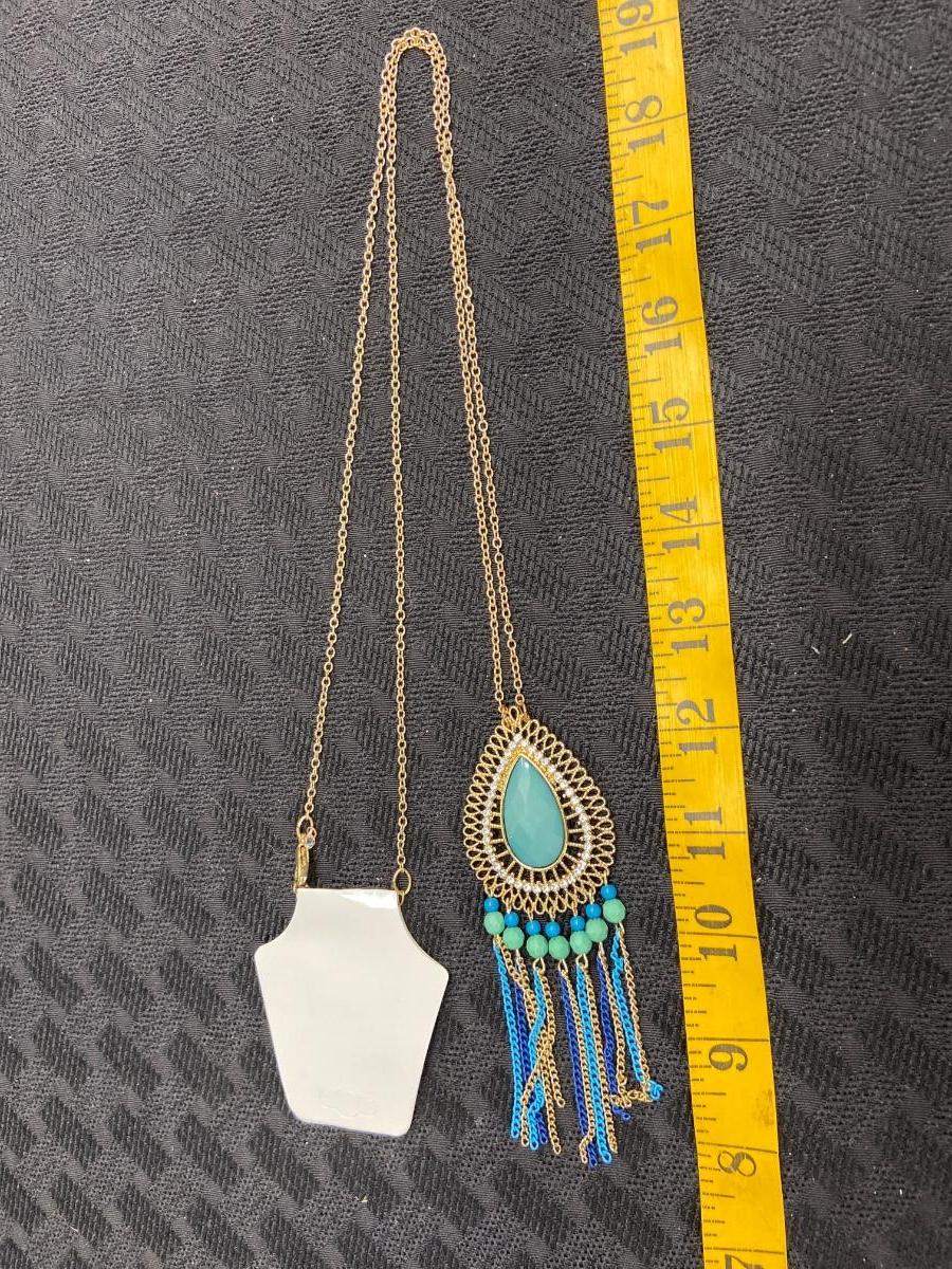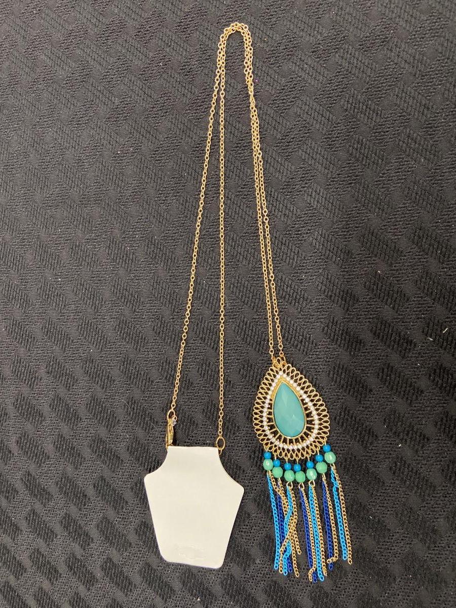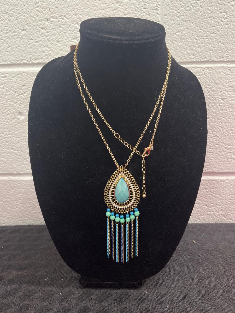 Beautiful gold tone necklace with turquoise faux stones and rhinestones