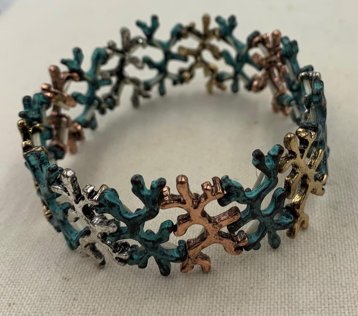 This is a fantastic Bracelet with a unique design. Stretchy to fit a range of sizes. Colors are turquoise, copper, and silver. Measures 2.5” in diameter. Such a fun piece!