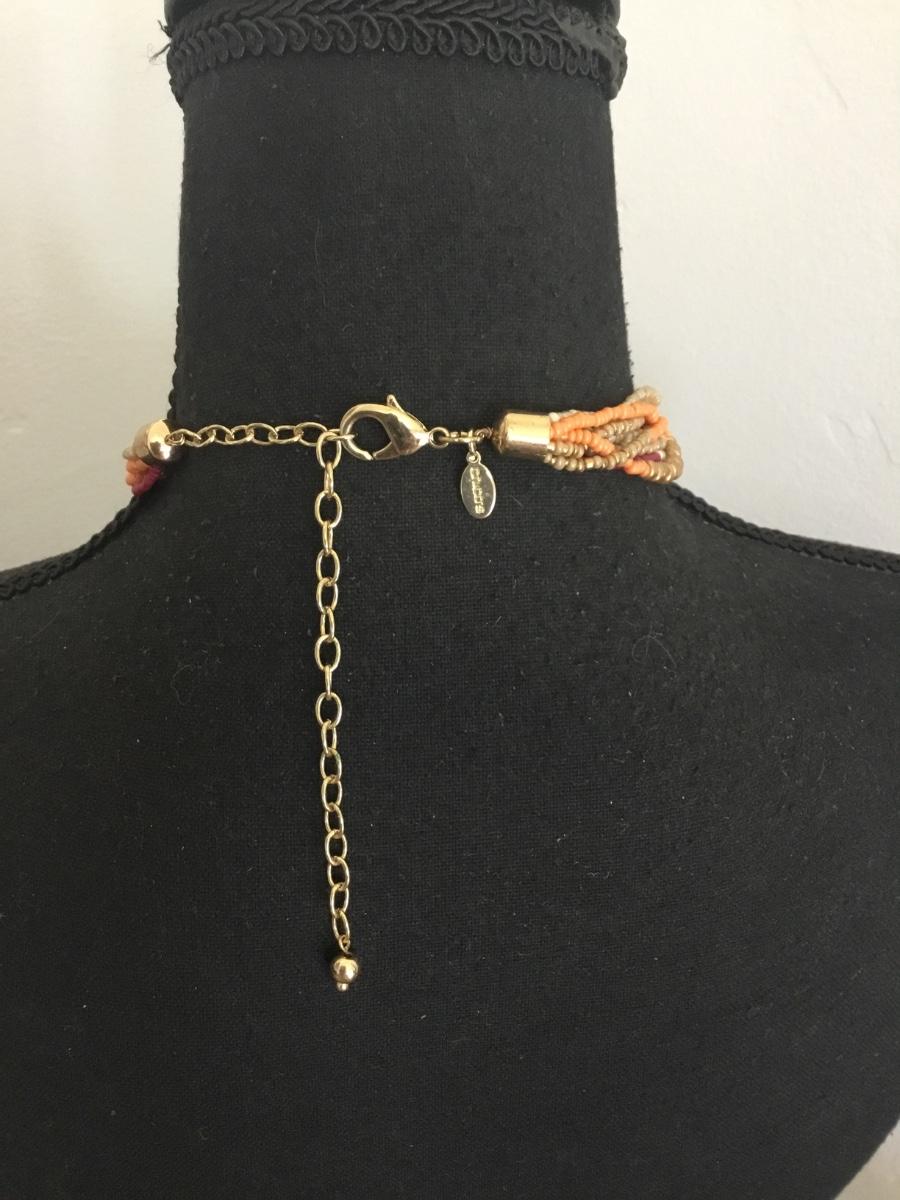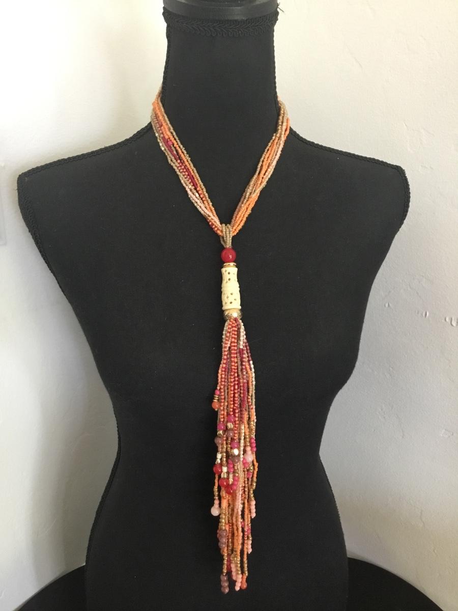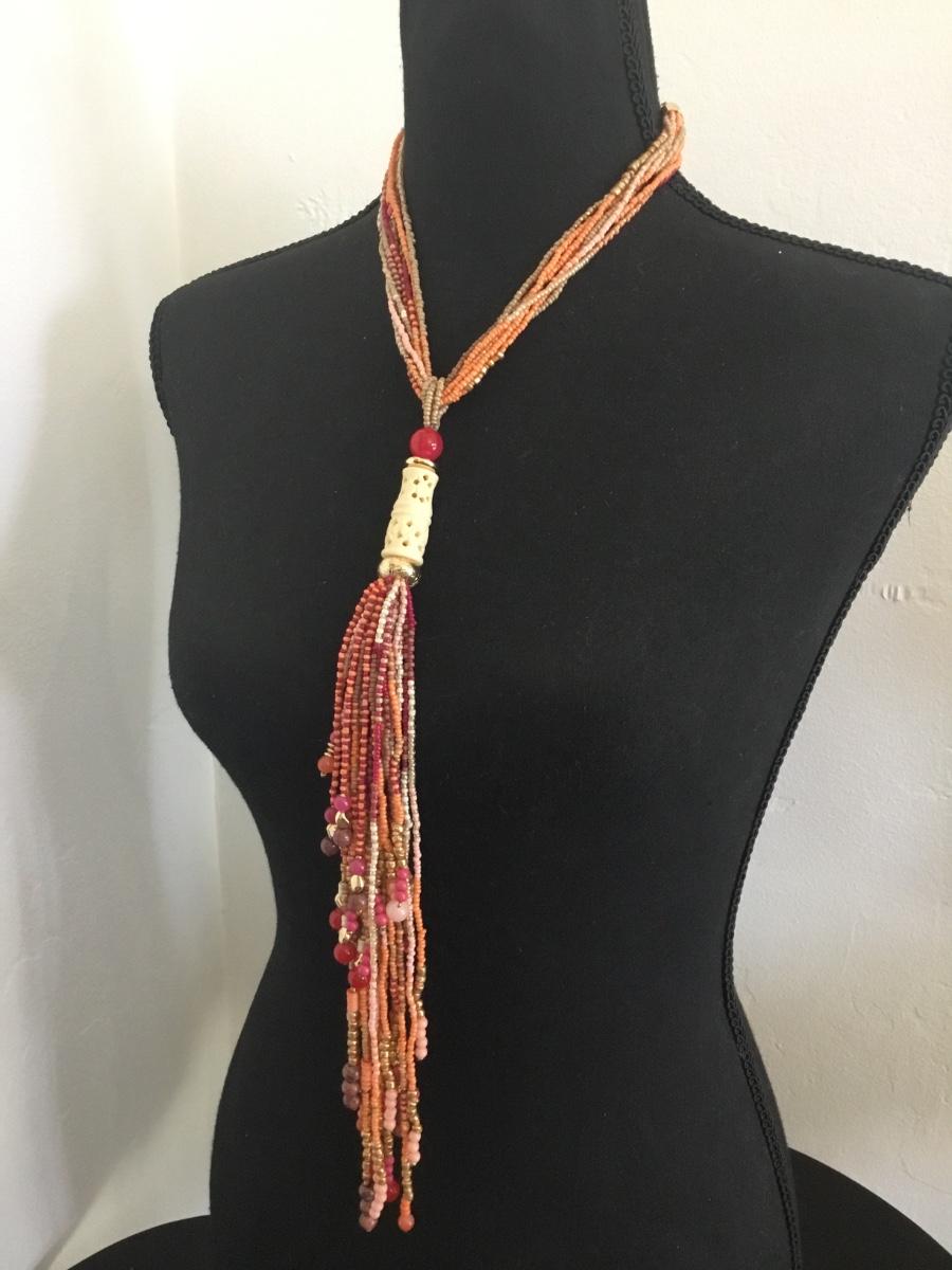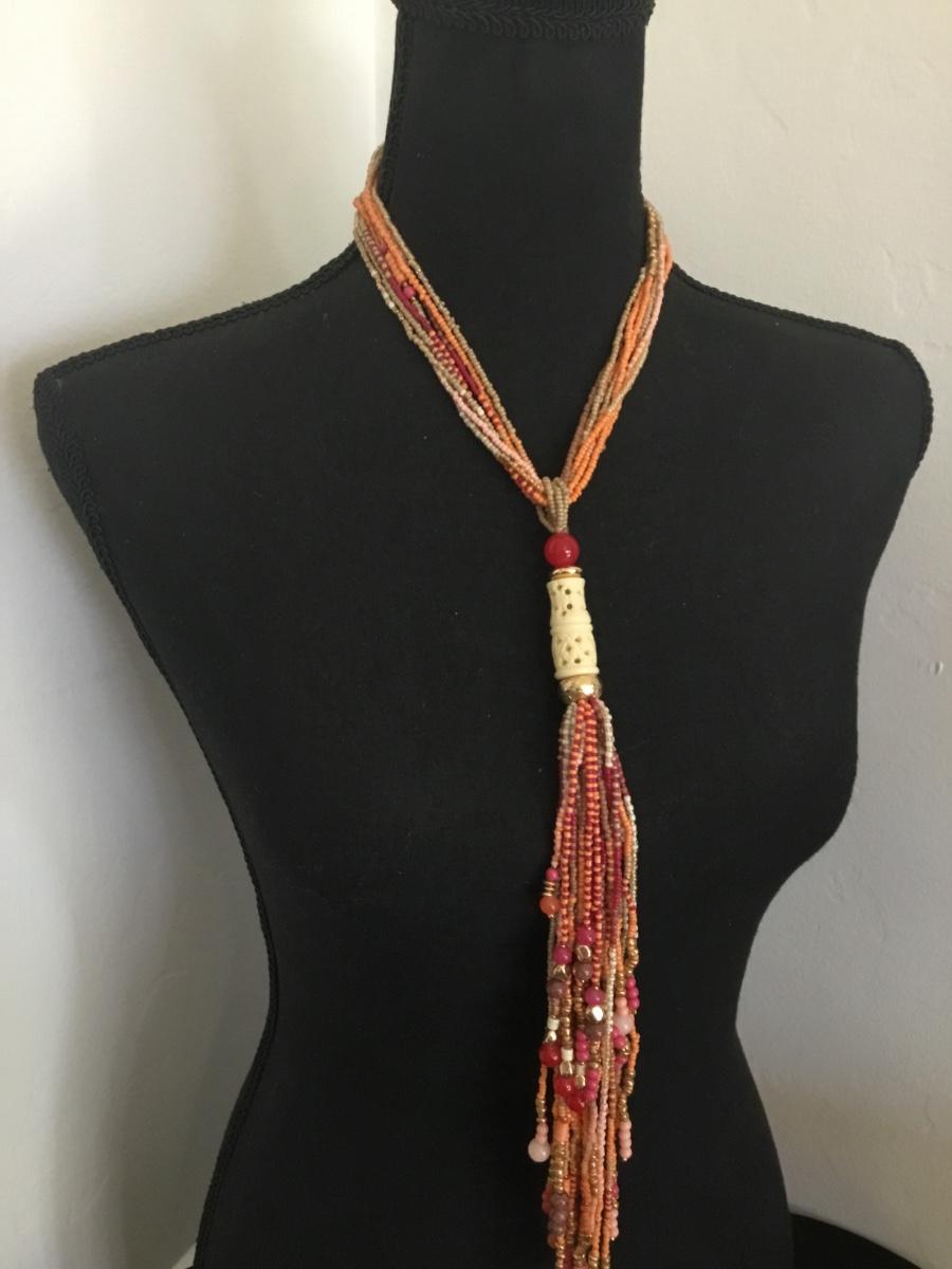 Beautiful very nice gold tone Chicos, multi colored glass, bead, faux bone, tassel statement, necklace