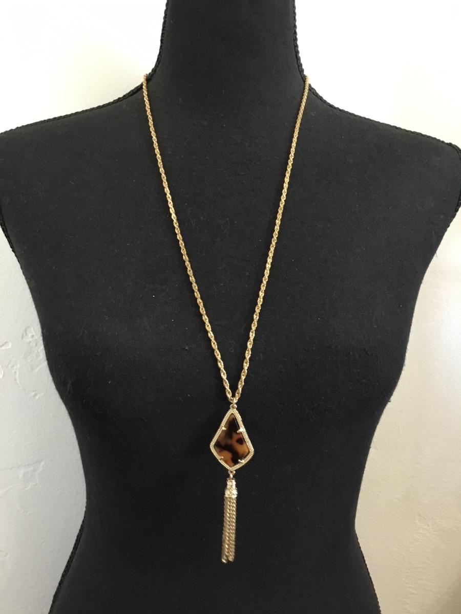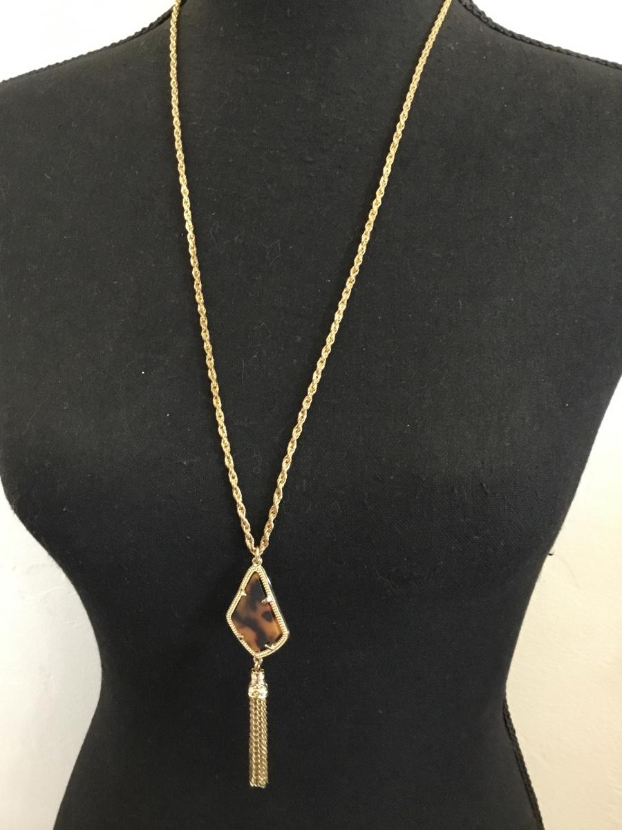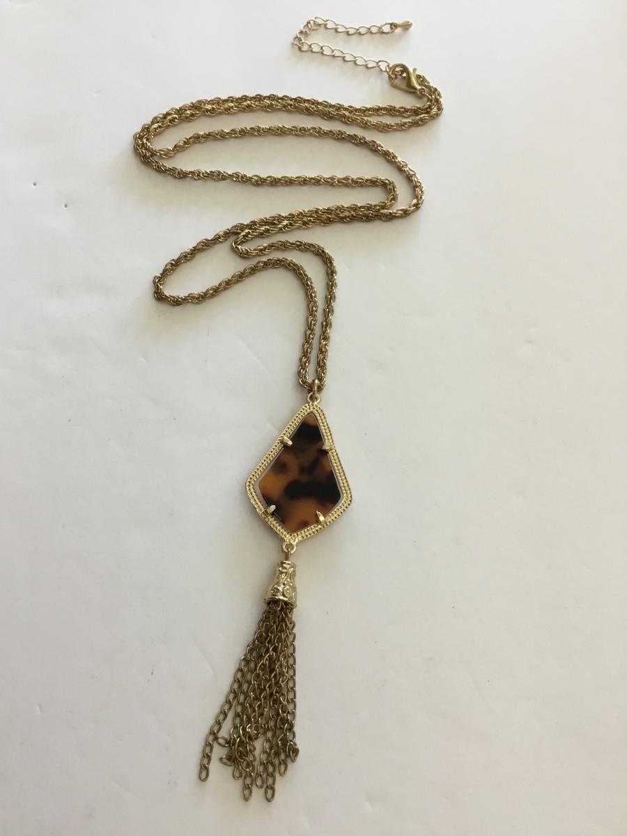 Beautiful very nice gold toned faux, tortoiseshell, tassel, long statement, necklace