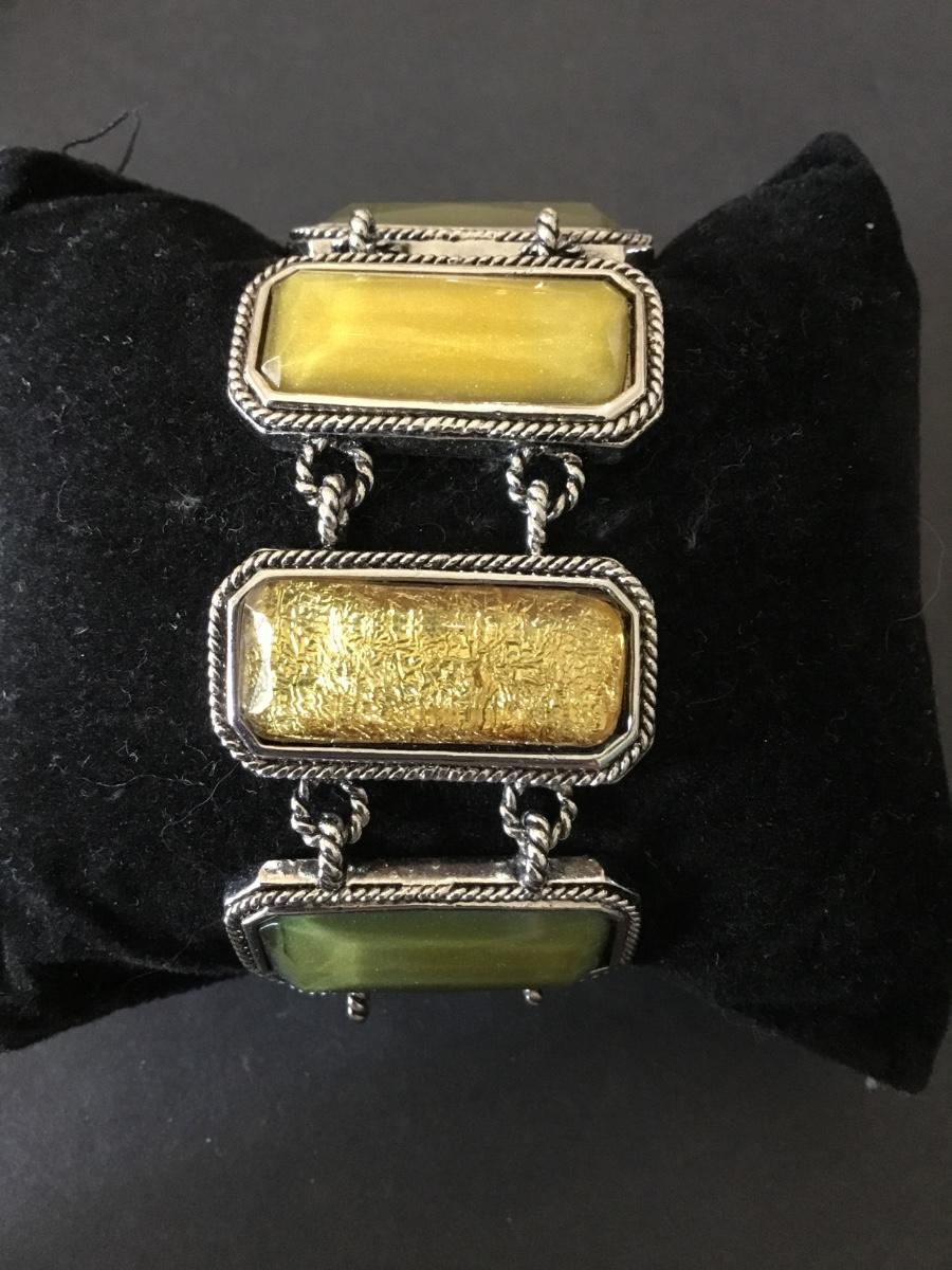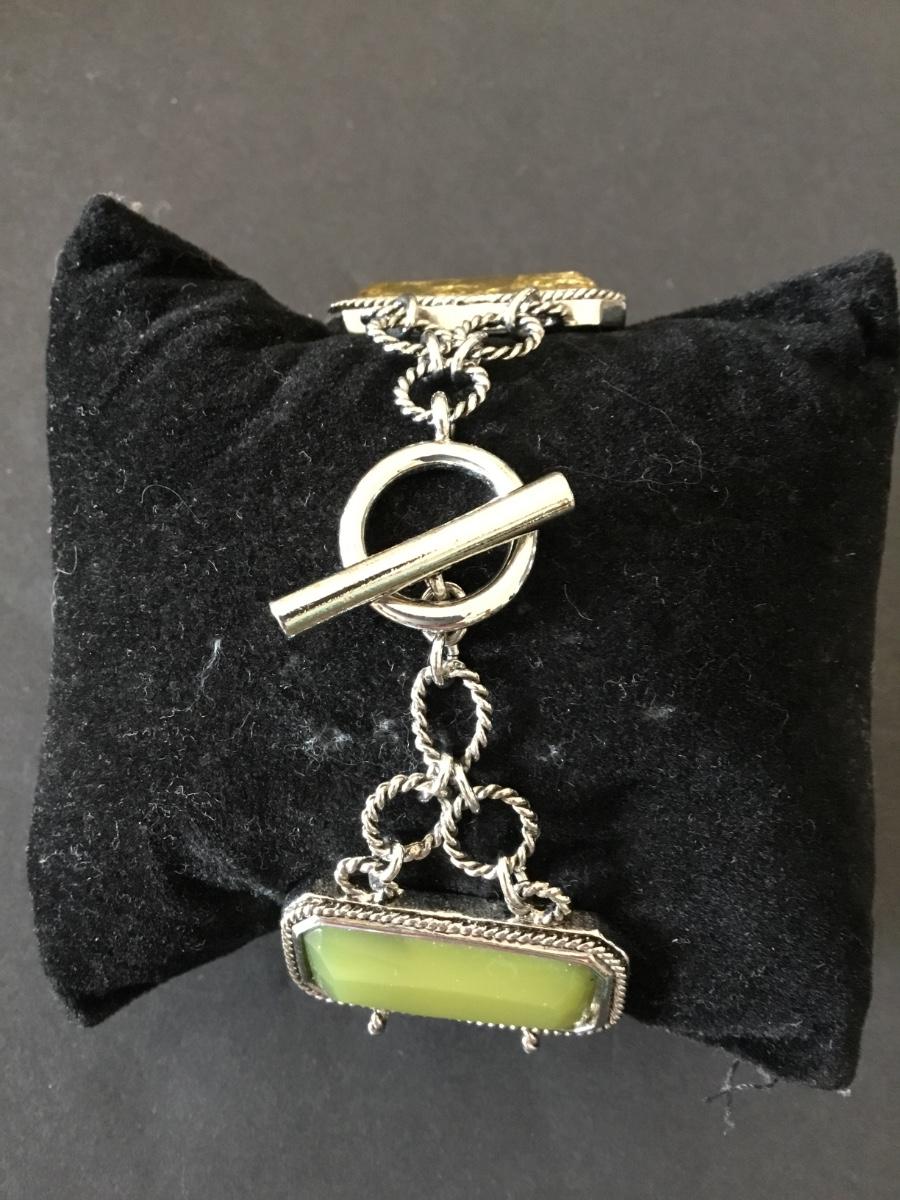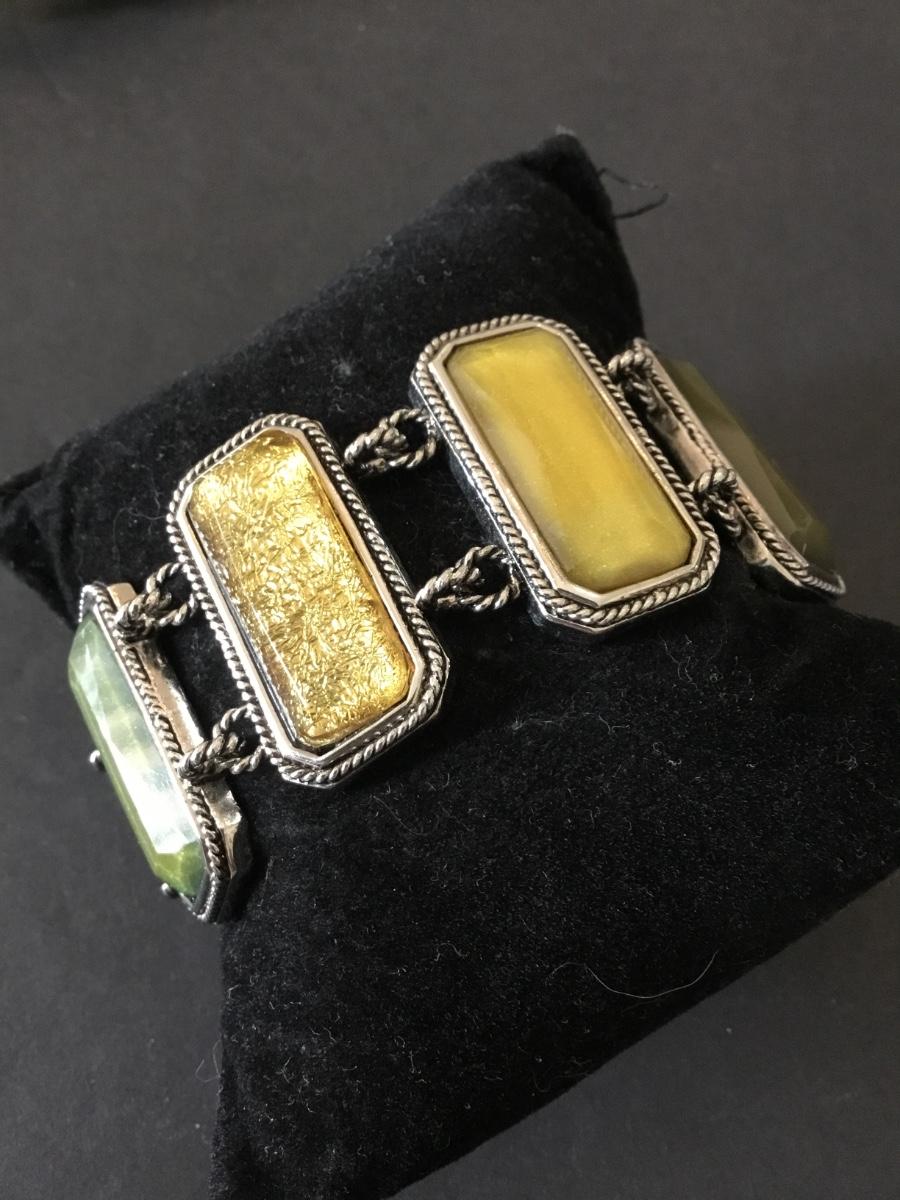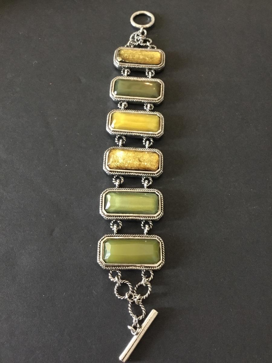 Beautiful very nice silver tone, green golden yellow panel toggle bracelet very nice
