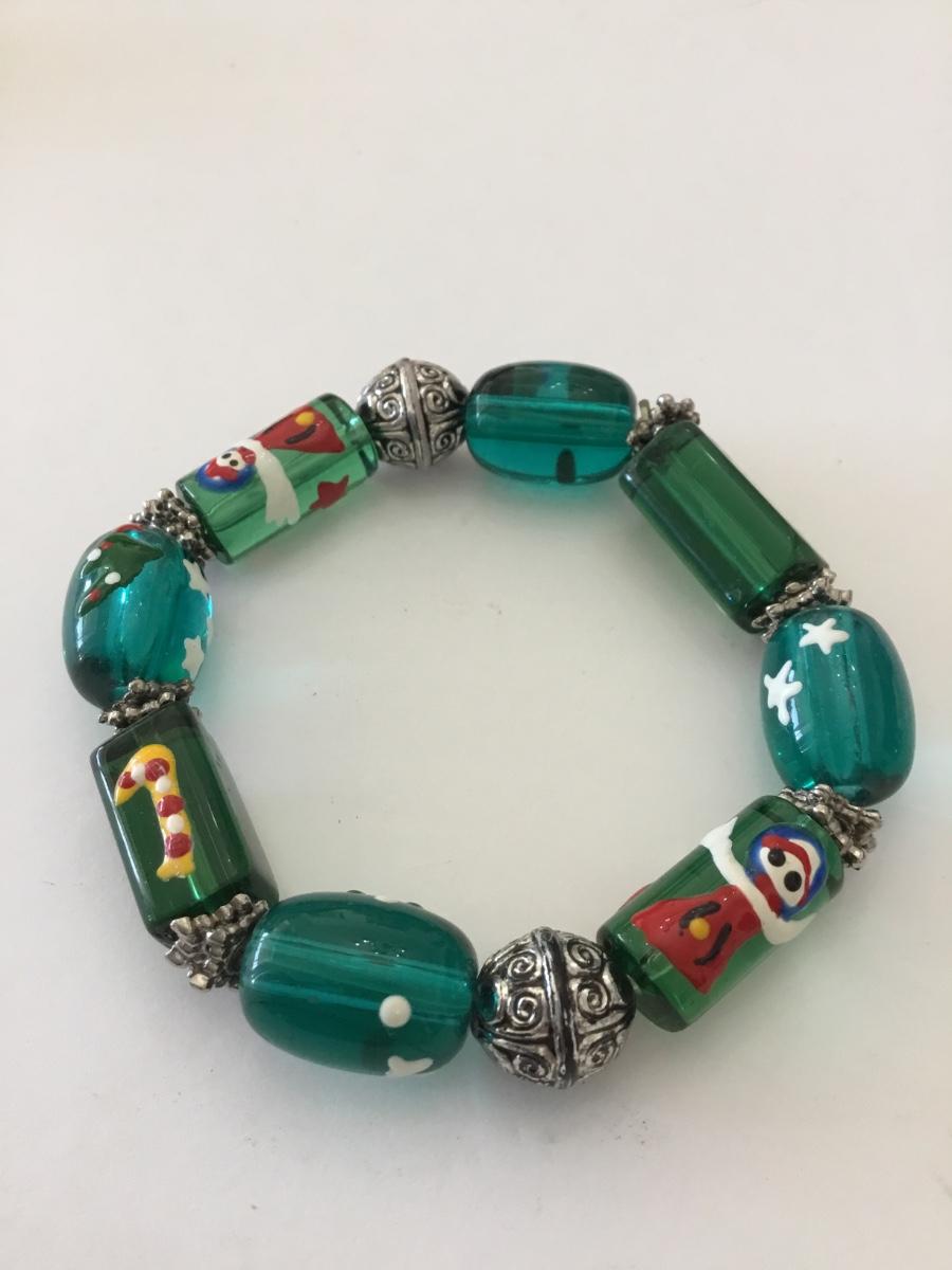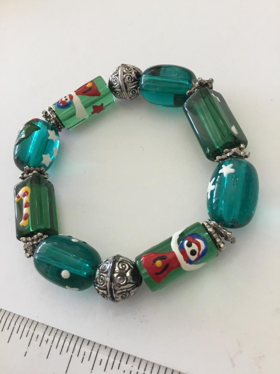 Beautiful very nice silver toned green glass Christmas bead stretch bracelet