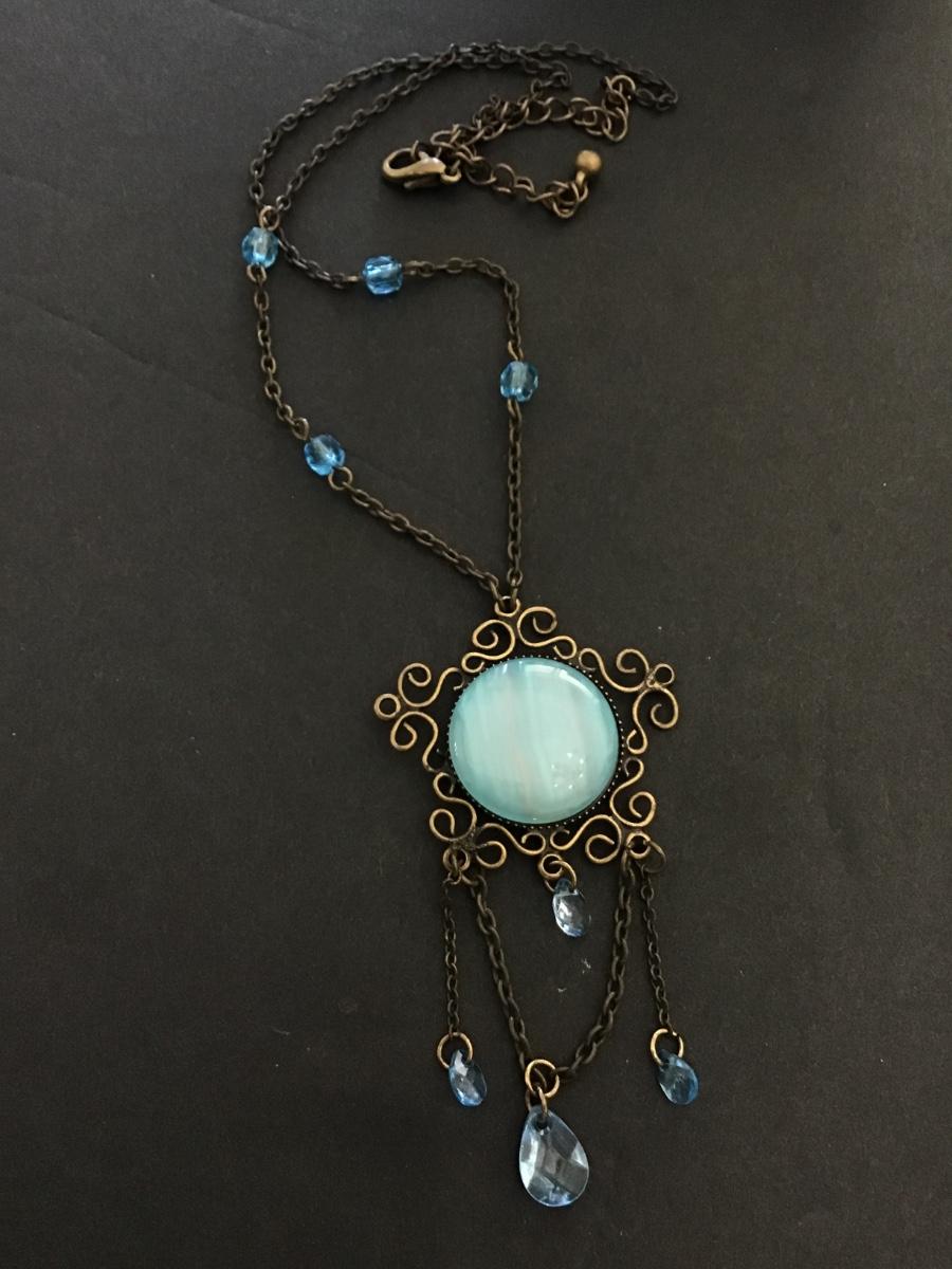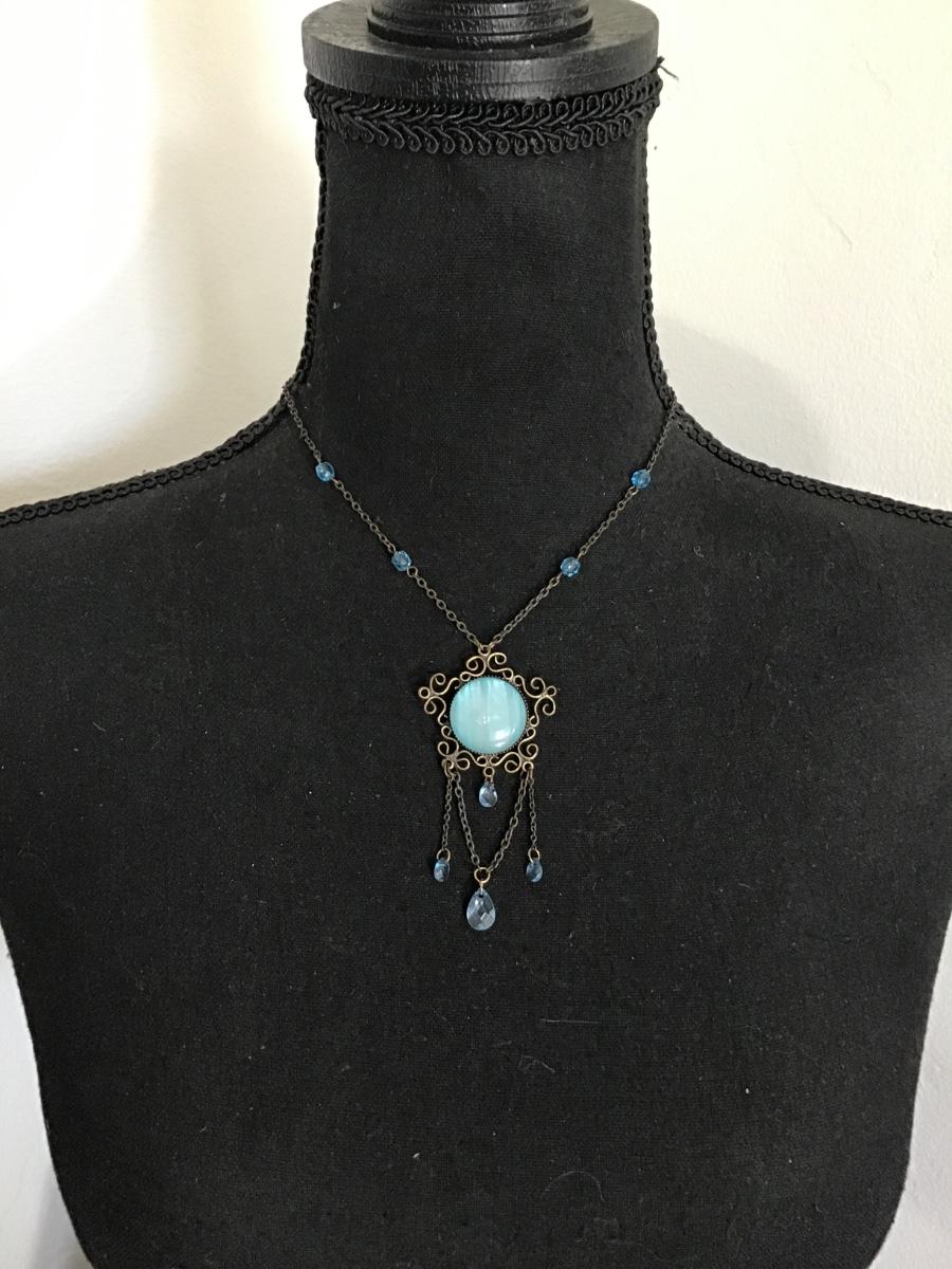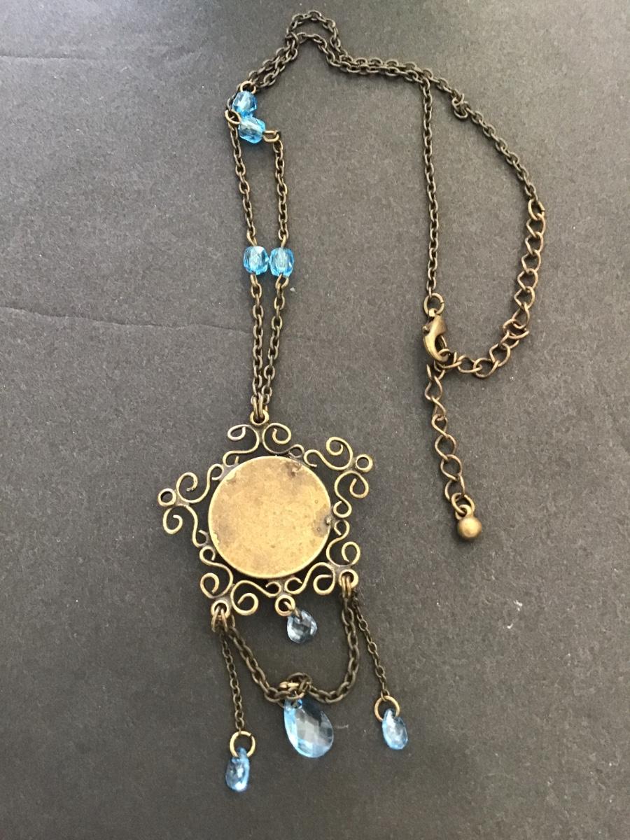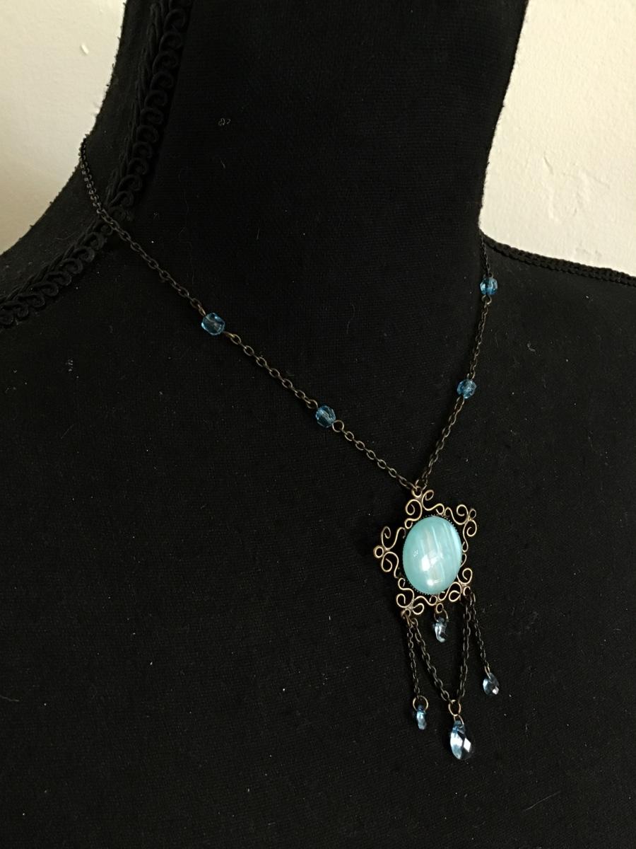 Beautiful, vintage, art, deco, bronze, toned, blue, crystal pendant, necklace, Art Deco style