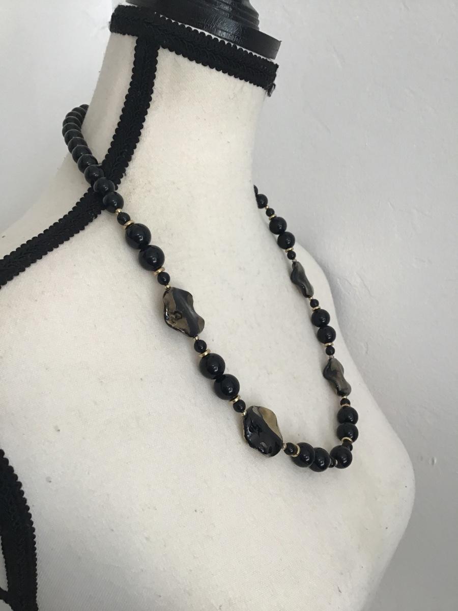 Beautiful vintage, black faceted graduated French glass necklace with gold tone spacers