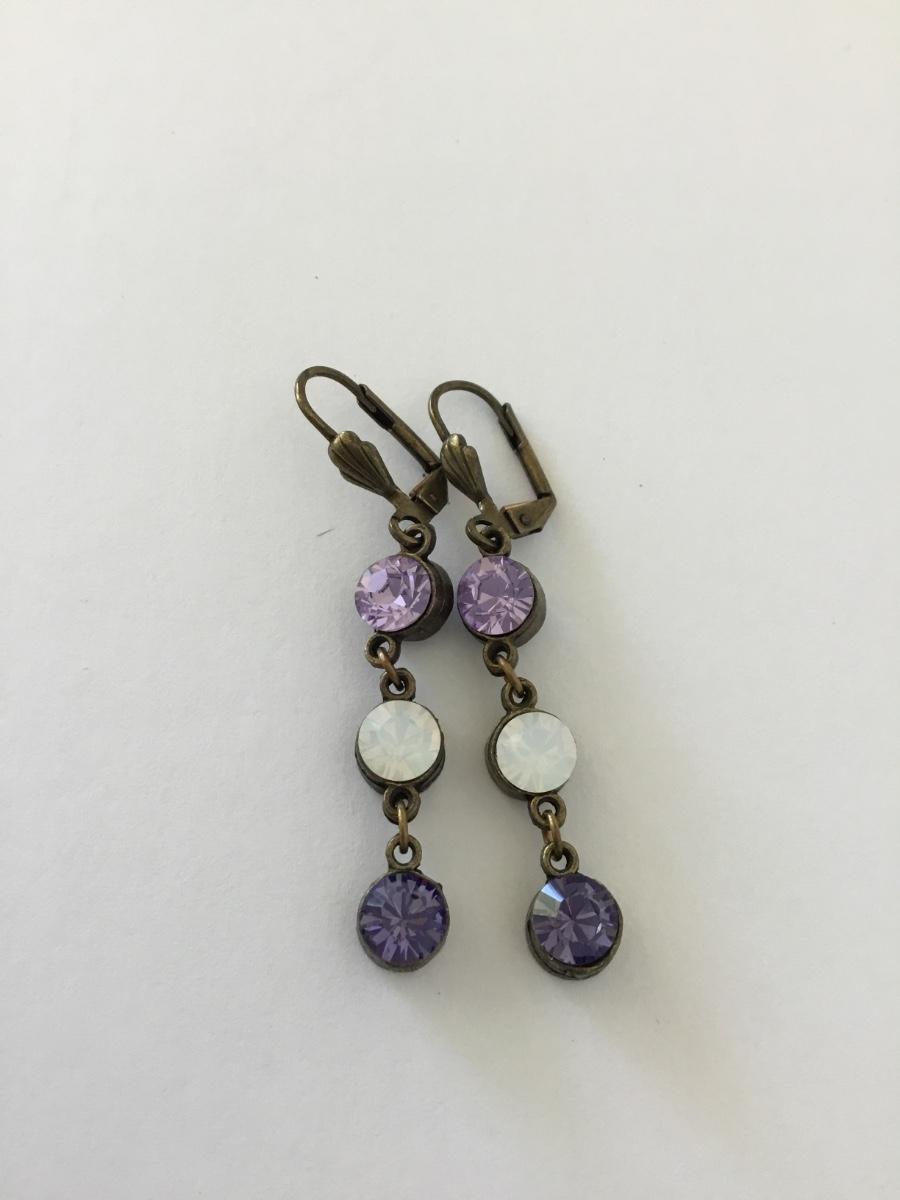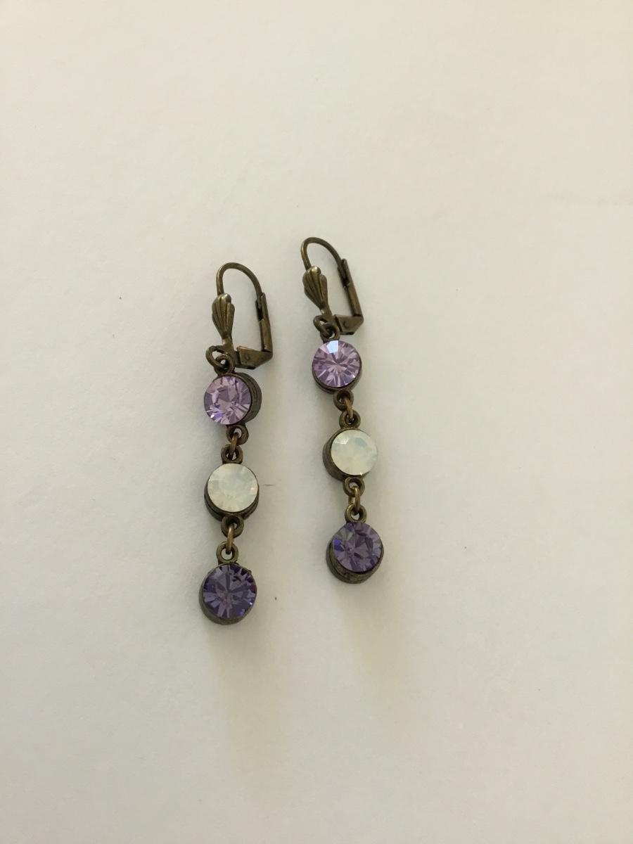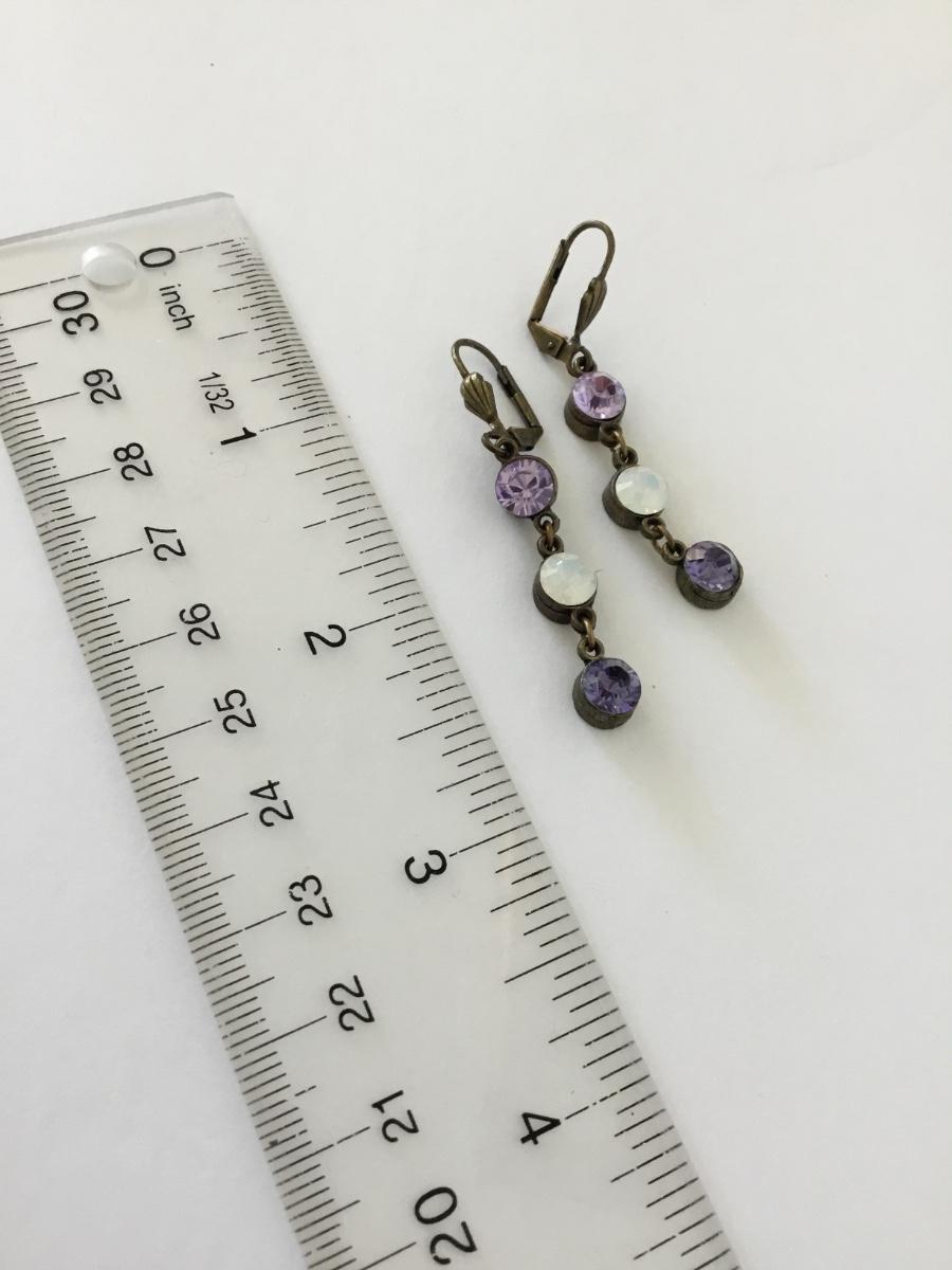 Beautiful, vintage, bronze, toned, crystal multicolored, purple rhinestone dingle earrings