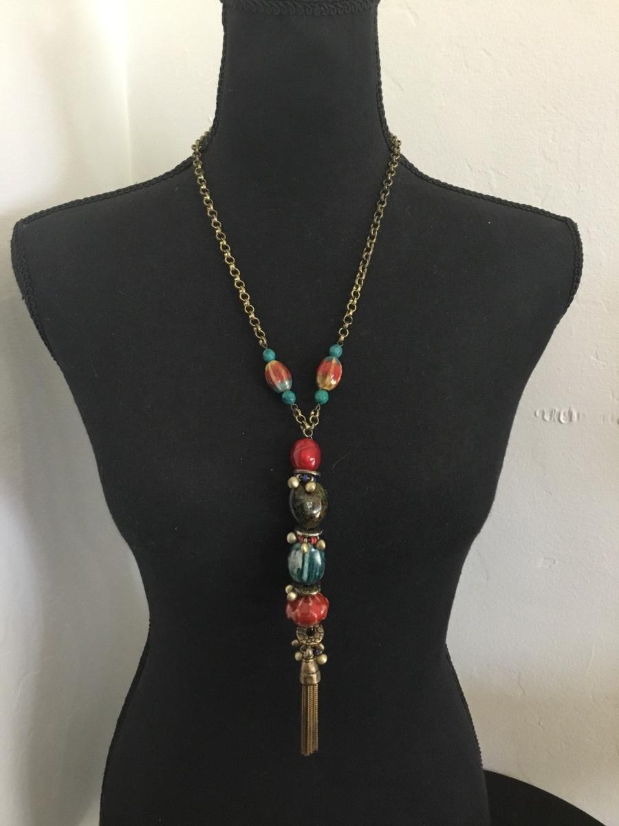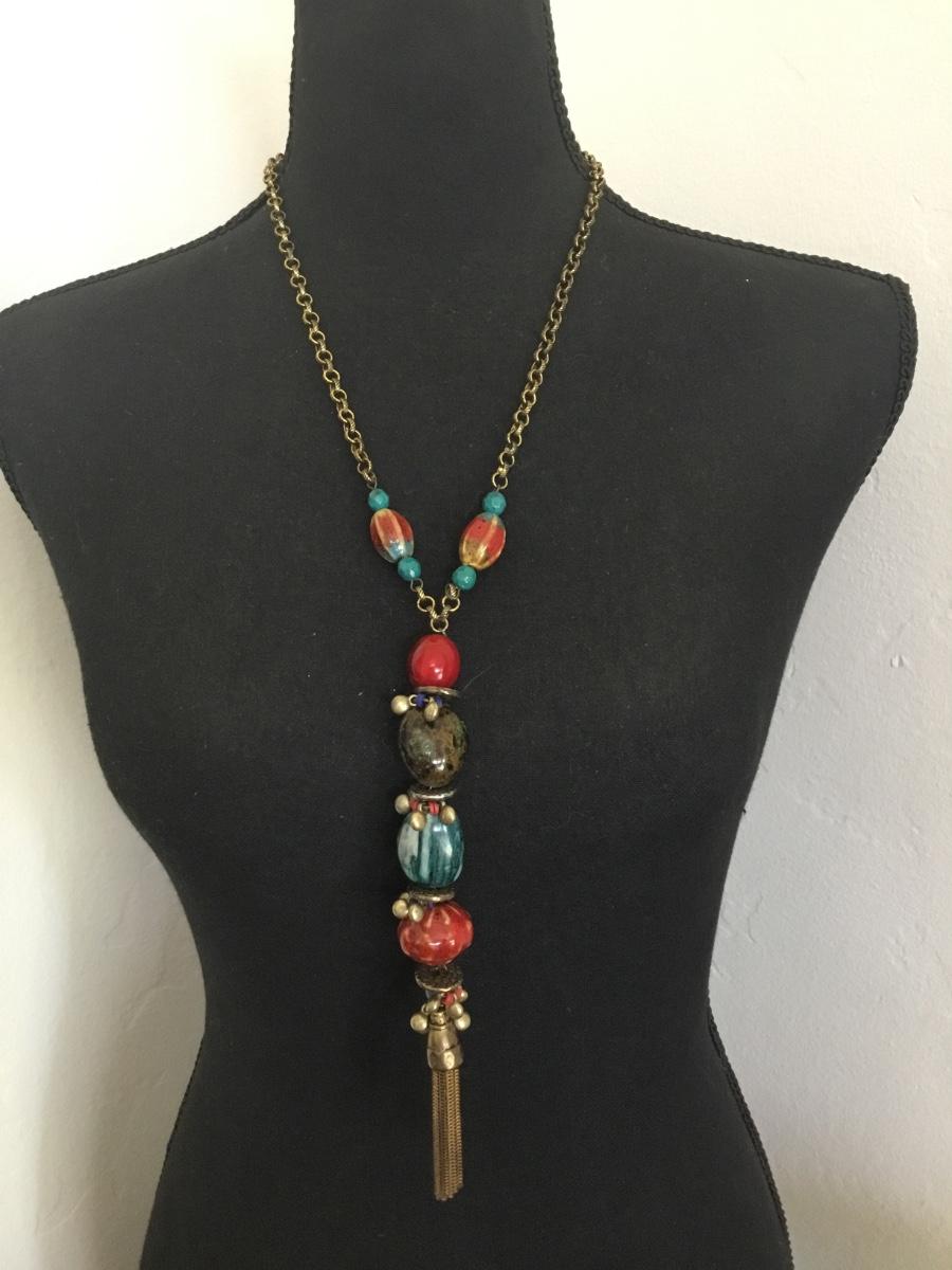 Beautiful, vintage, bronze, toned, multicolored, ceramic bead, tassel necklace