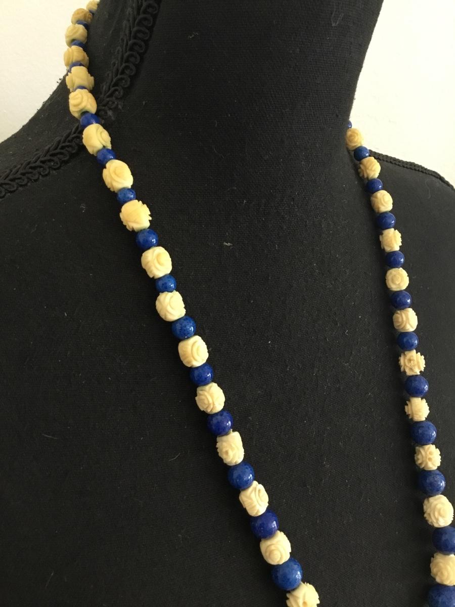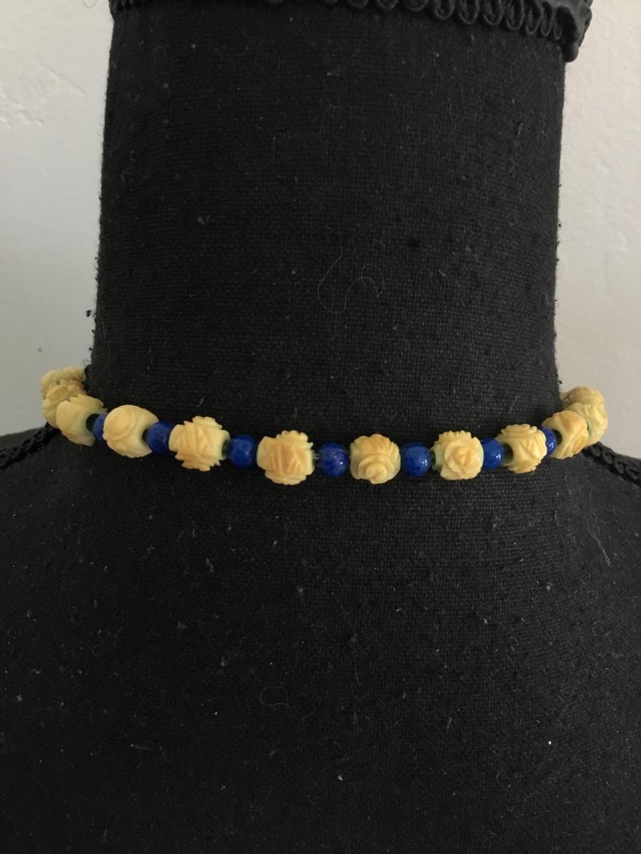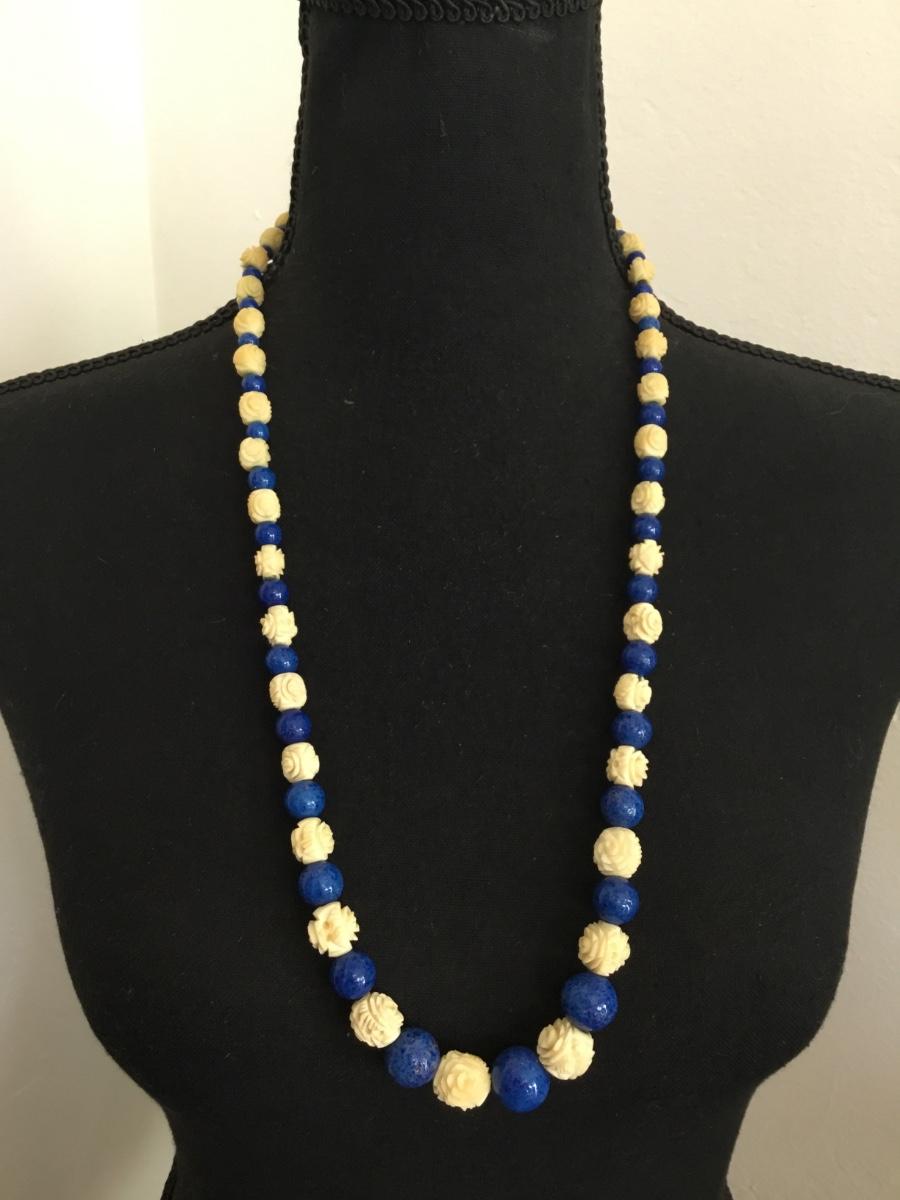 Beautiful, vintage, celluloid, rose bead, blue, ceramic bead necklace