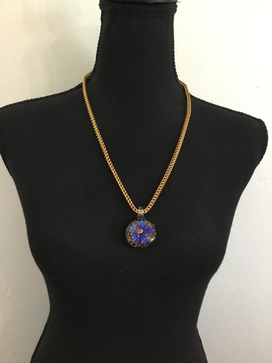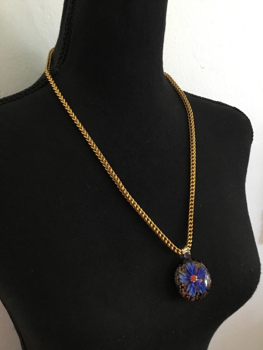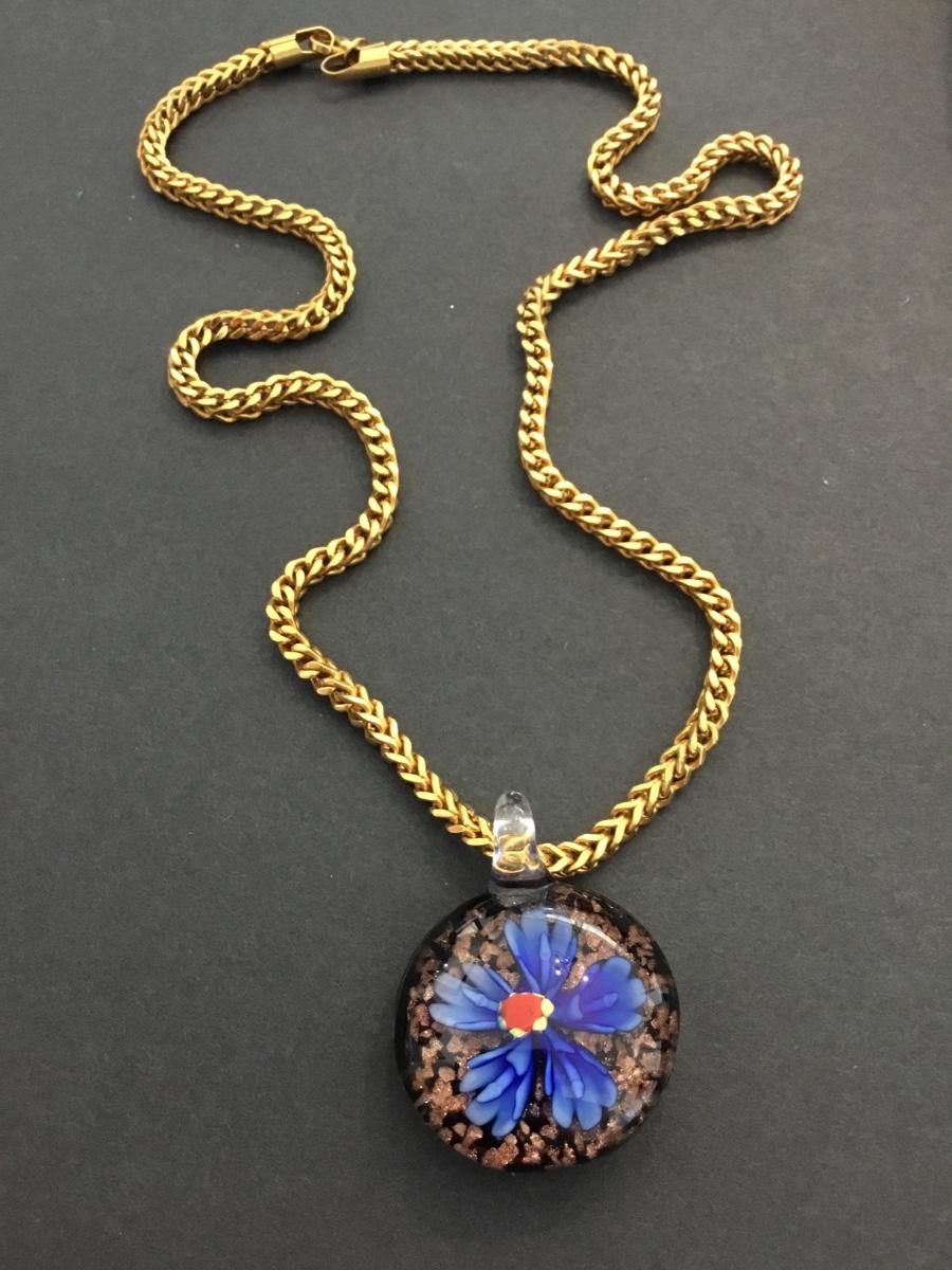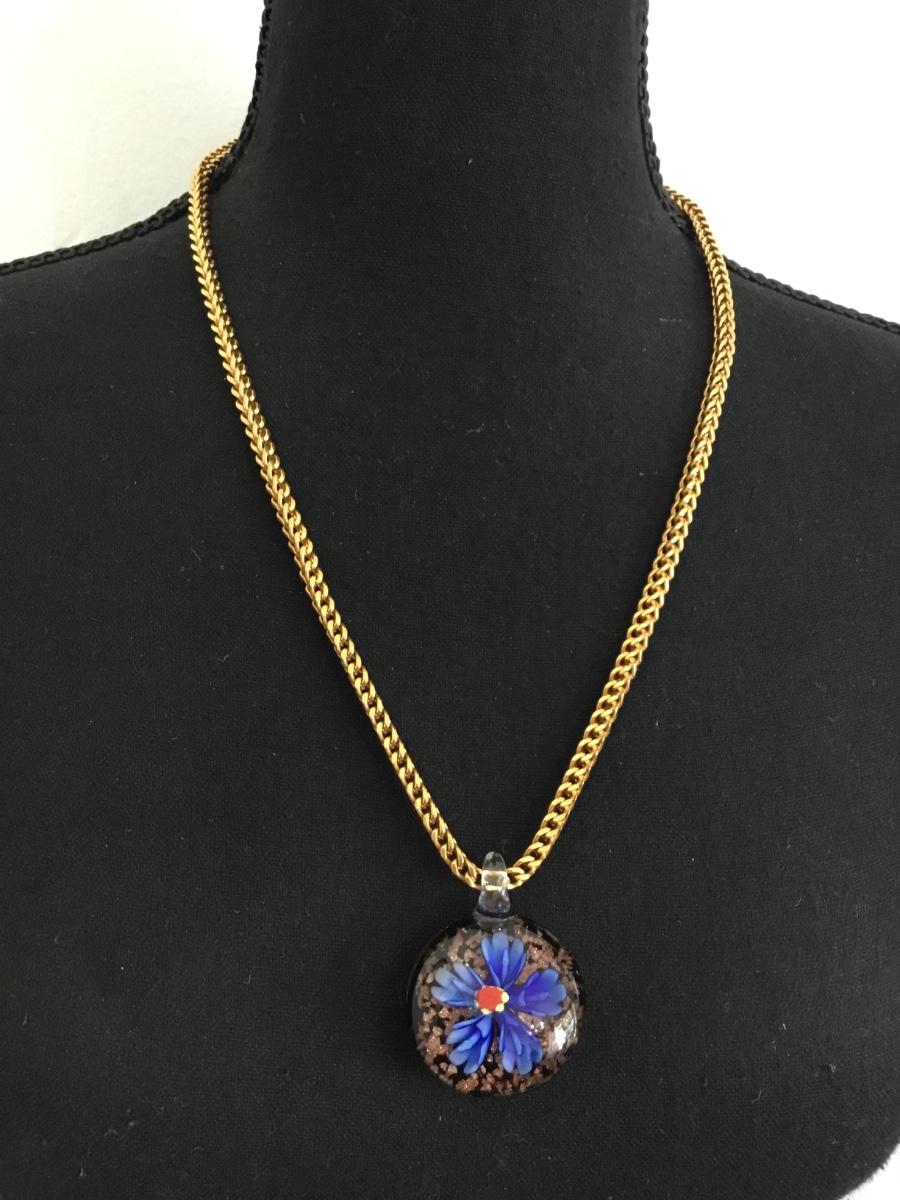 Beautiful, vintage, chunky gold tone, chain and glass flower pendant necklace
