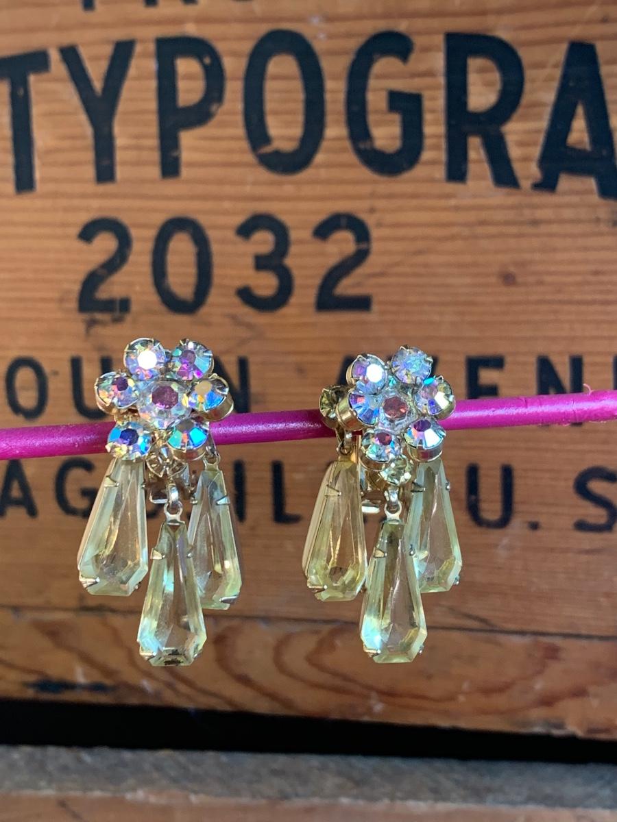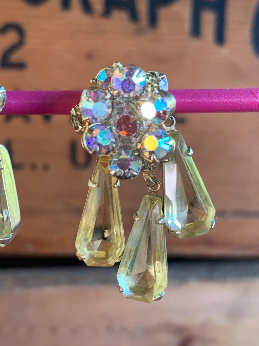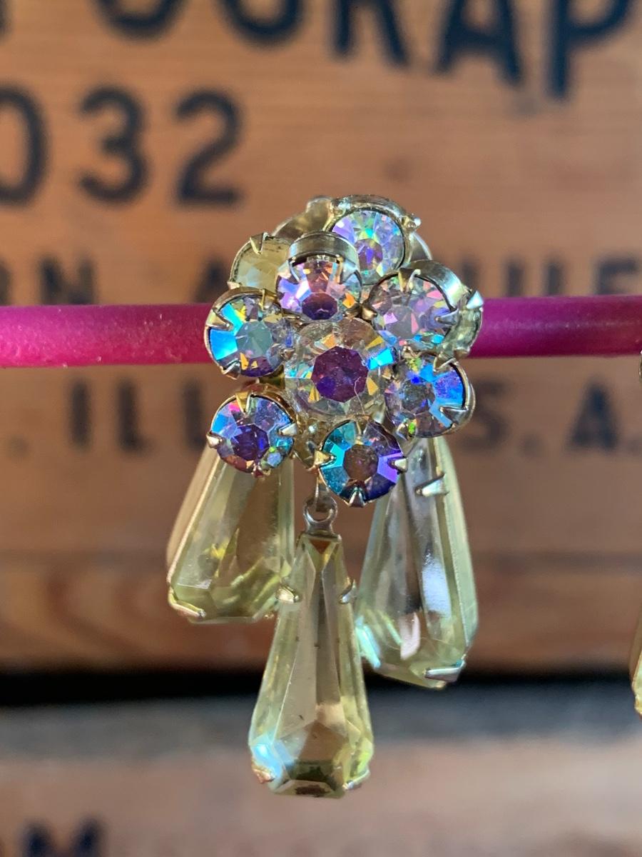 Clip on iridescent rhinestone flower with tear drop dangles, well made, gold metal backing. Designer elements