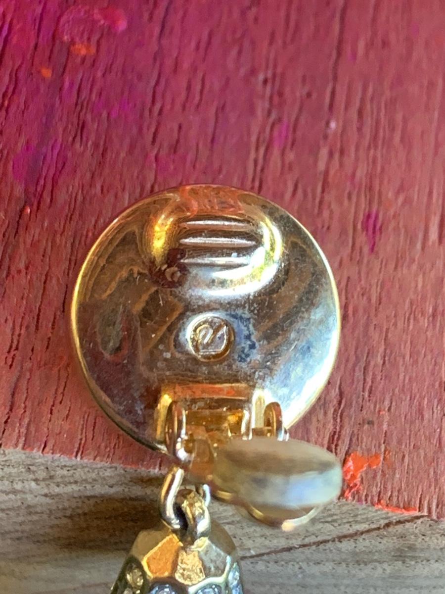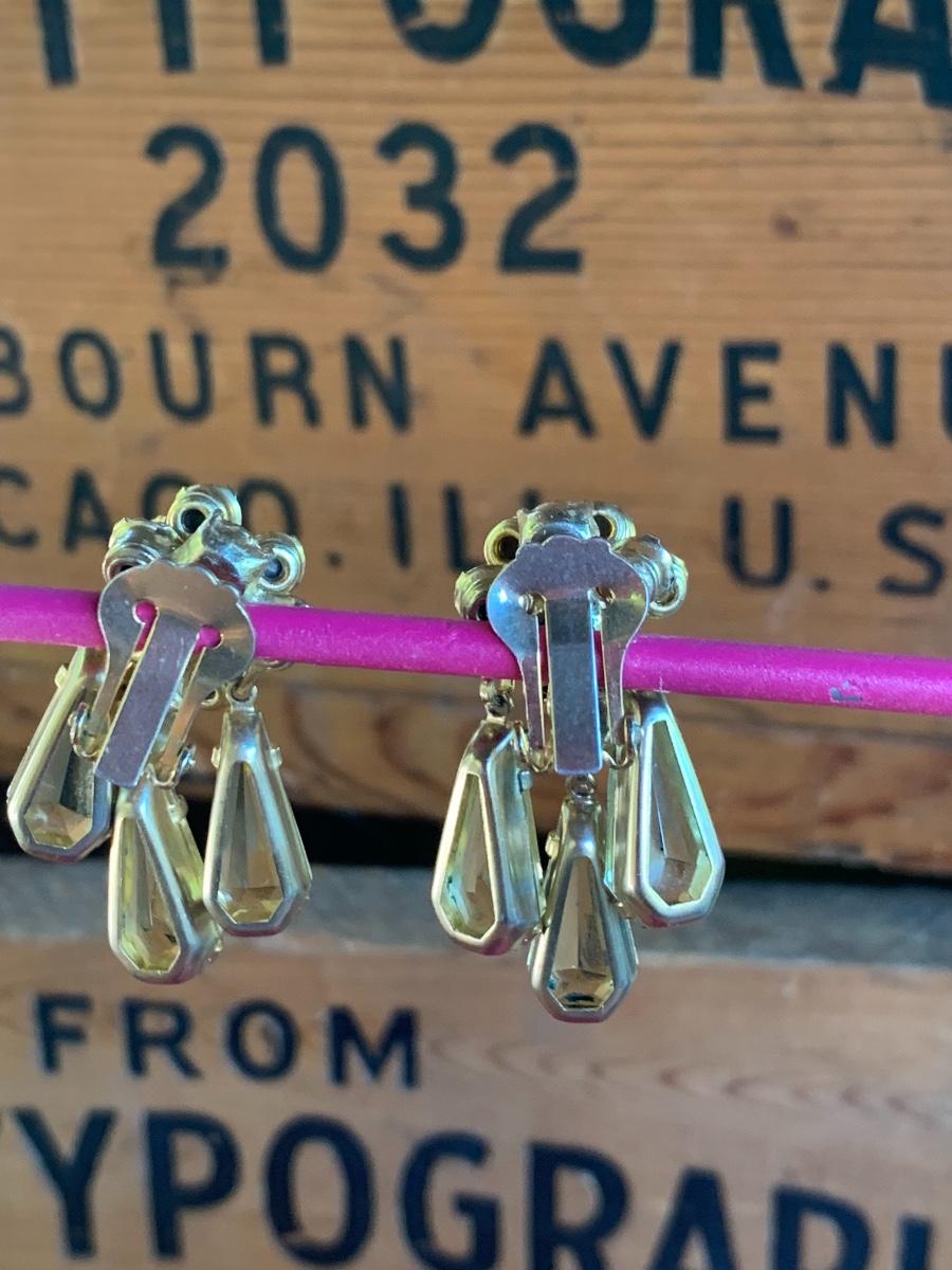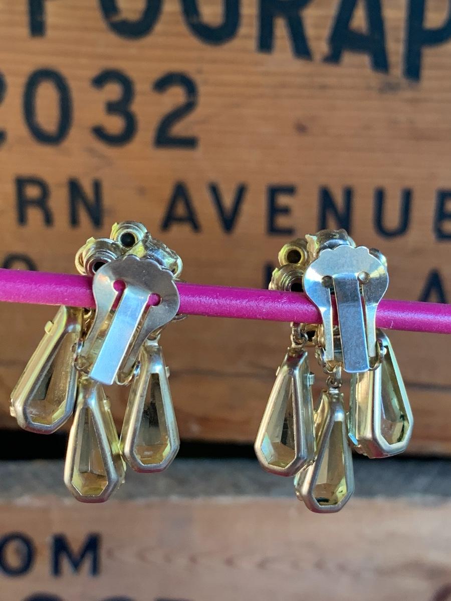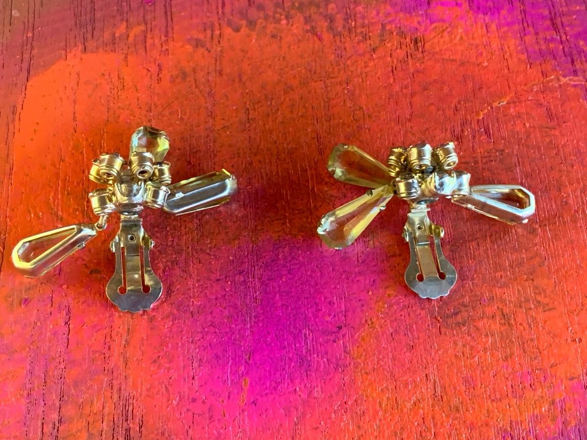 Clip on iridescent rhinestone flower with tear drop dangles, well made, gold metal backing. Designer elements