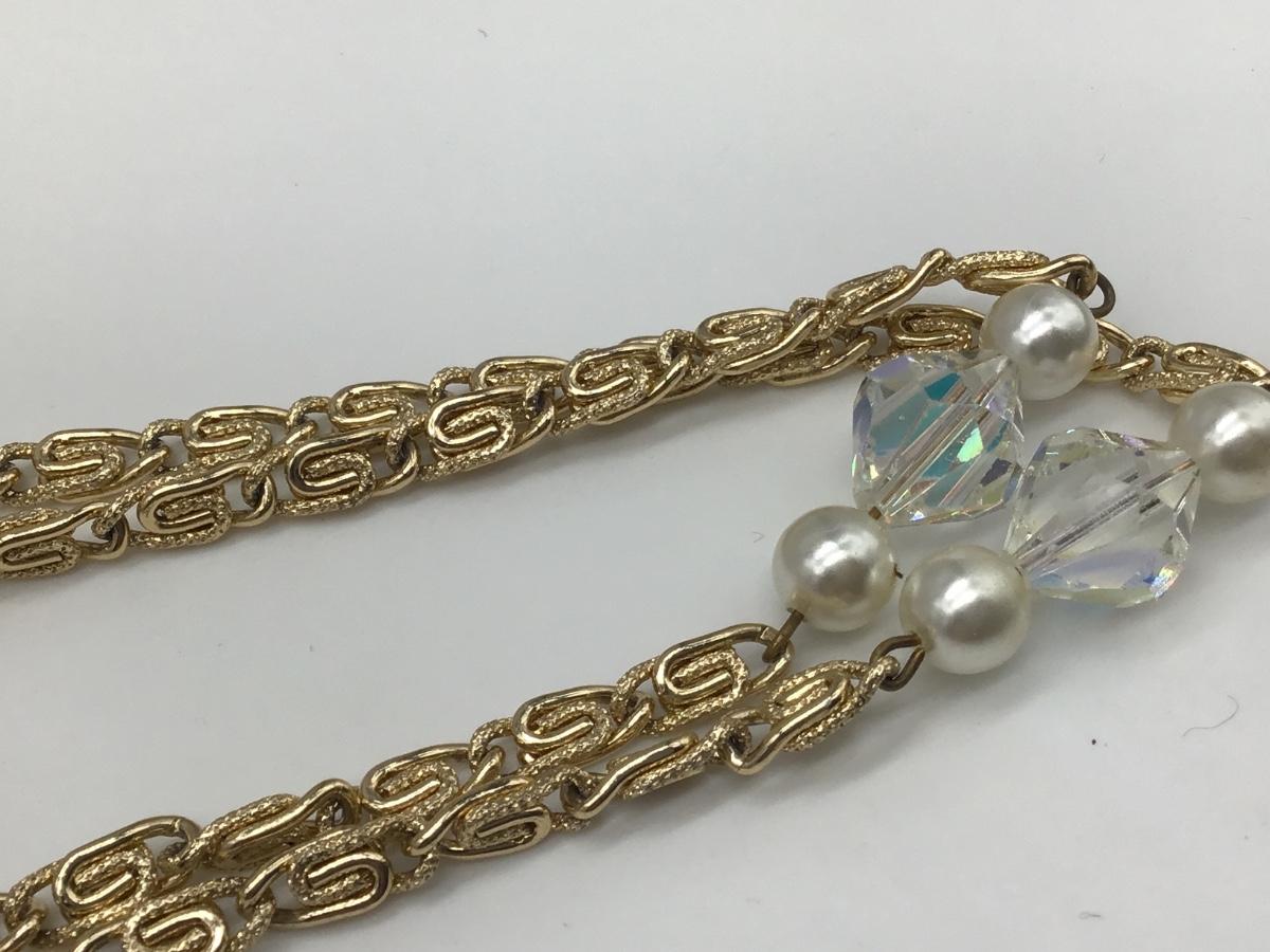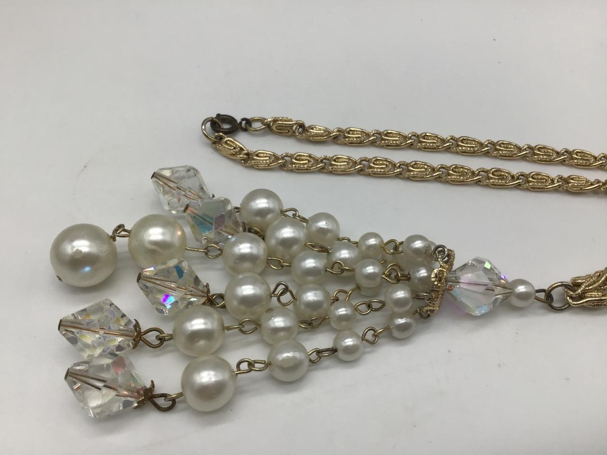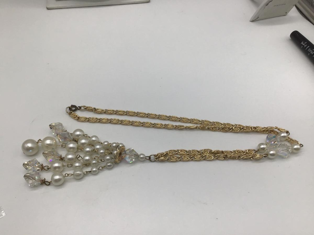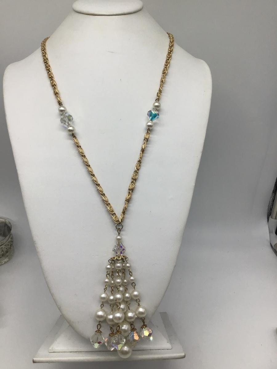 Beautiful Vintage Crystal Beaded Necklace with Faux Pearl. Tassel