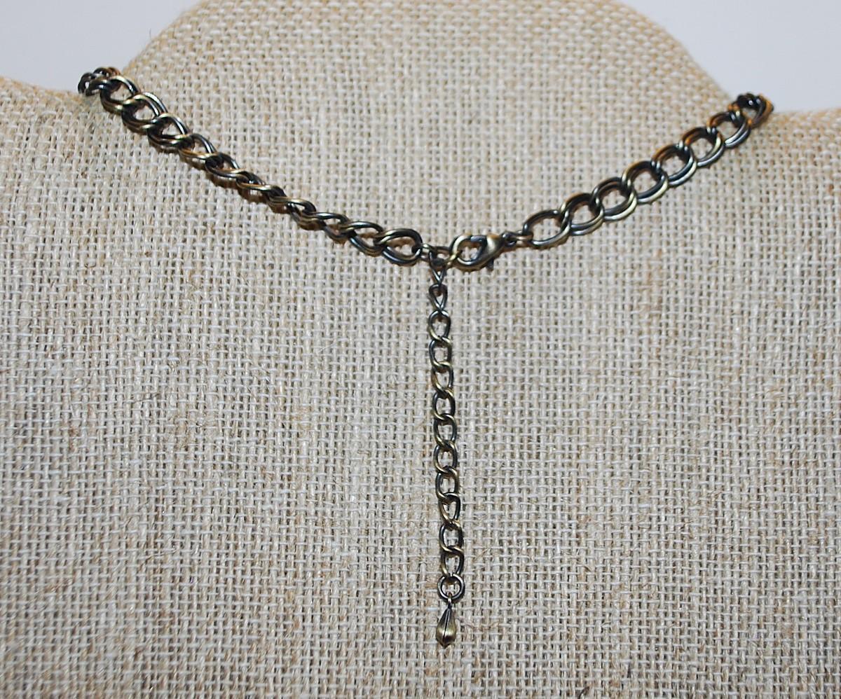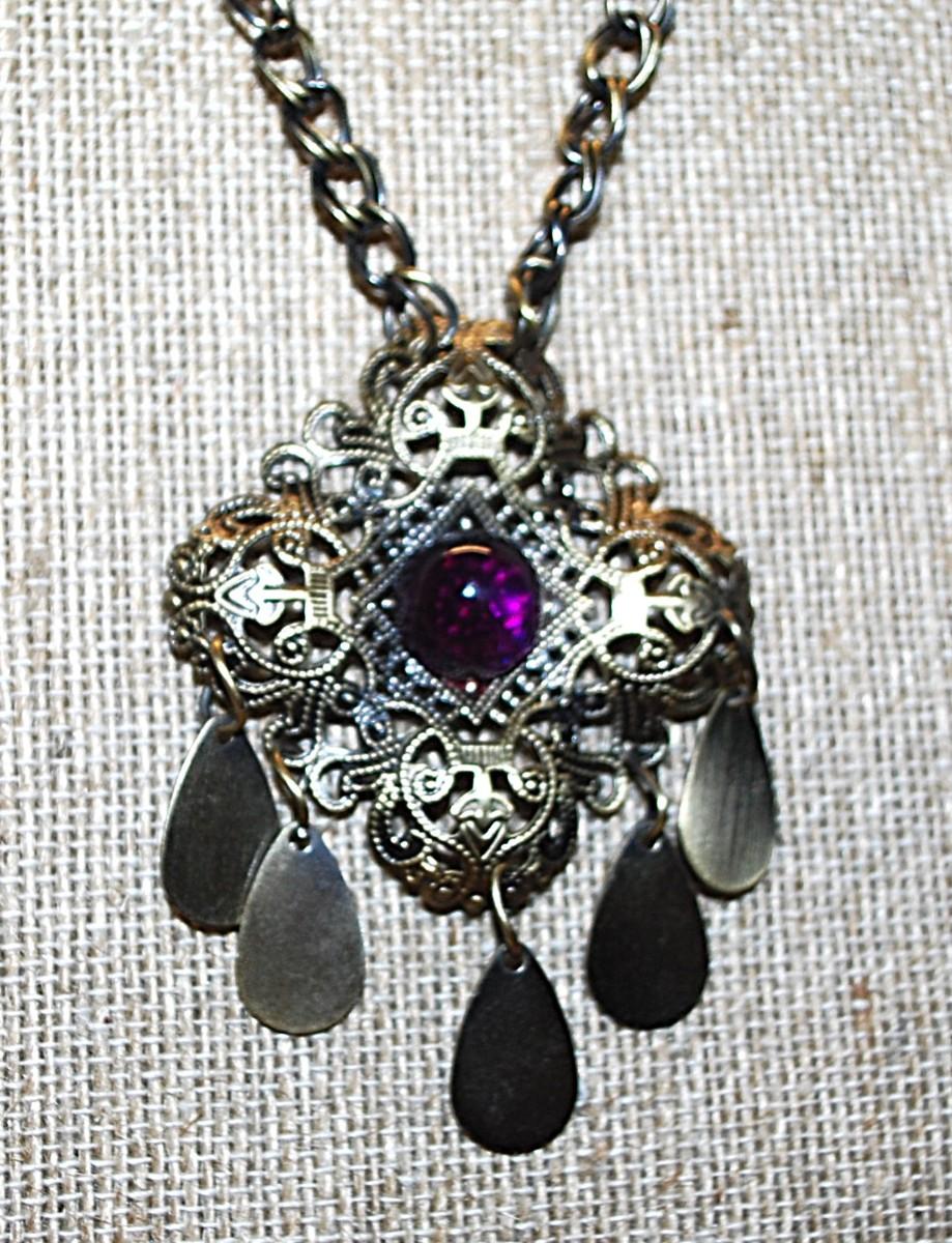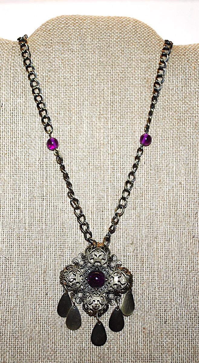 Beautiful VINTAGE Deep Gold Colored PURPLE Cabochon PENDANT (2½" x 2") with Matching Purple Globes on a Brass Colored NECKLACE CHAIN 15" L