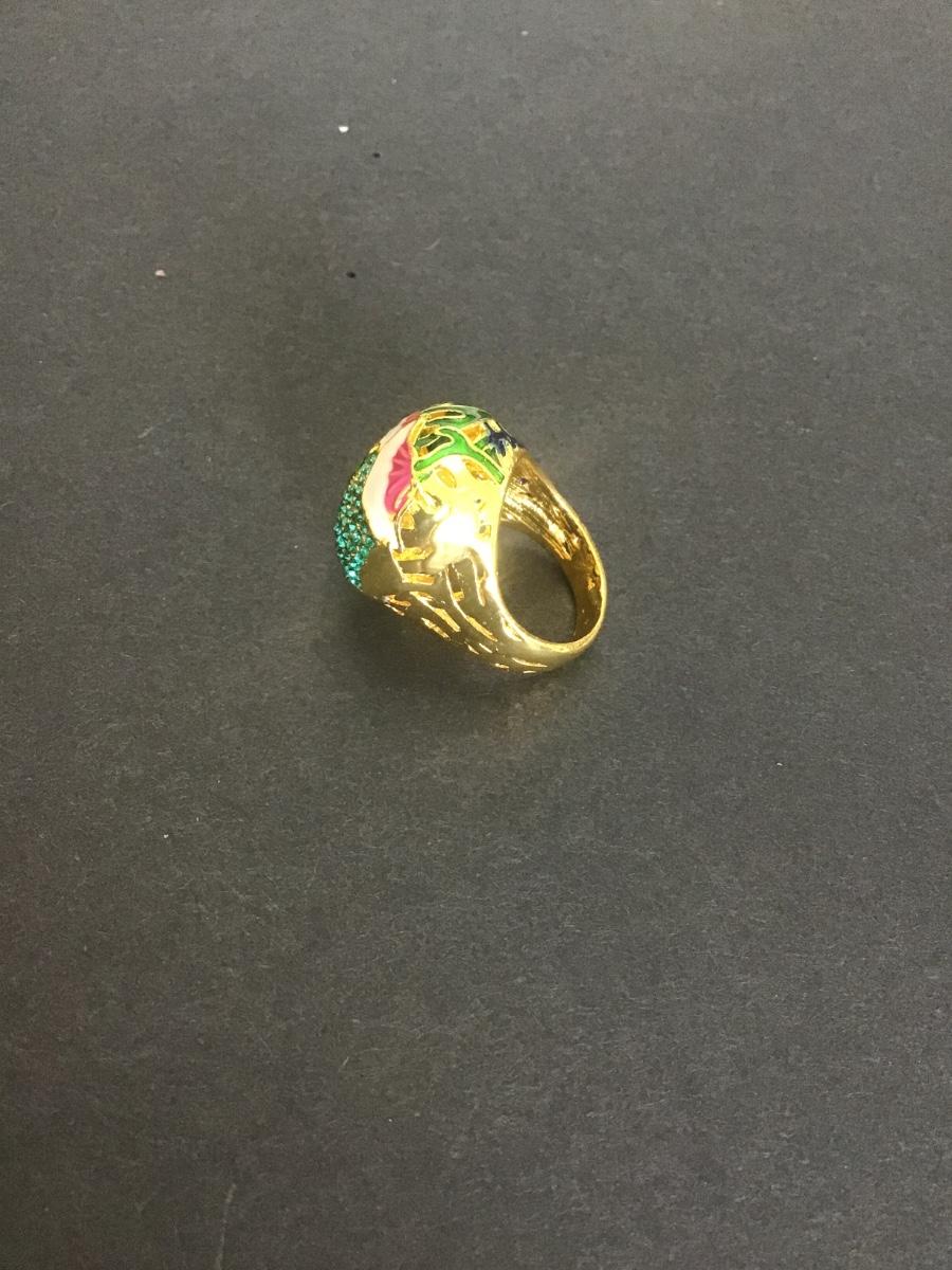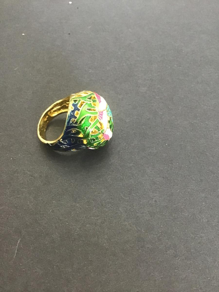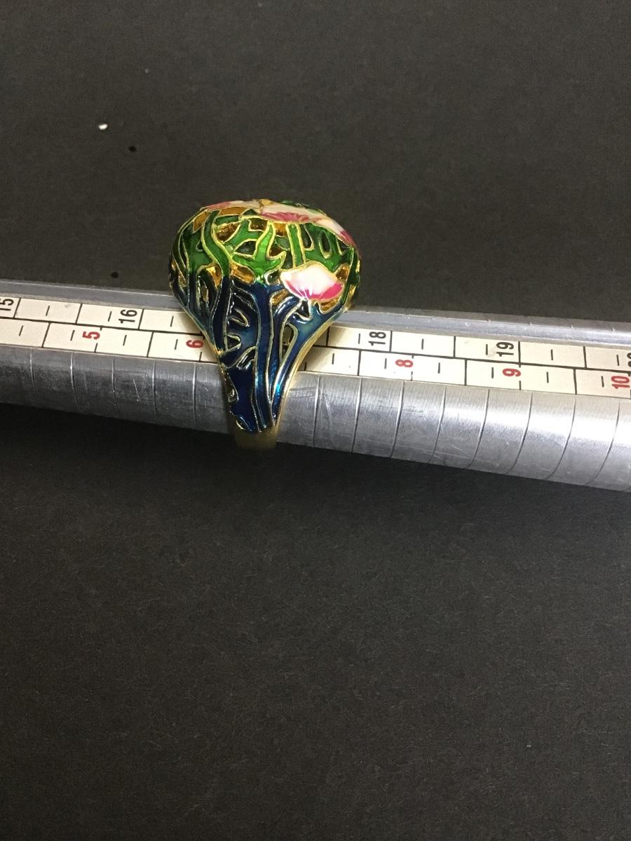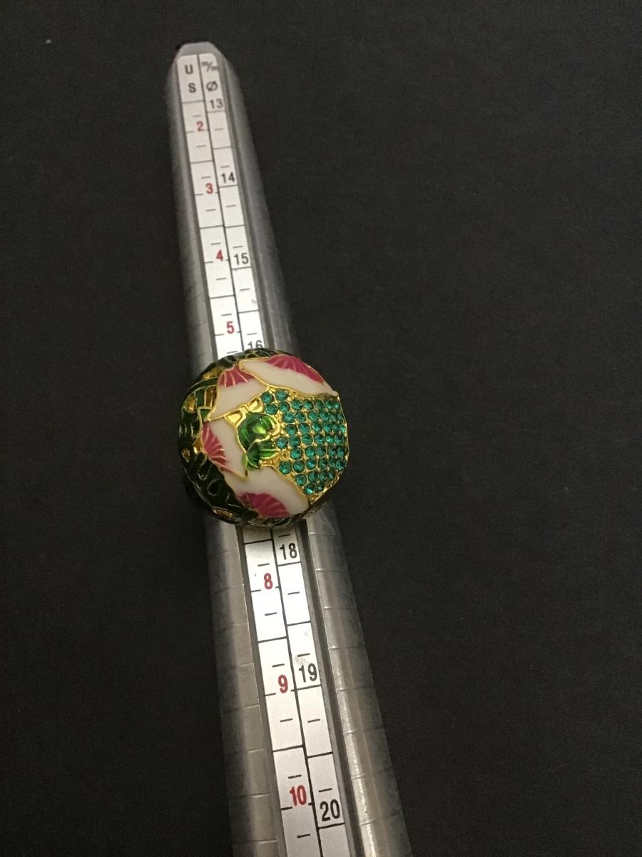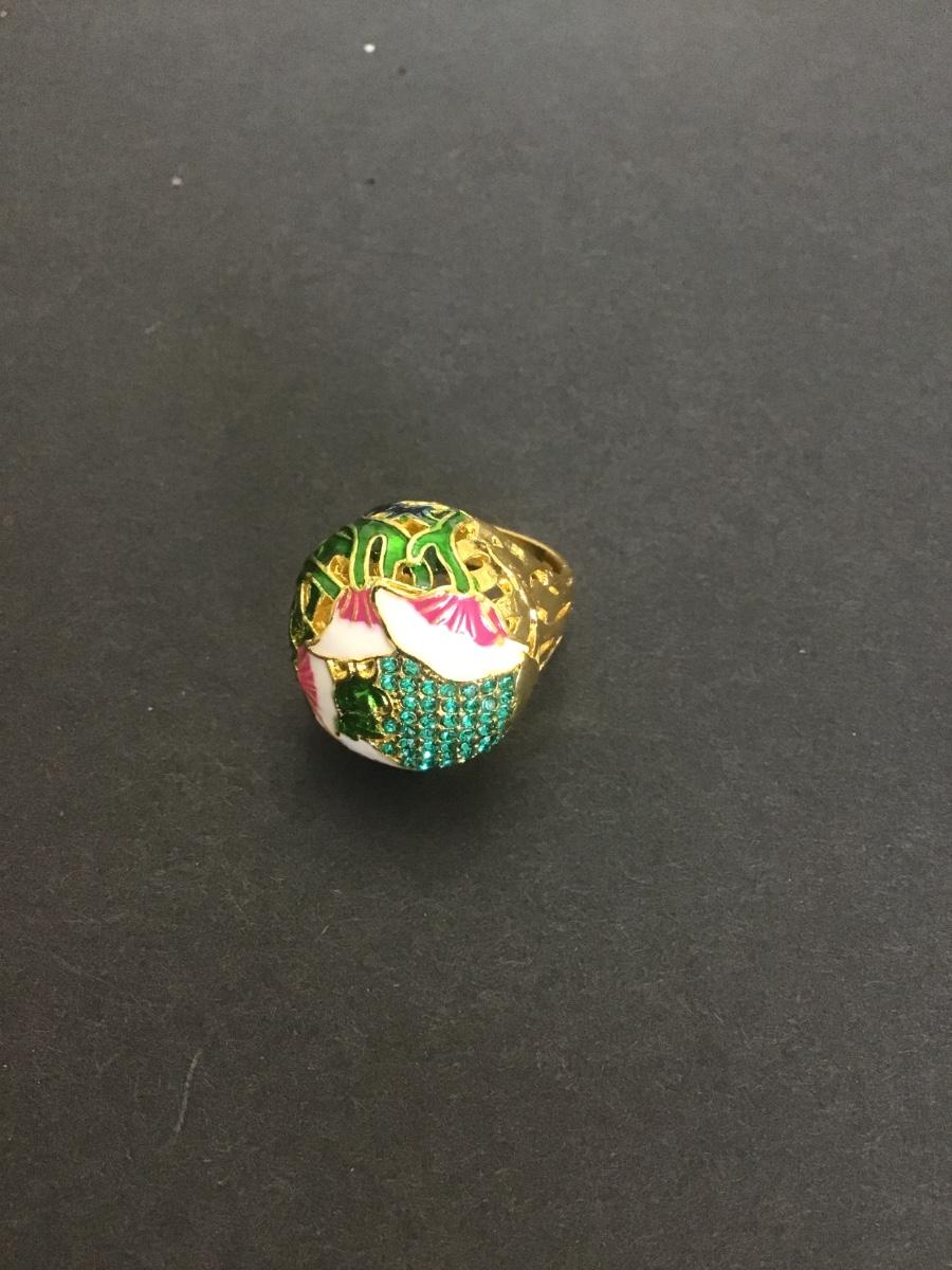 Beautiful vintage Dome enamel ring with green crystals Calla Lily poppy design