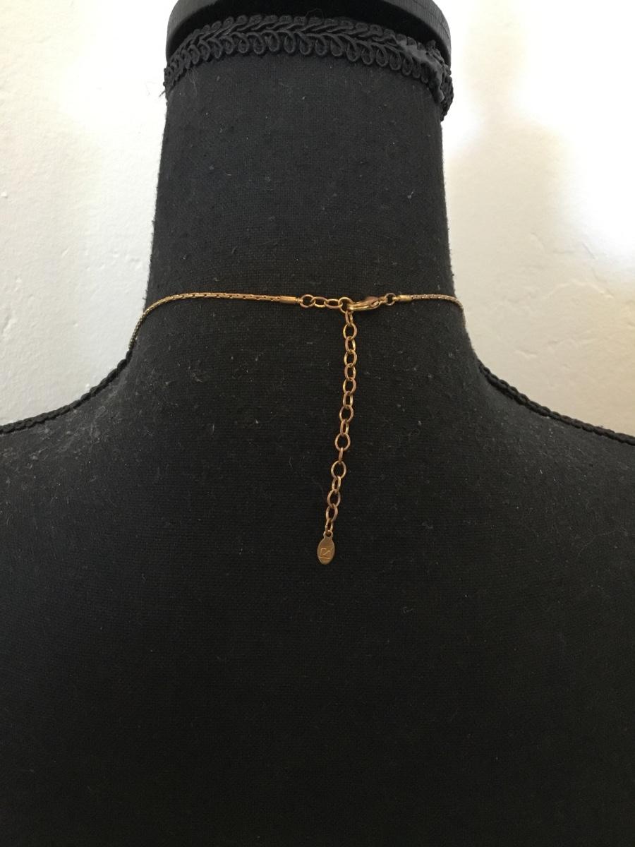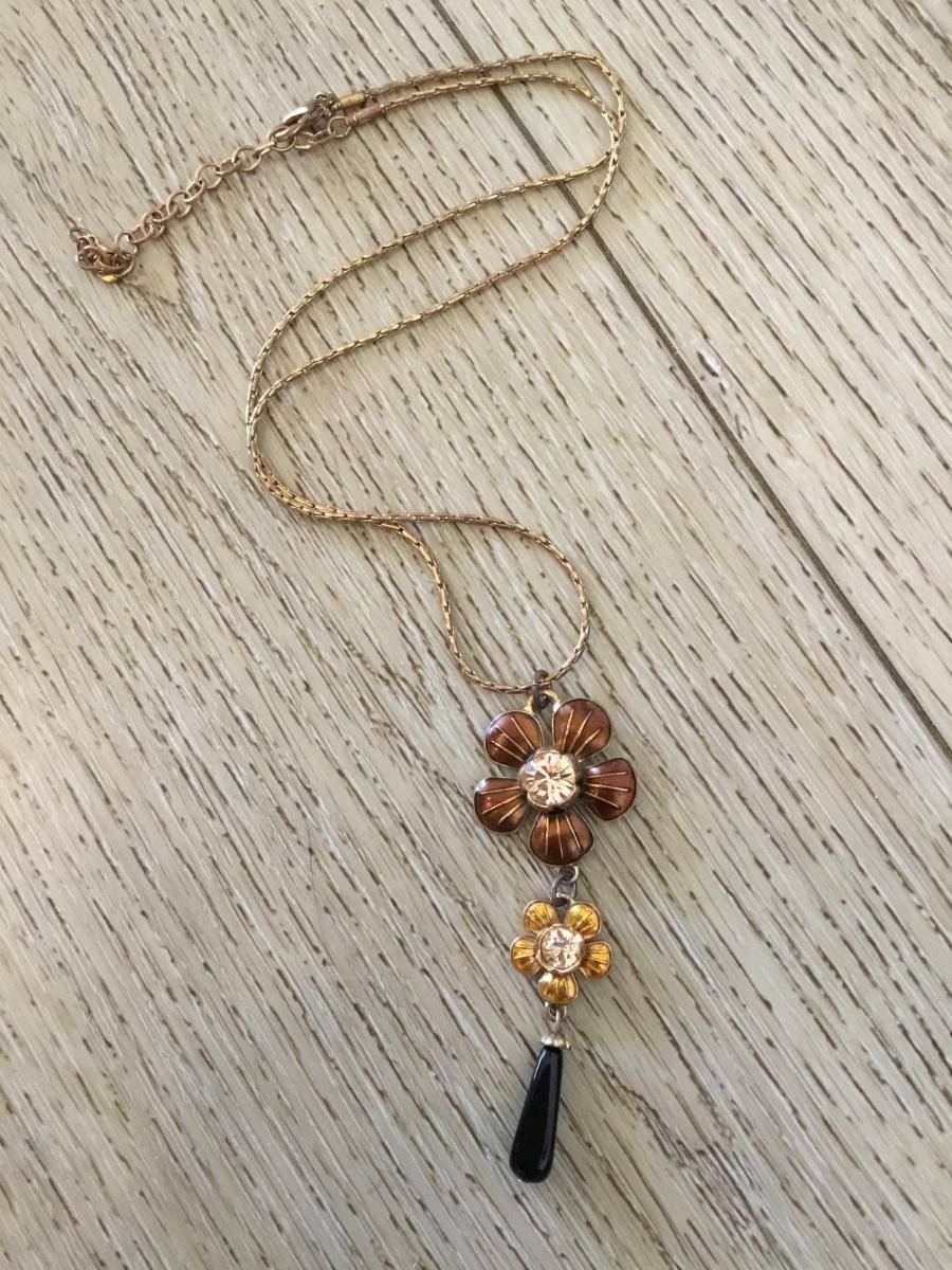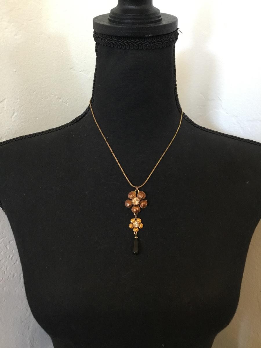 Beautiful vintage, fall enamel, flower, rhinestone and black onyx stone drop dangle necklace makers mark signed