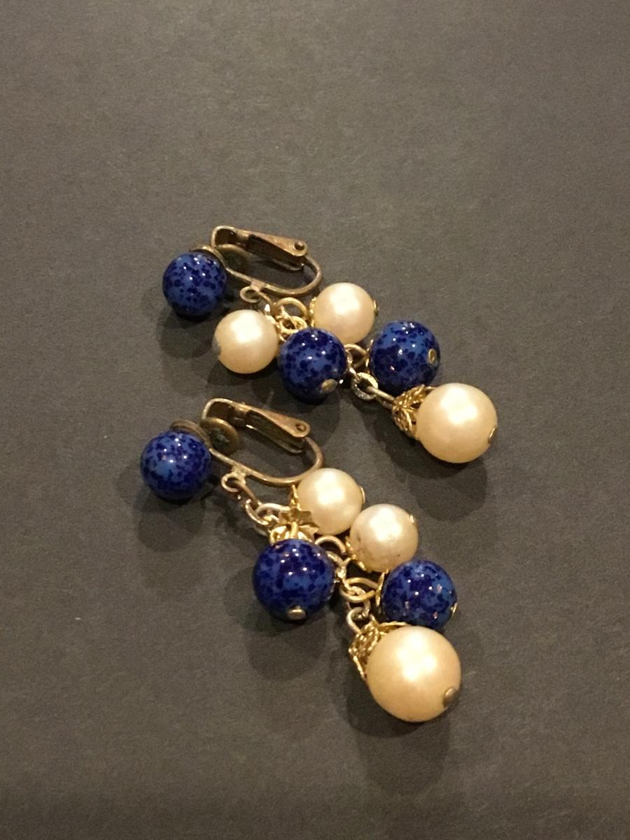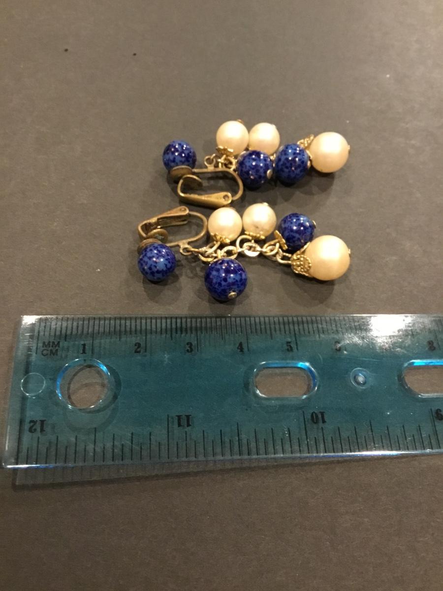 Beautiful, vintage, faux, pearl stone bead, maybe lapis clip on dangle earrings