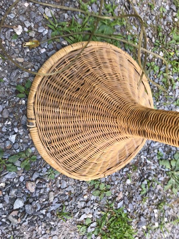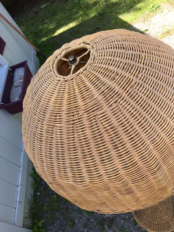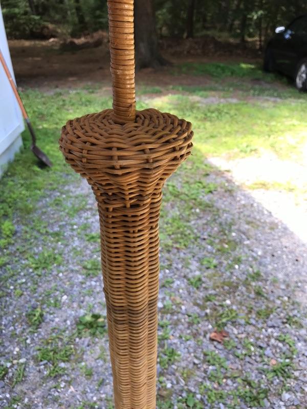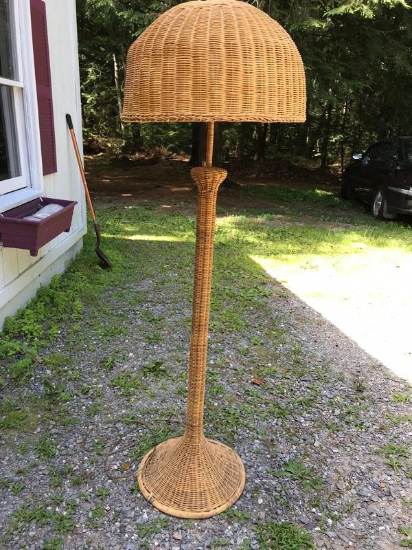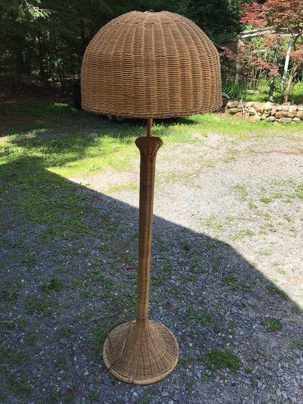 This is a beautiful vintage floor lamp. It is wicker. It has the base and the matching shade. It has some wear as shown in the photos. It is in good working condition. The dimensions are: 65" tall by 20" wide.