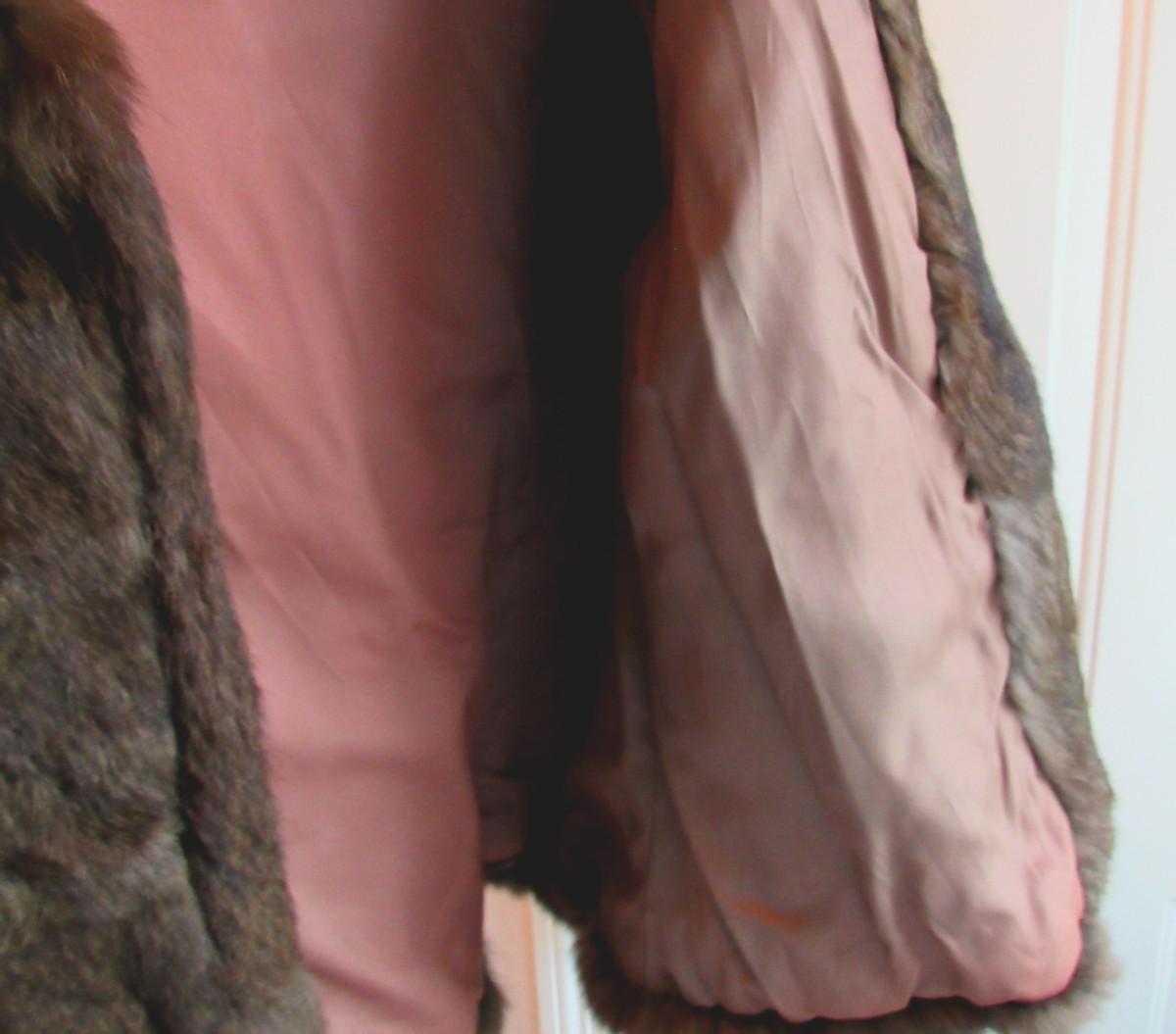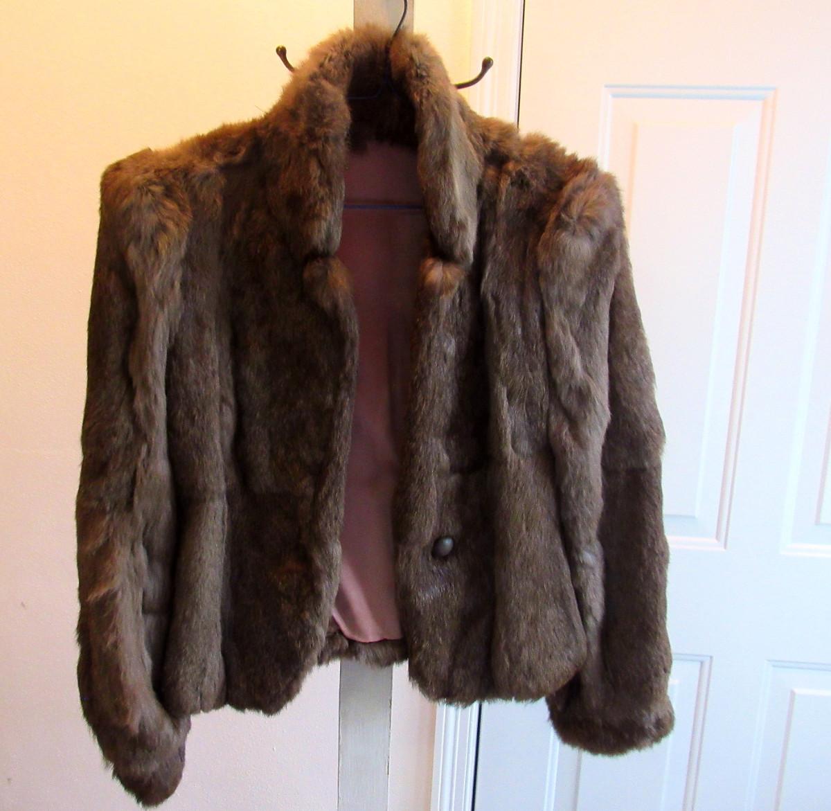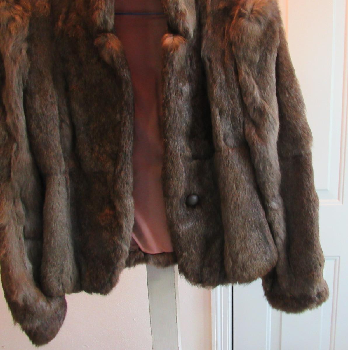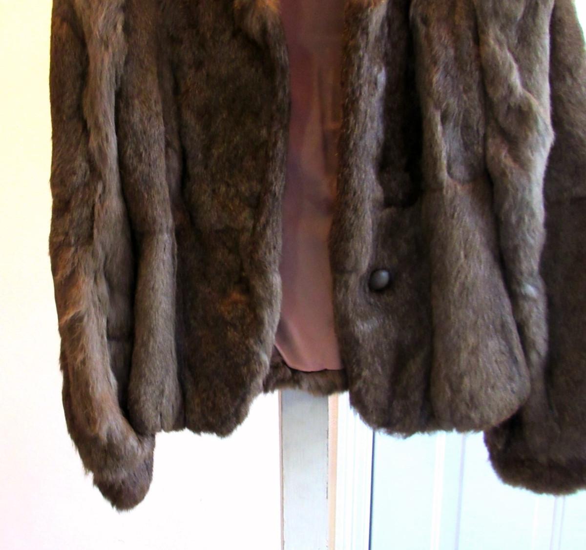 I think it is rabbit fur, not positive, One button front closure in good shape, collar, hidden shoulder pads. No pockets. No labels, unknown maker or size. Measures about 17" shoulder to shoulder, about 16-17" wide waist. Lining has a seam split at the arm pit, otherwise appears to be in very nice shape. Shipping is available at actual shipping cost plus $5.00 handling fee per box for supplies/labor. See our terms for details. All sales are final. Condition notes may not be all inclusive, we may miss some issues as most vintage items are not in mint condition and have some degree of wear, paint loss, etc, but we always try to note obvious damage.