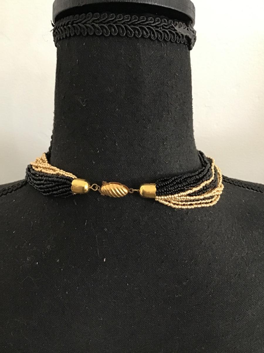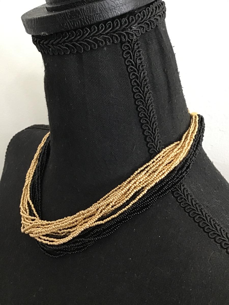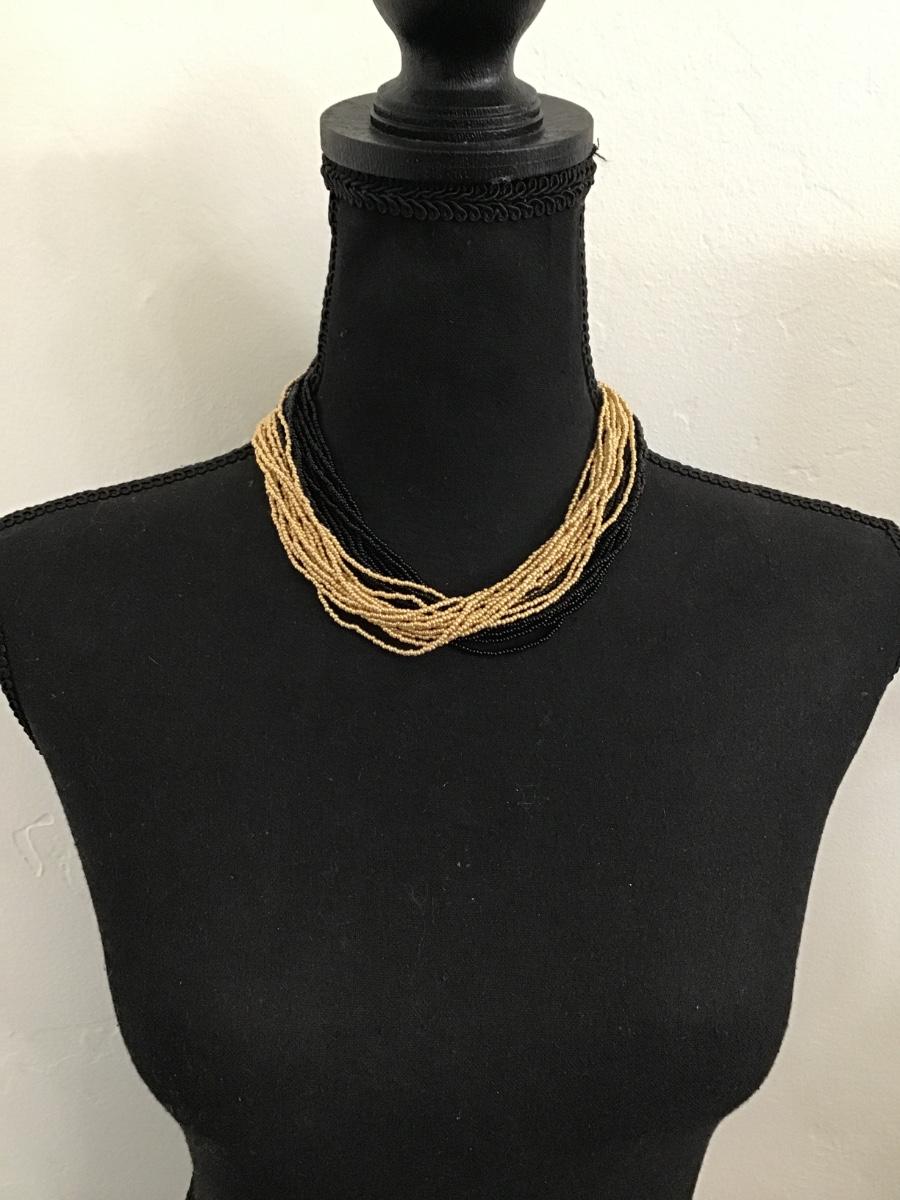 Beautiful vintage glass bead, black and gold multi strand statement necklace very beautiful