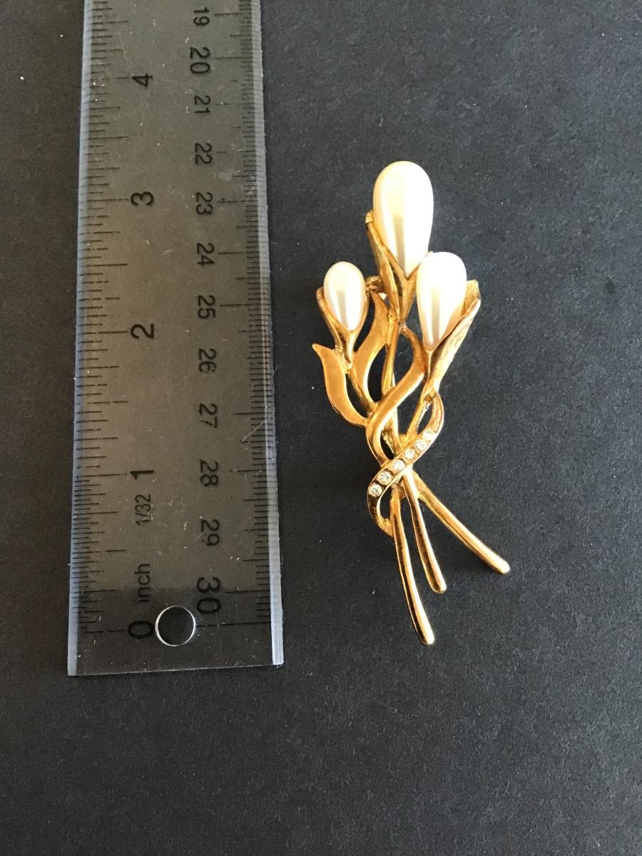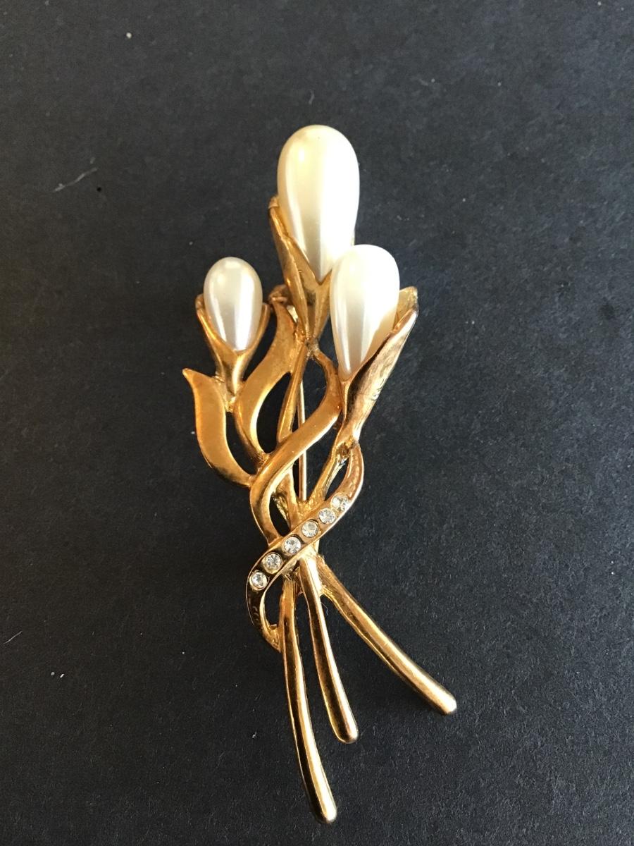 Beautiful Vintage gold tone calla Lily brooch with faux pearls and clear rhinestones