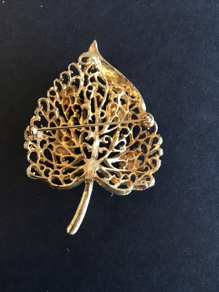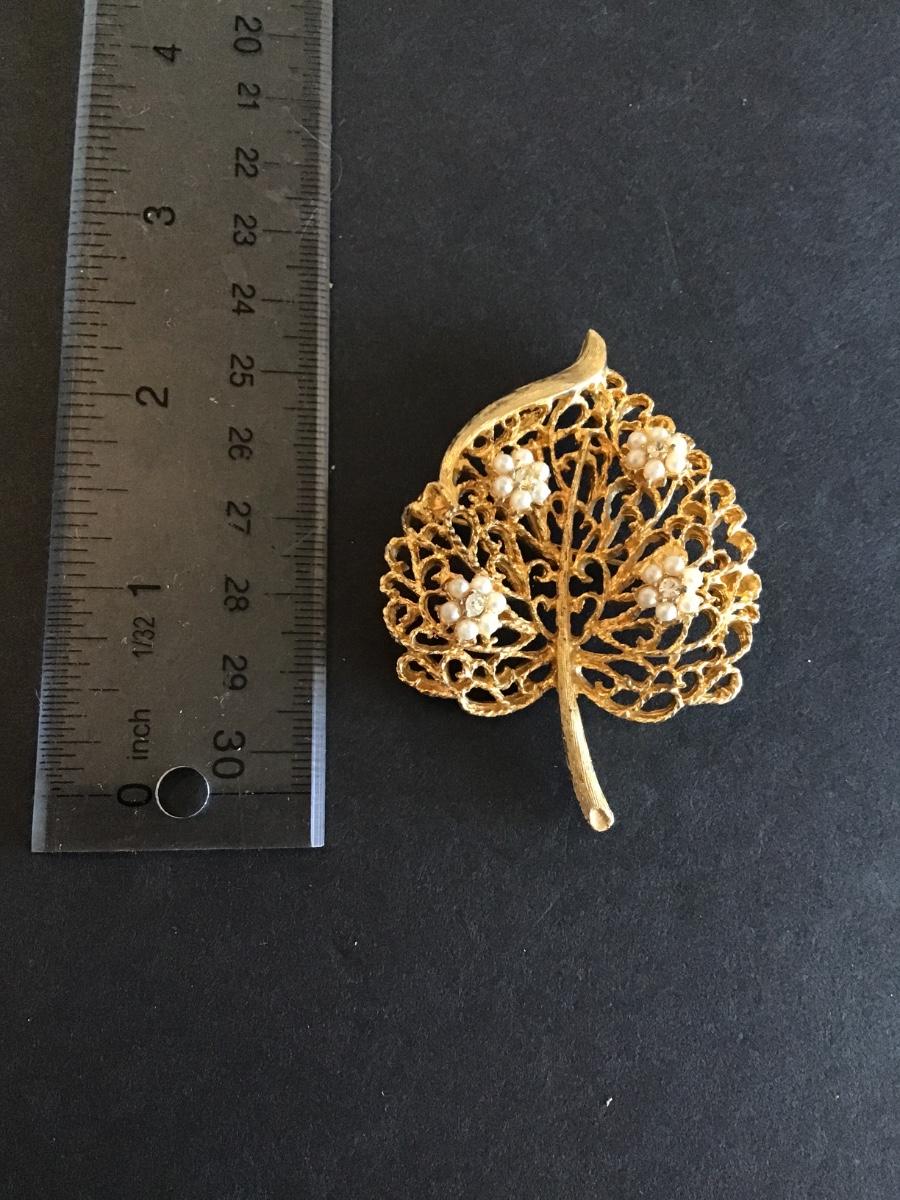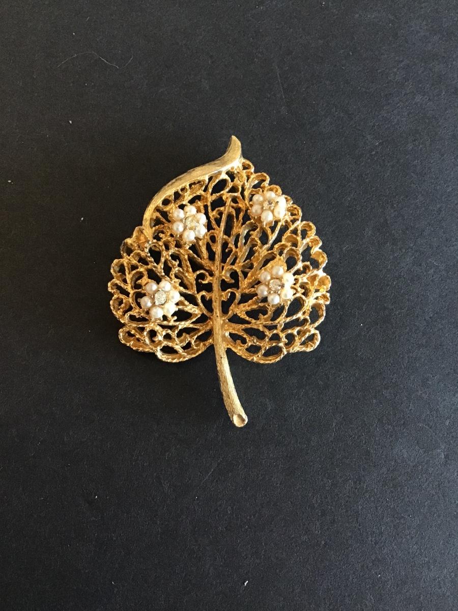 Beautiful Vintage Gold Tone Leaf Brooch with Faux Pearl and clear rhinestones