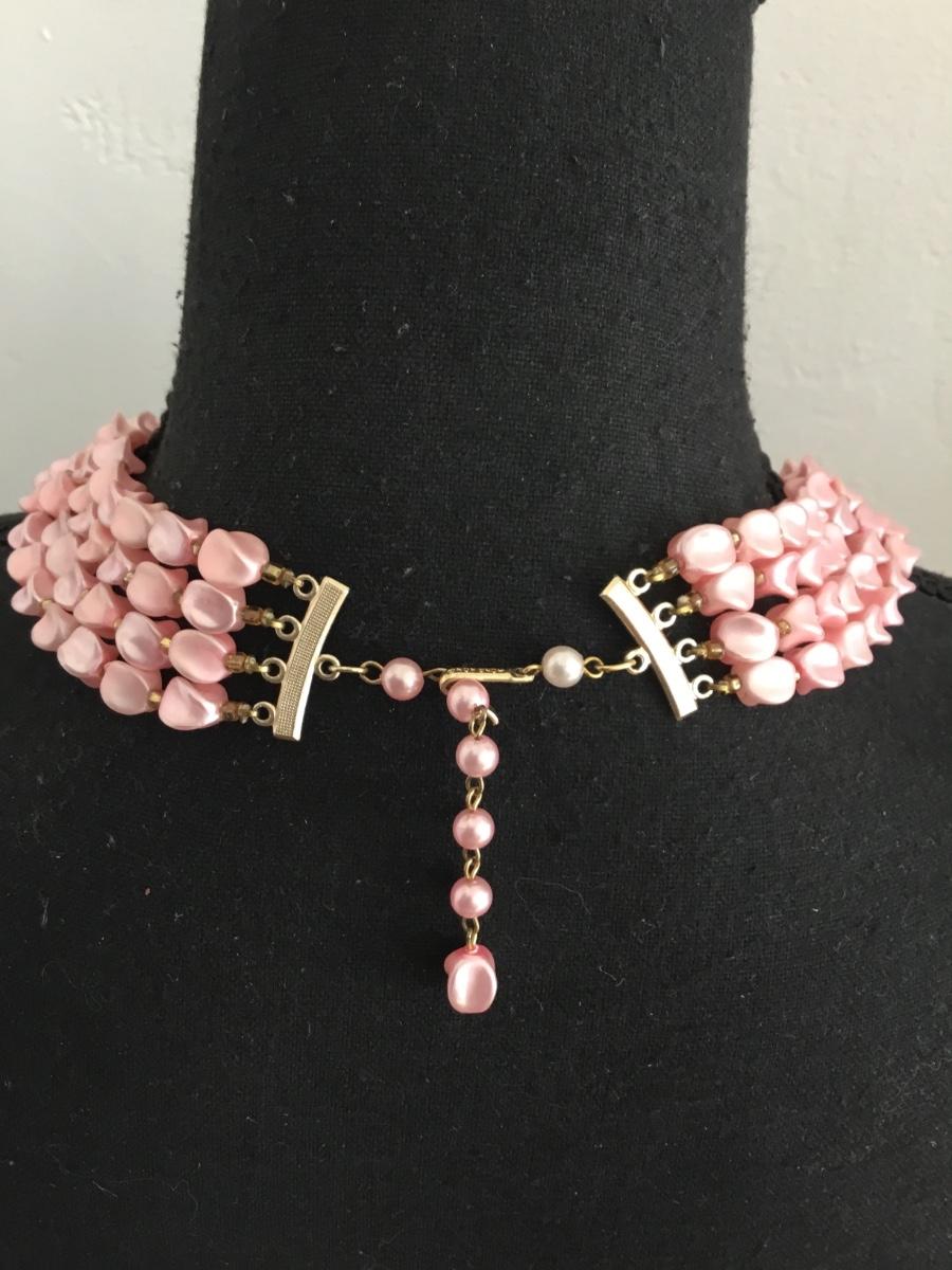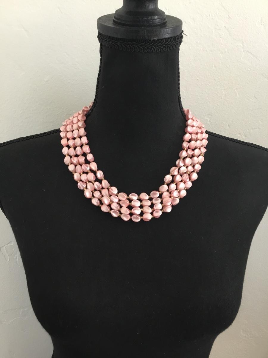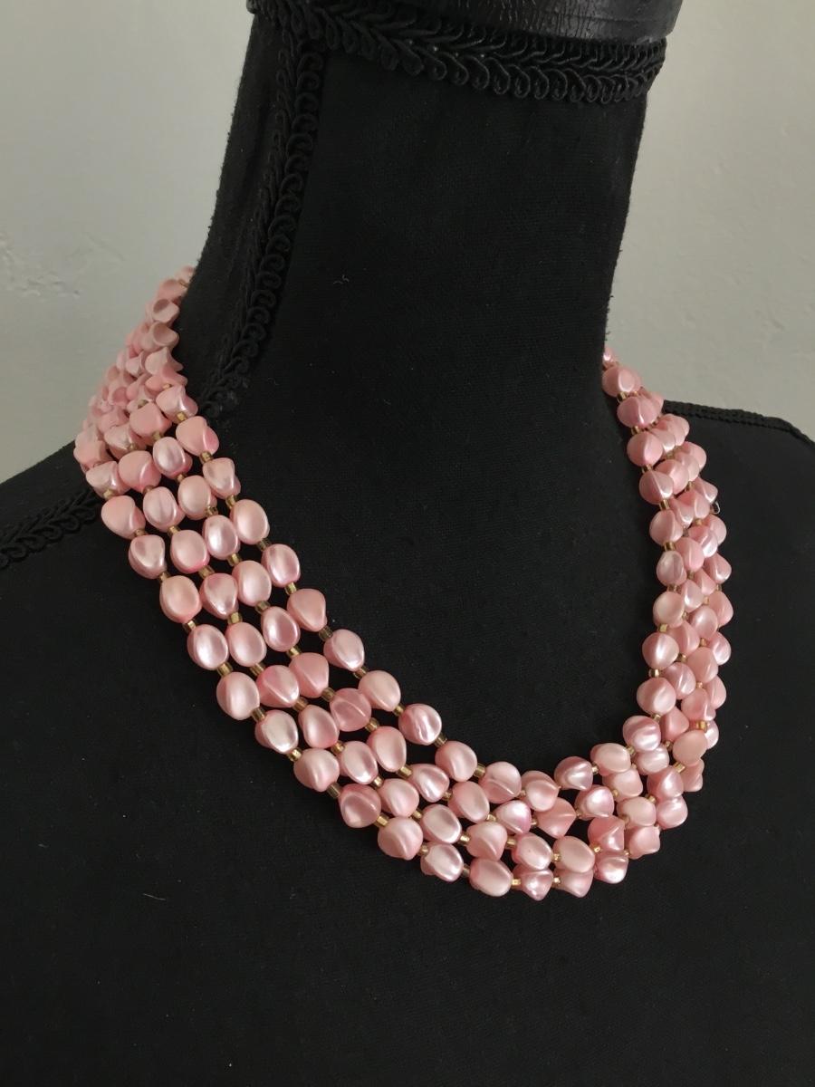 Beautiful, vintage, gold tone, light, pink plastic Lucite type bead, multi strand necklace