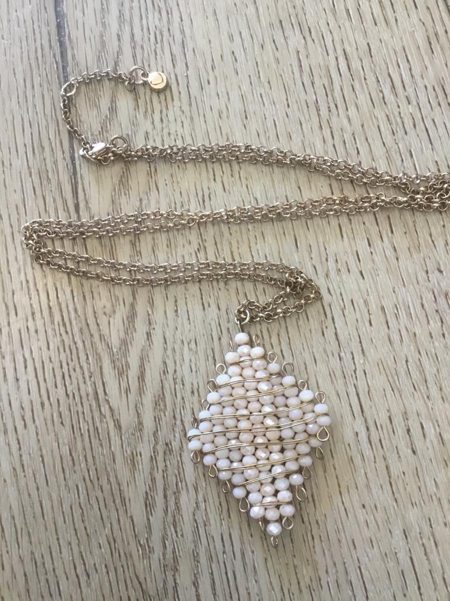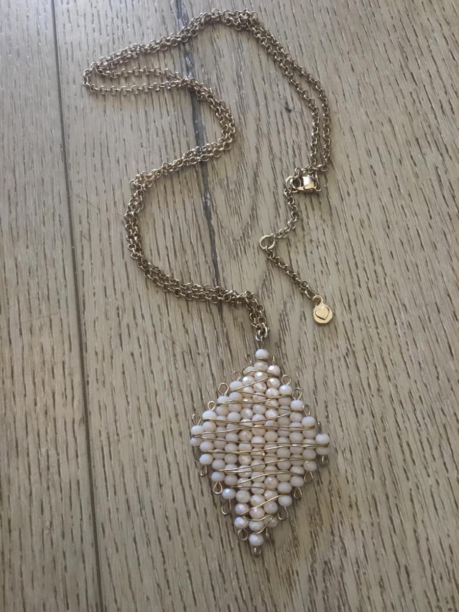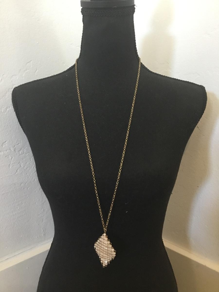 Beautiful vintage, gold tone, light pearly, glass bead, wire, wrapped triangle pendant necklace very pretty