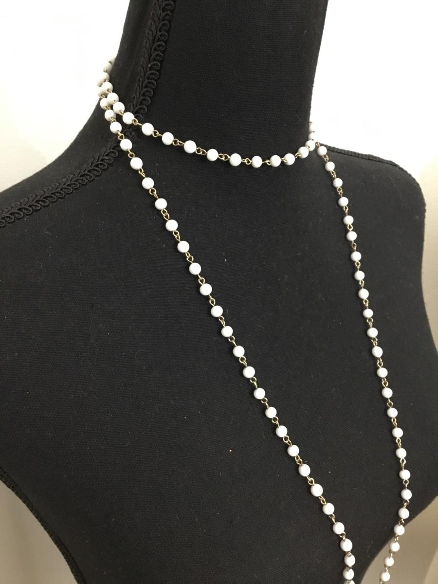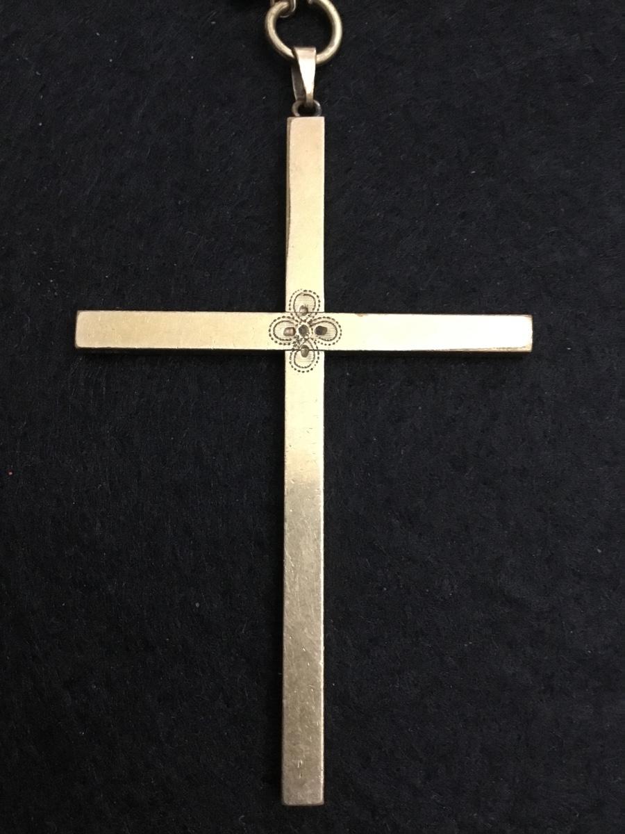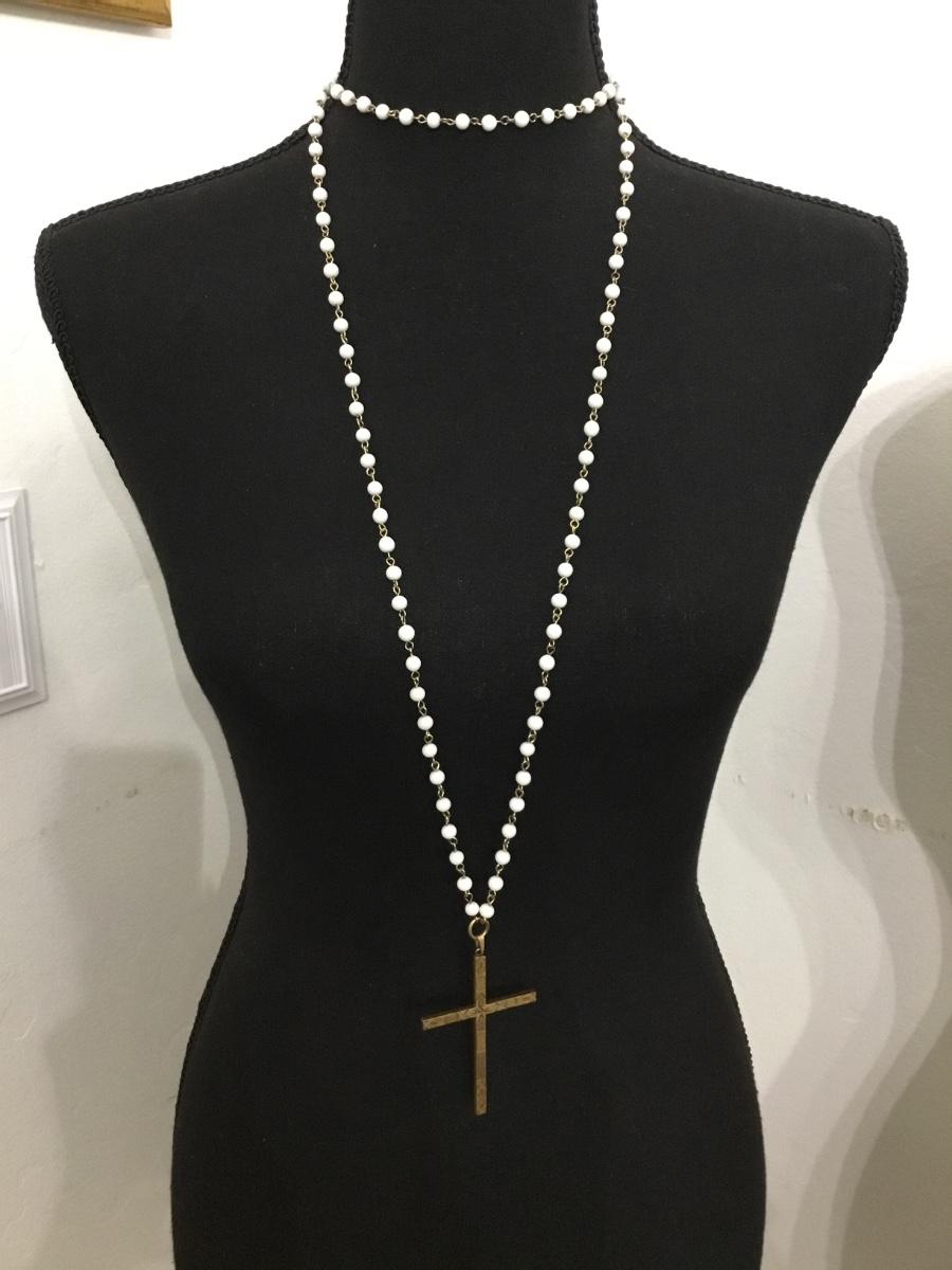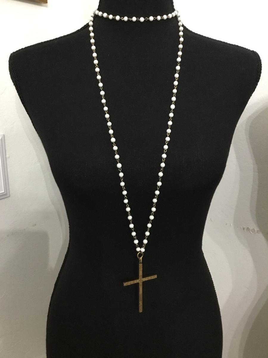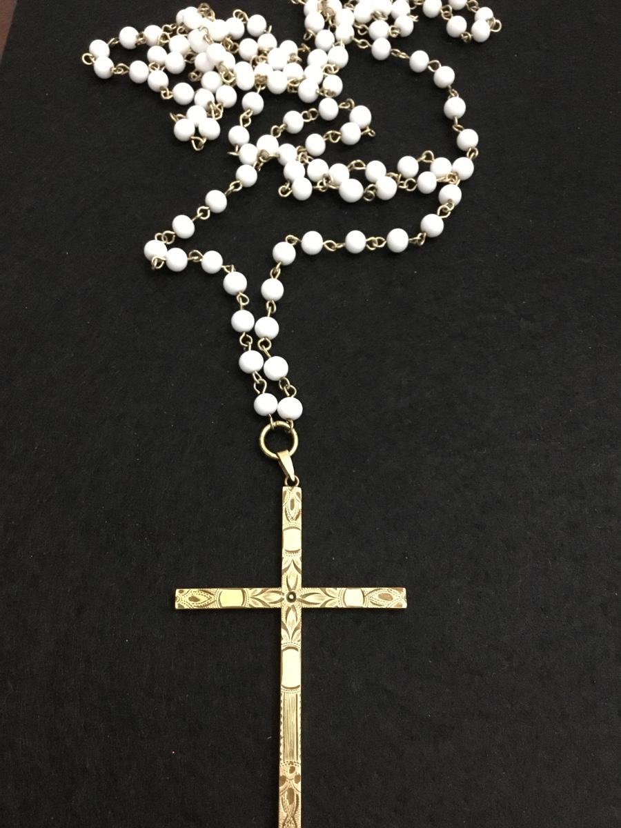 Beautiful vintage, gold tone , milk, glass bead necklace with gold tone, large cross pendant