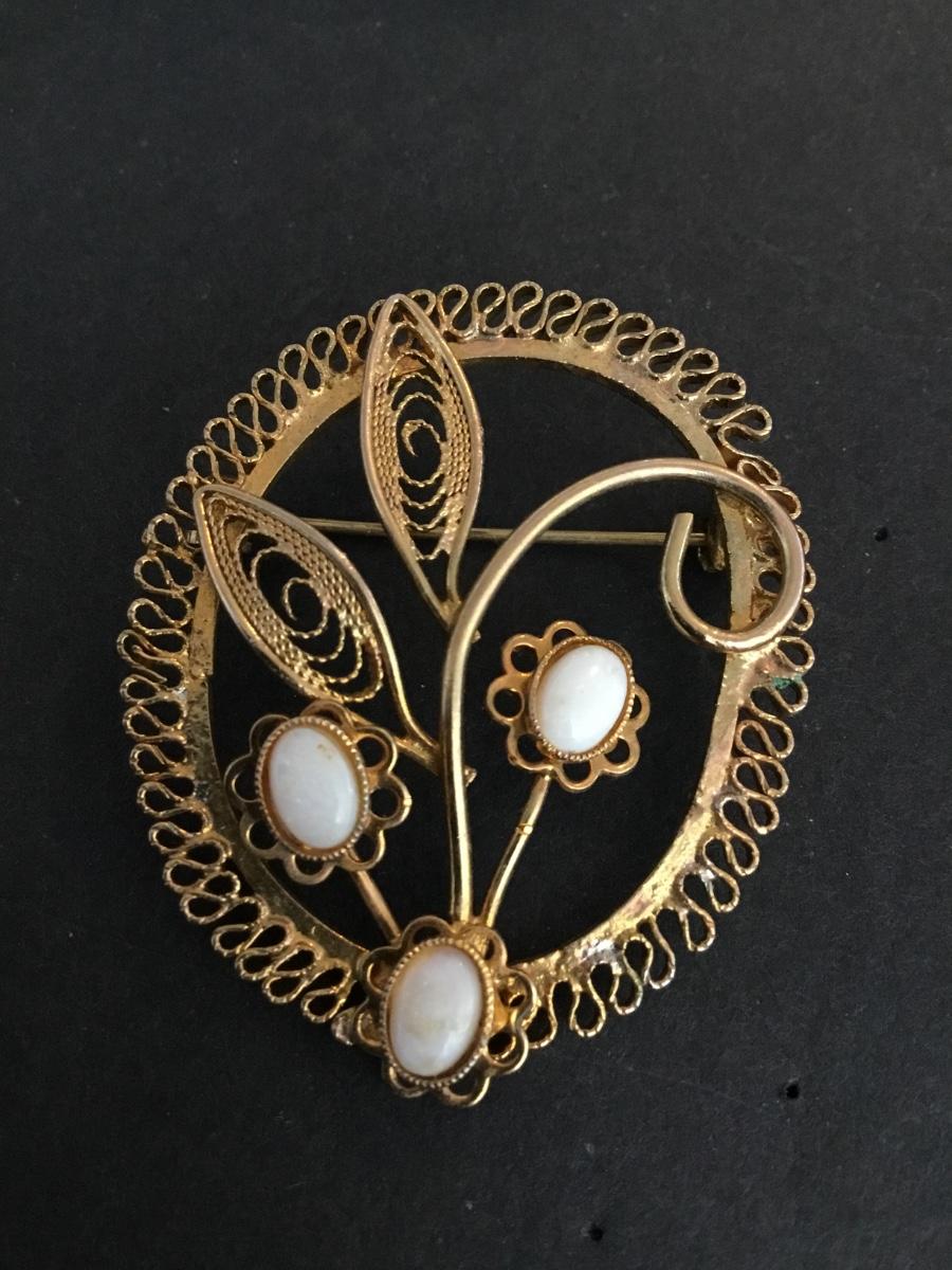 Beautiful, vintage, gold tone, white milk, glass, gold filigree brooch