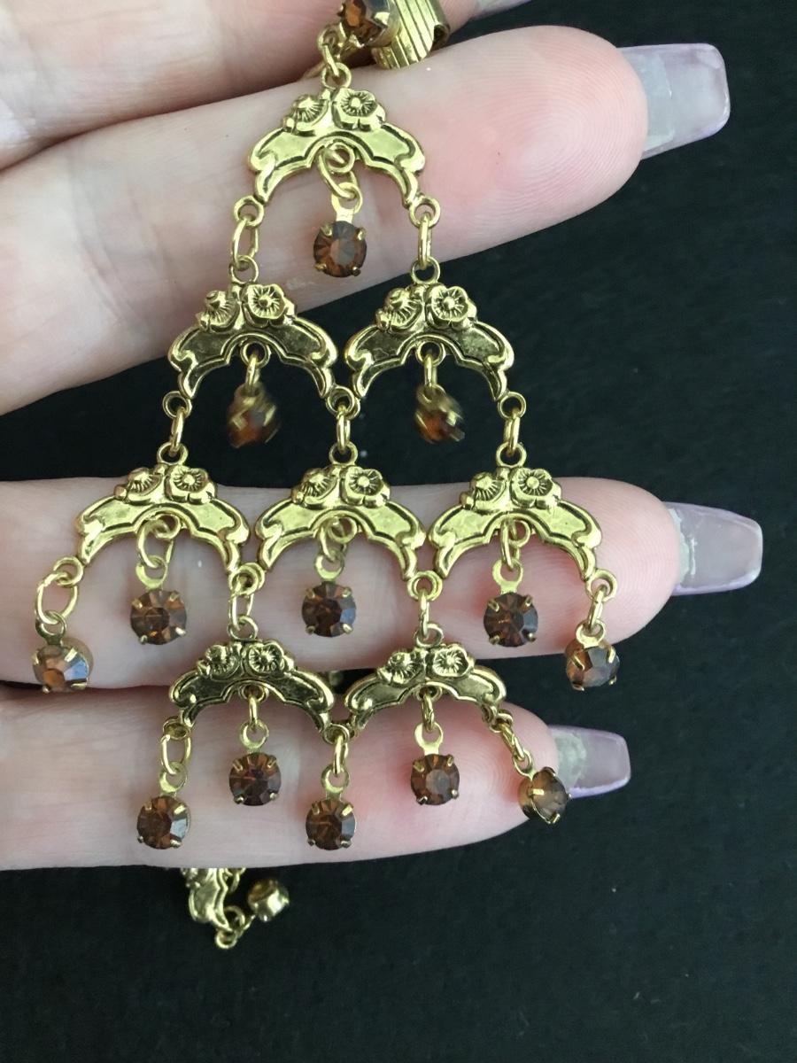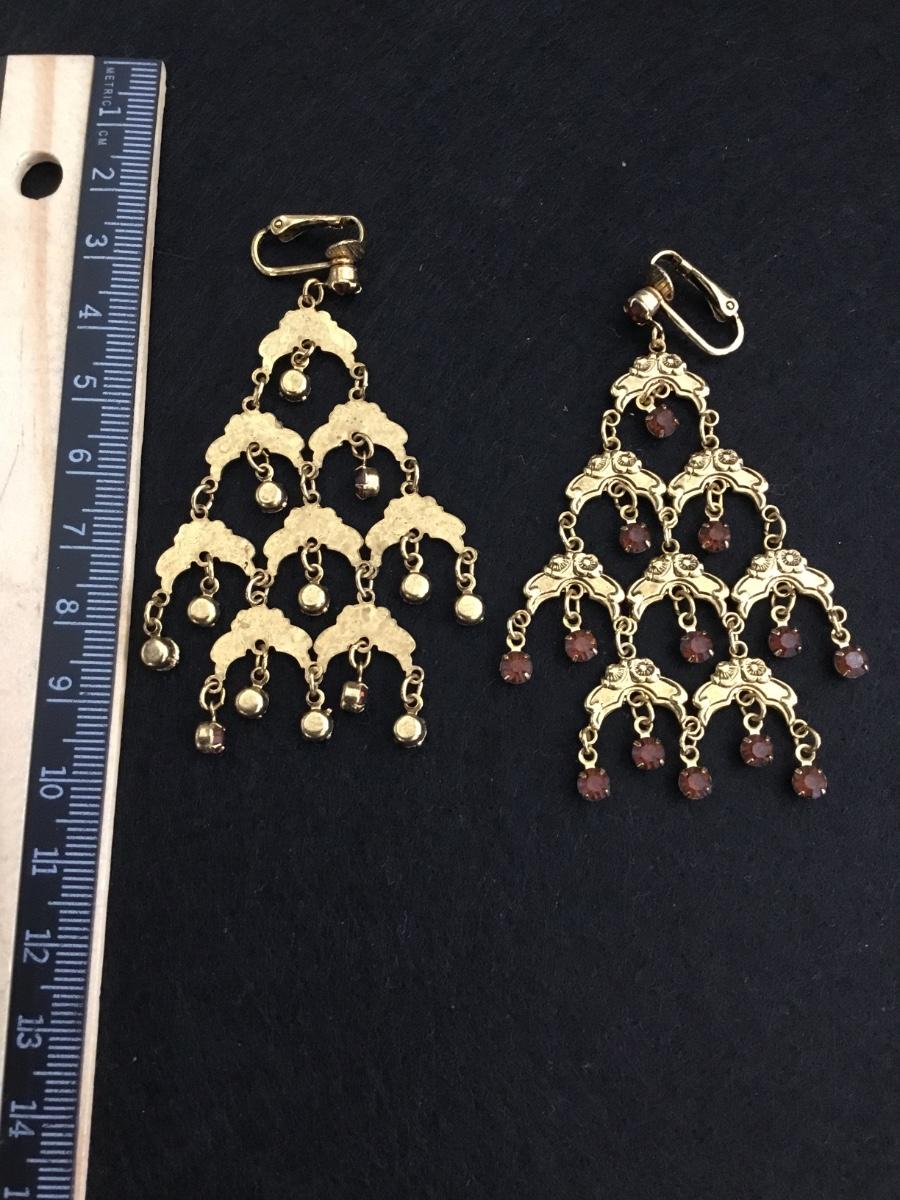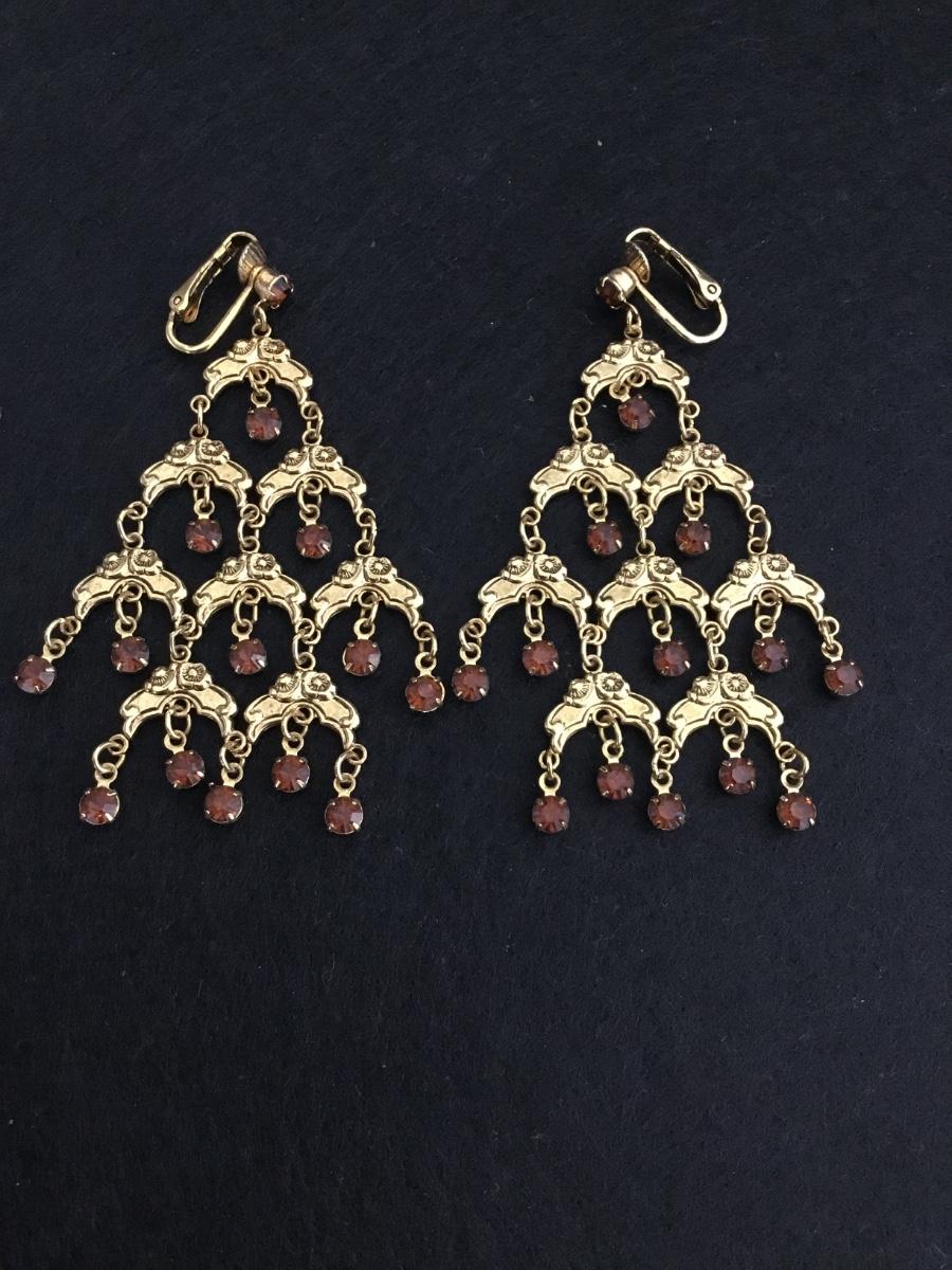 Beautiful, vintage, gold, toned chandelier, root beer, colored rhinestone clip on statement earrings