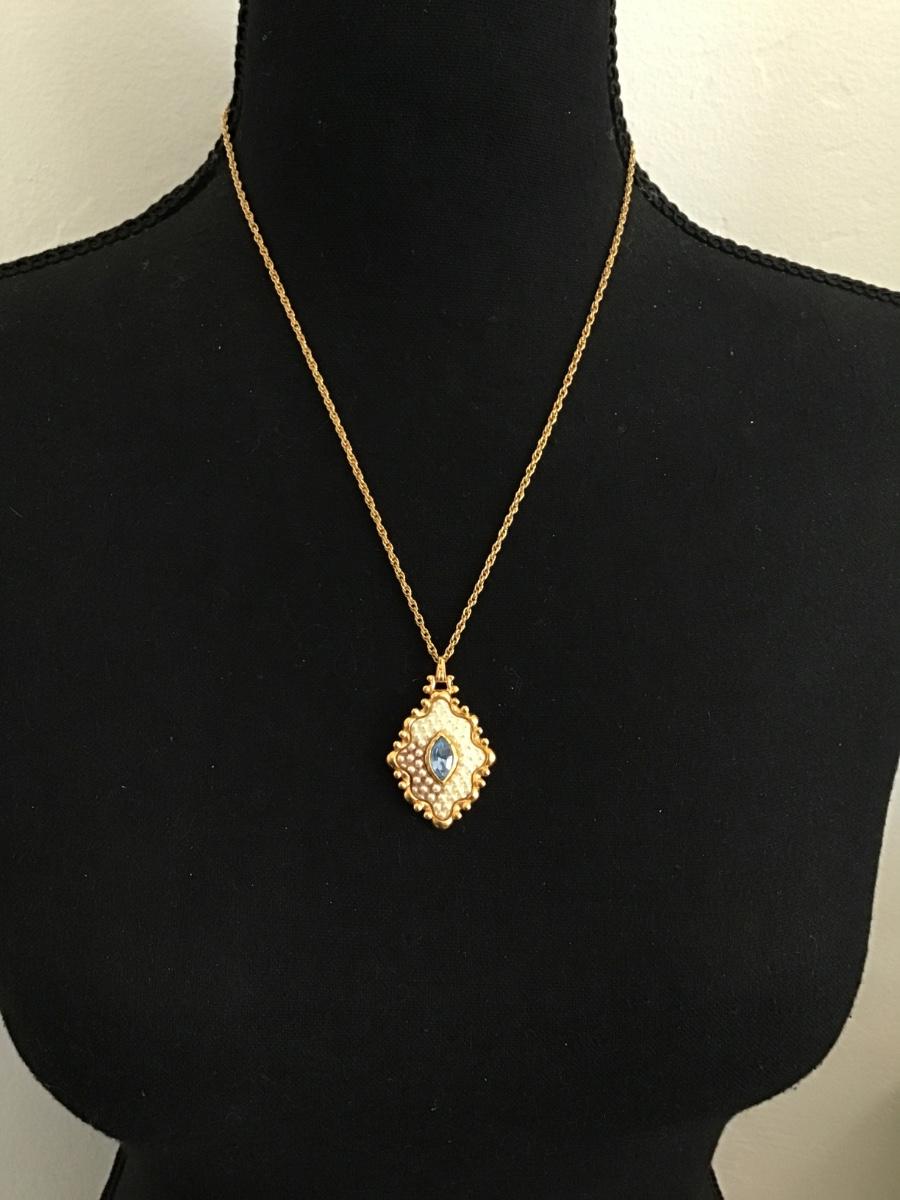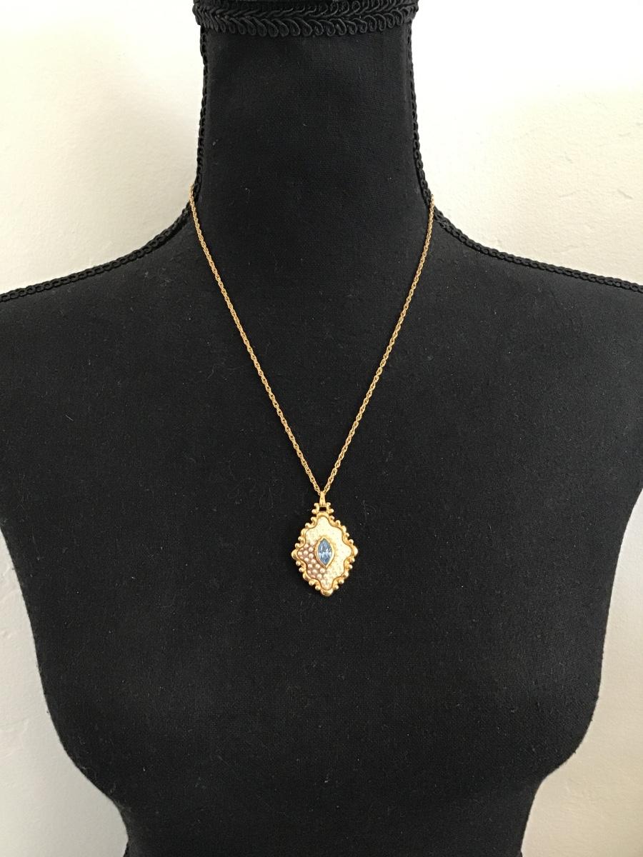 Beautiful vintage, gold, toned, faux, pearl blue rhinestone pendant necklace excellent condition