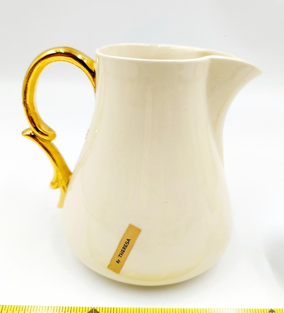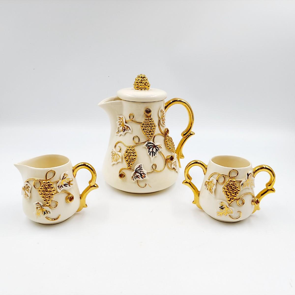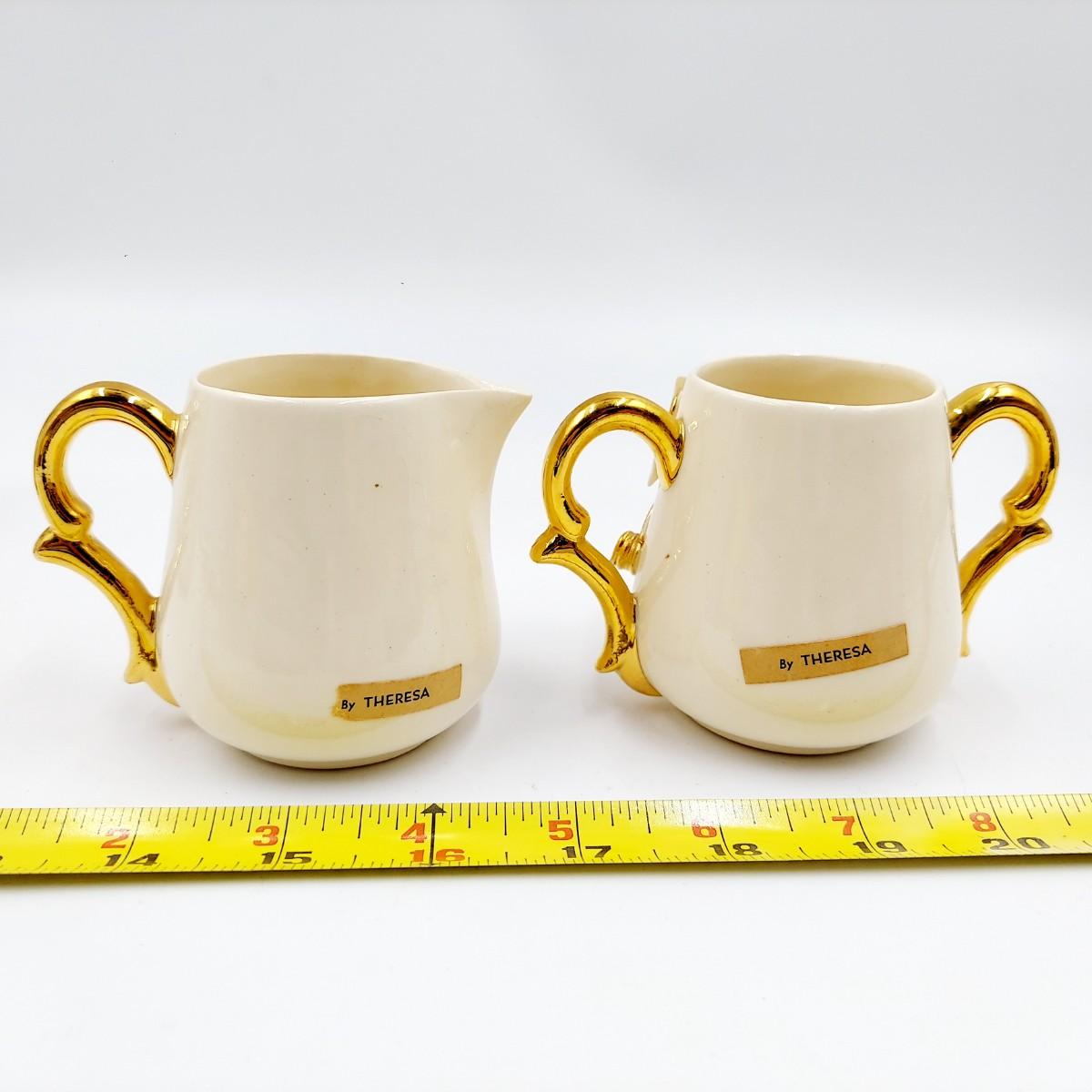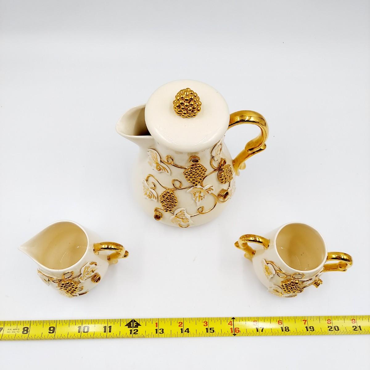 BEAUTIFUL VINTAGE GOLD TRIMMED CERAMIC TEAPOT, CREAM & SUGAR BY TERESA