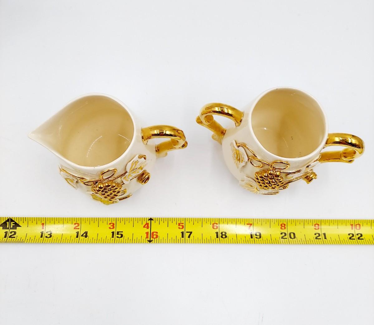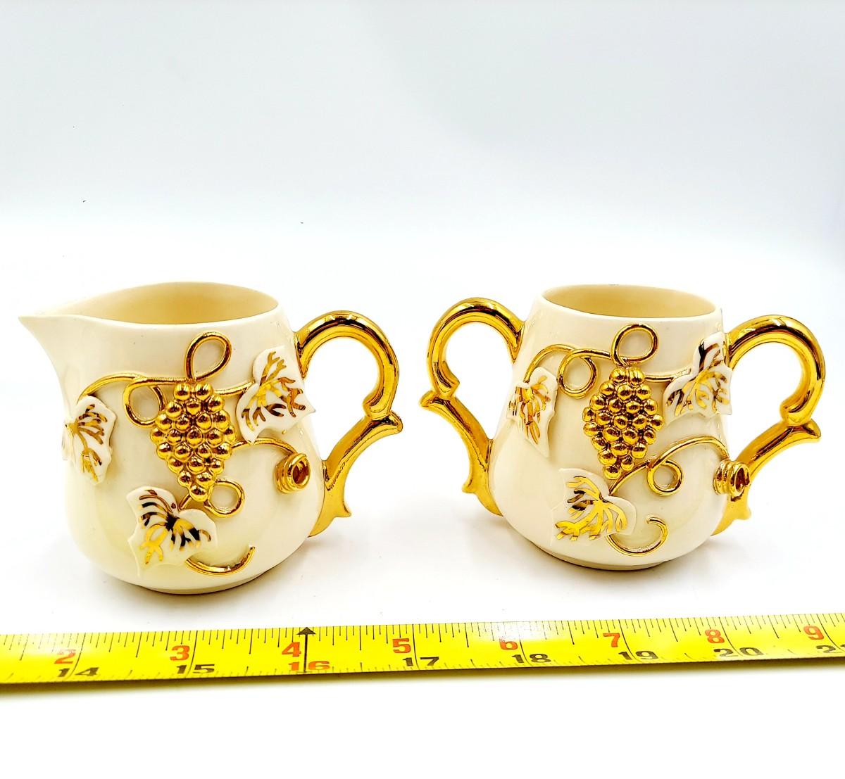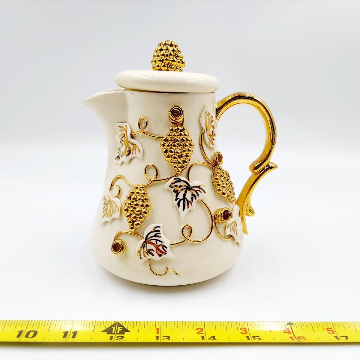 BEAUTIFUL VINTAGE GOLD TRIMMED CERAMIC TEAPOT, CREAM & SUGAR BY TERESA