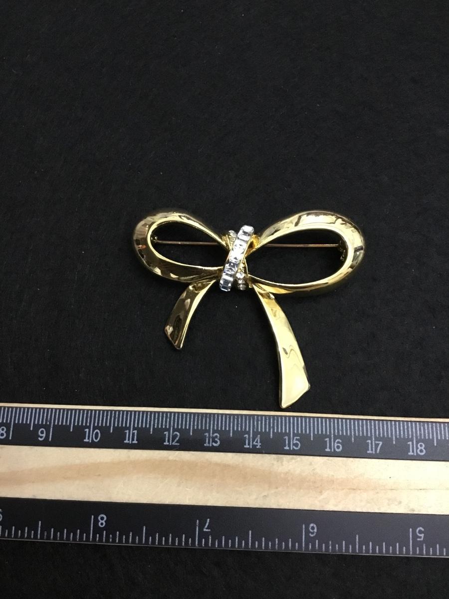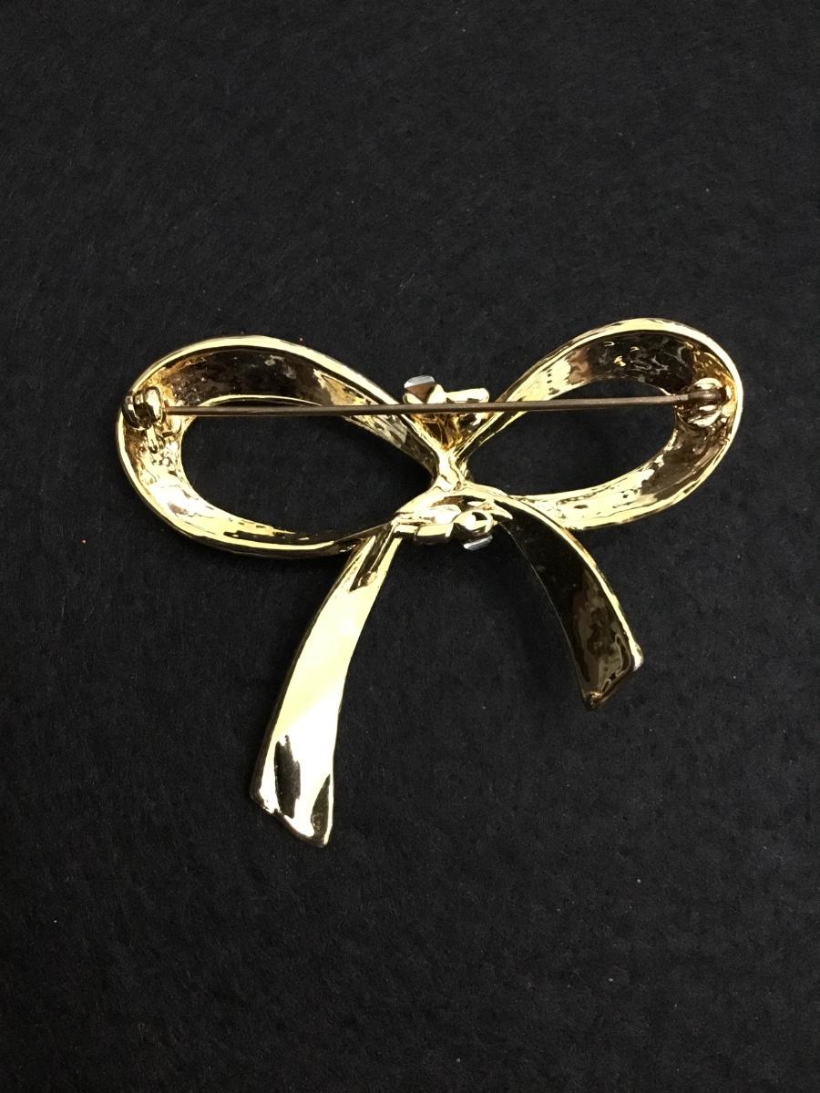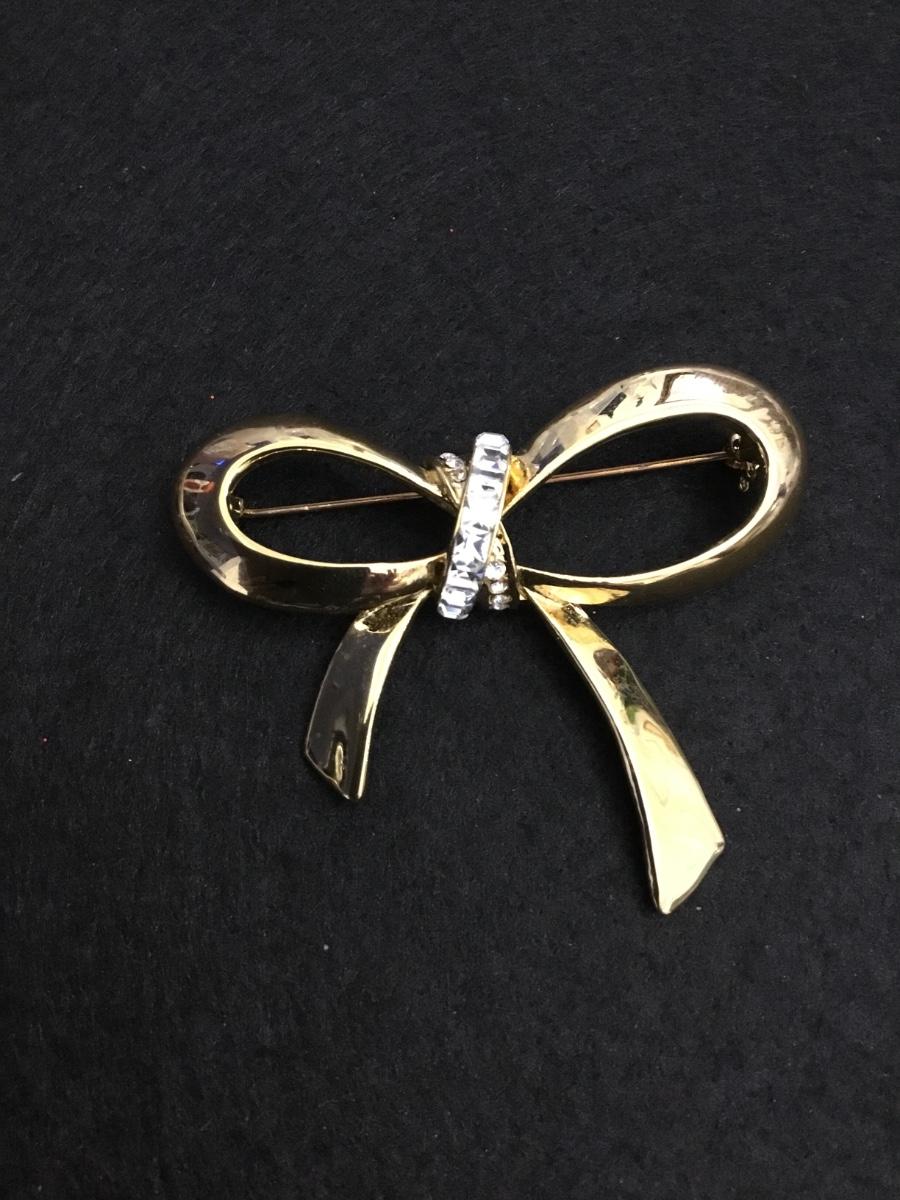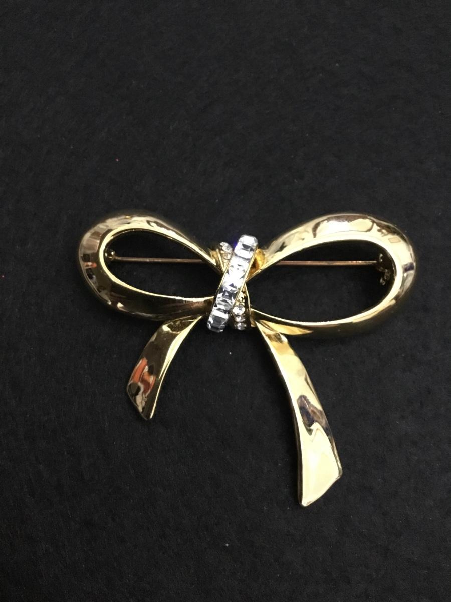 Beautiful, vintage, gold-tone, clear, crystal rhinestones bow brooch / pin