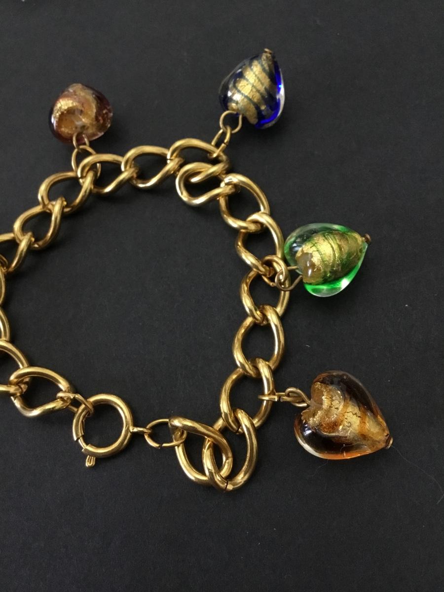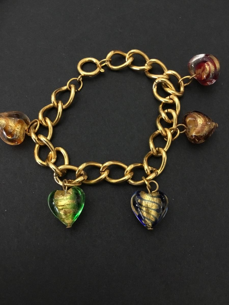 Beautiful, vintage, goldtone glass, heart charm bracelet