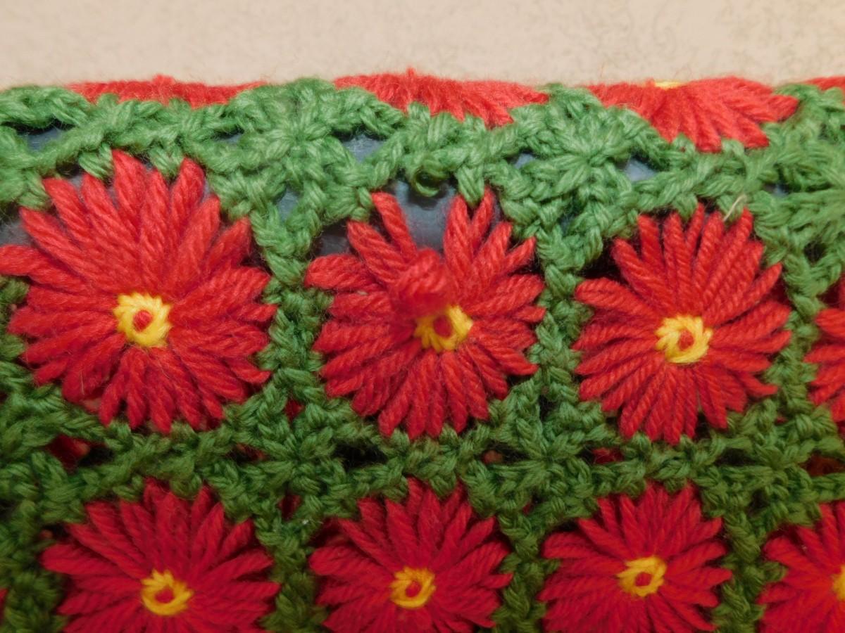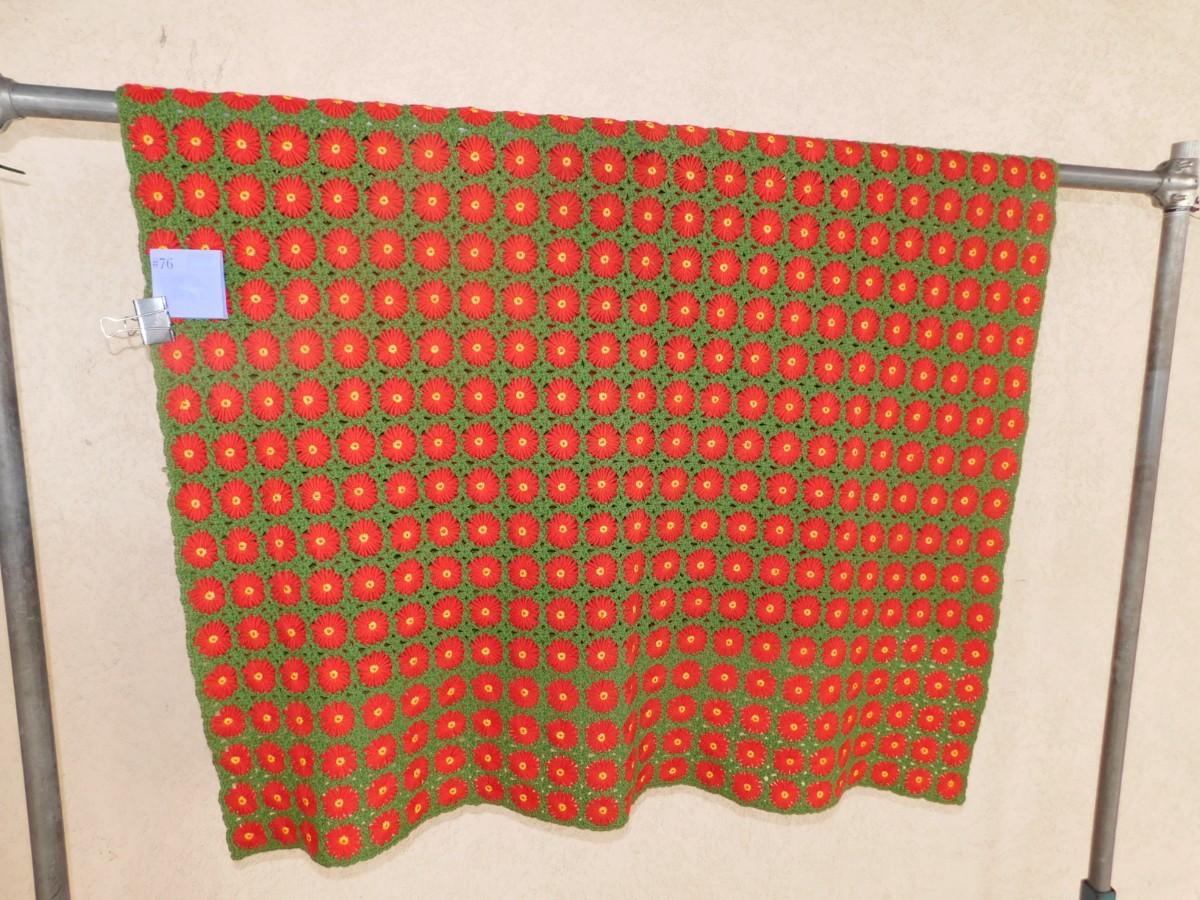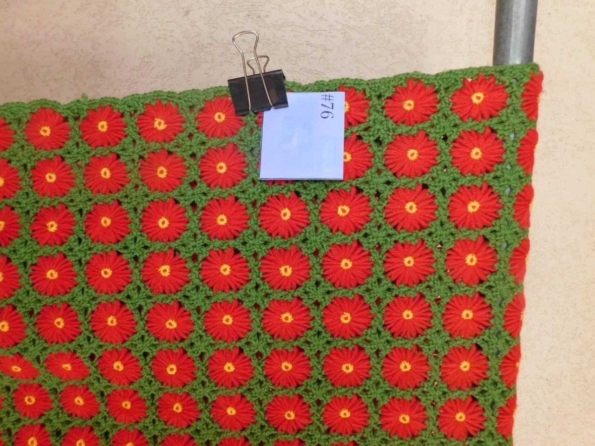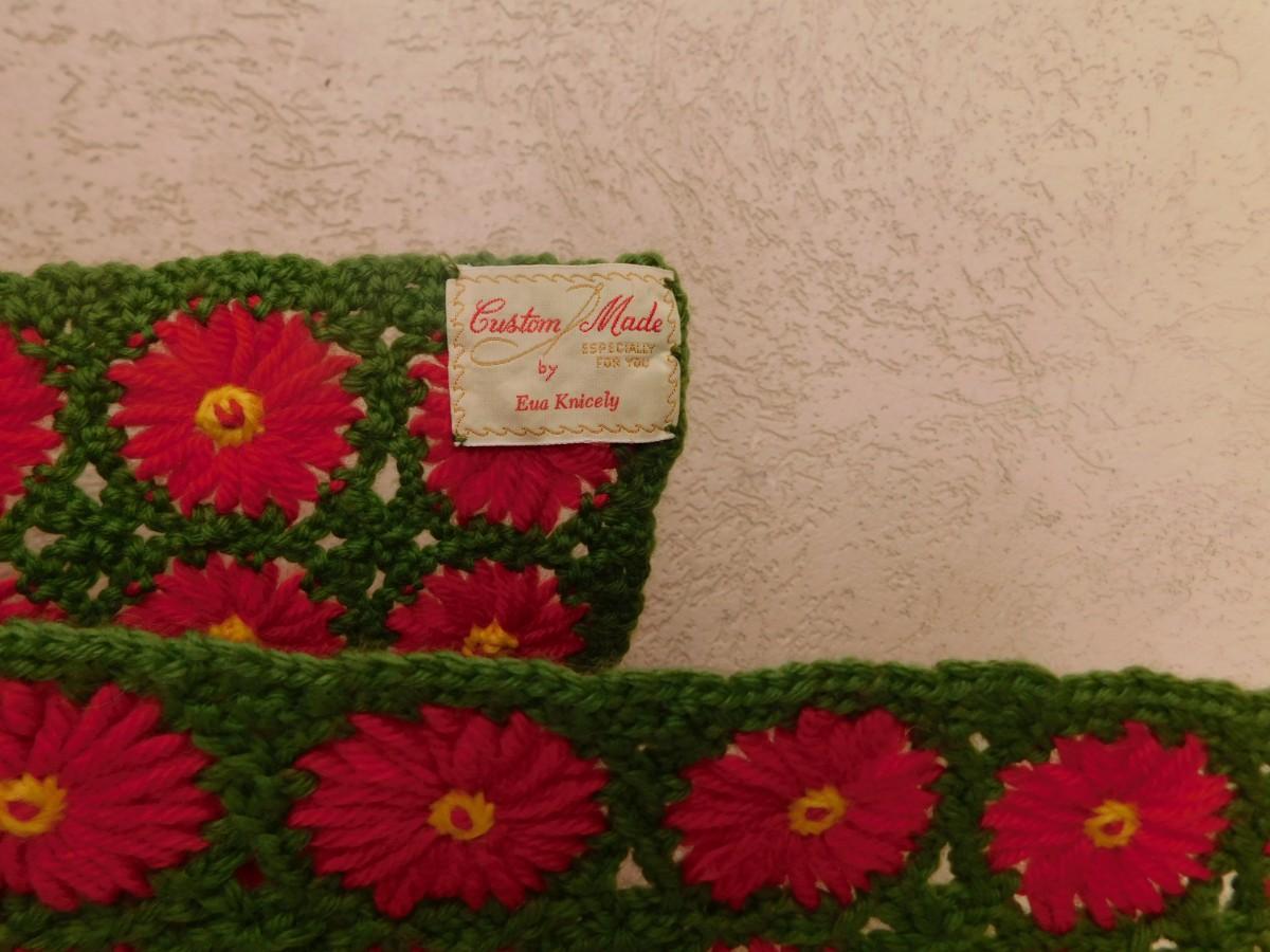 Has a tag in the corner, made by Eva Knicely. Has one small loose petal on a flower (Photographed). Measures 66"x49".