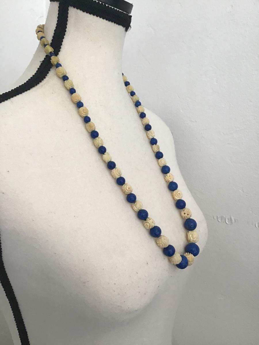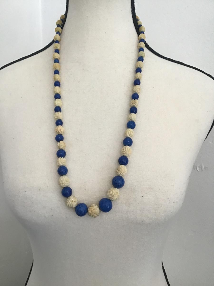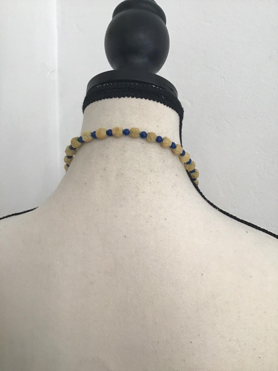 Beautiful, vintage hand carved pikake flower celluloid roses with blue polished stones necklace please see attached pictures