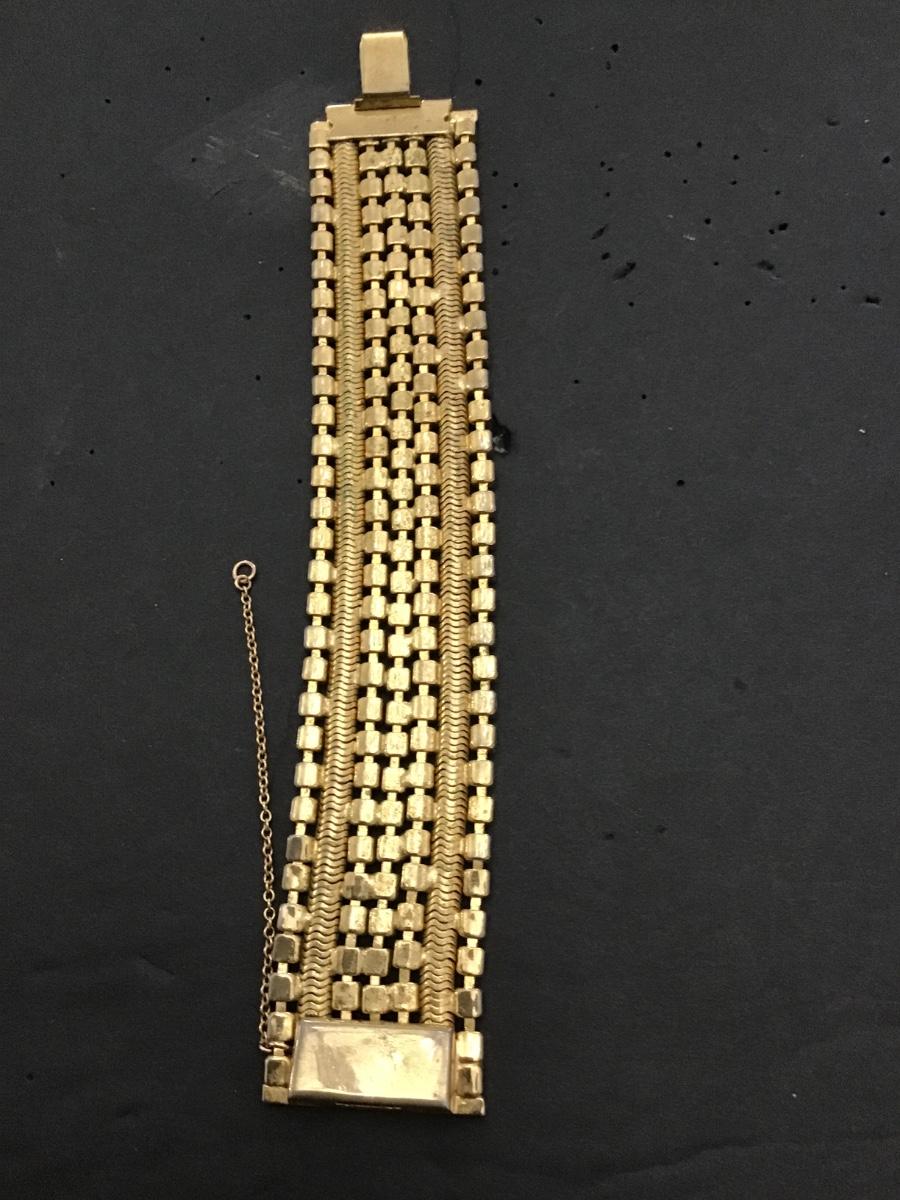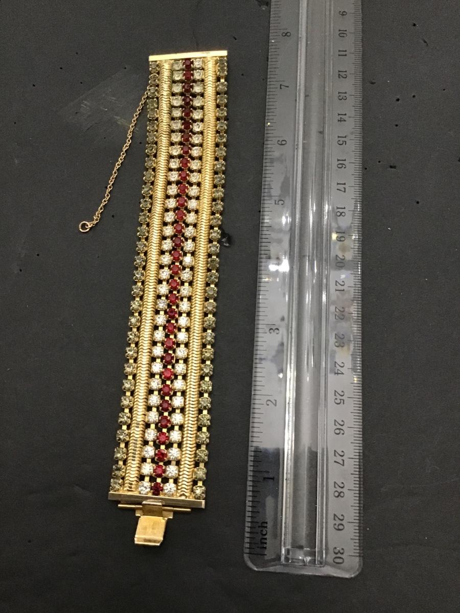 This is a beautiful vintage Hobe bracelet, clear and red rhinestones, gold tone bracelet. Please see attached photos.