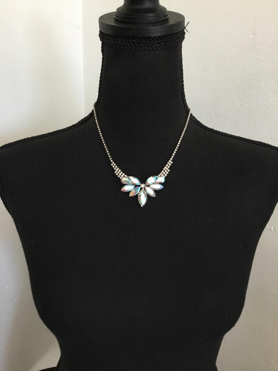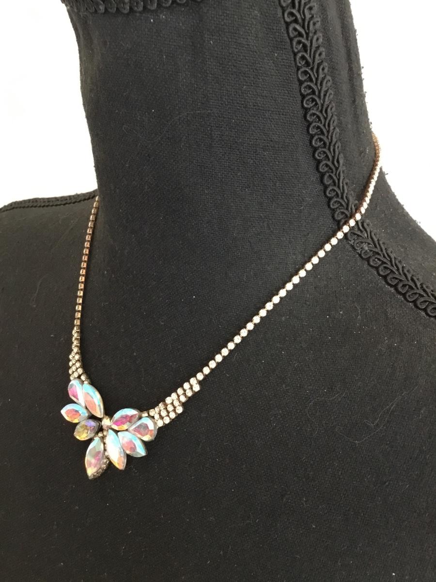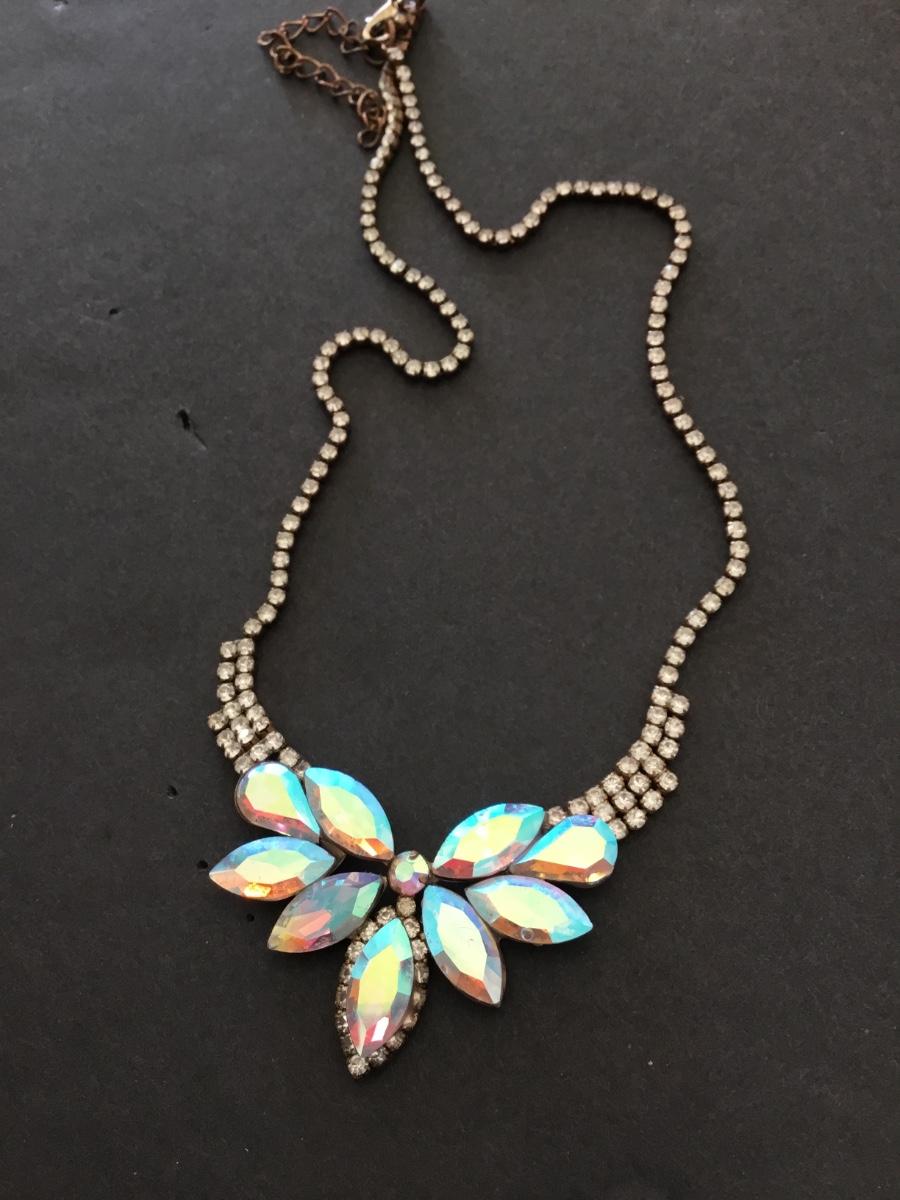 Beautiful, vintage, iridescent, rhinestone necklace has wear