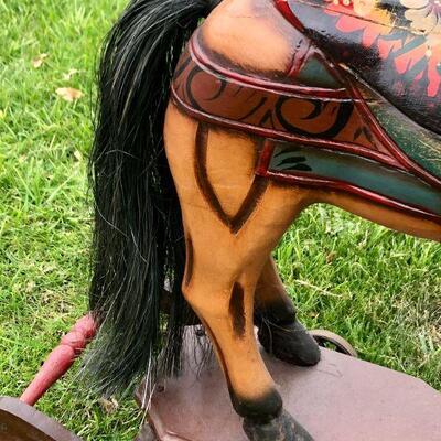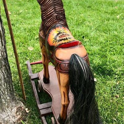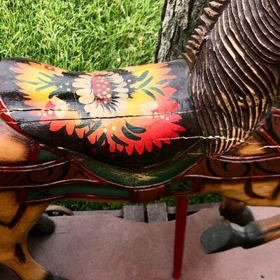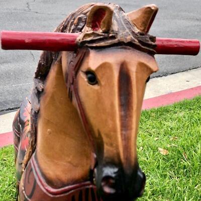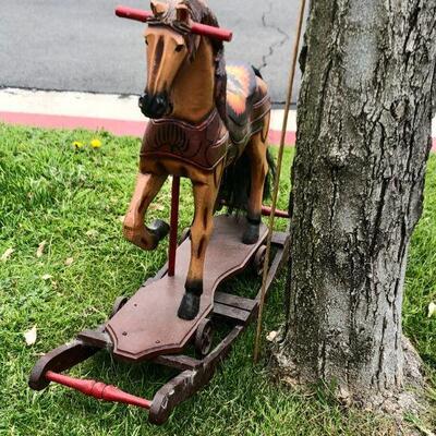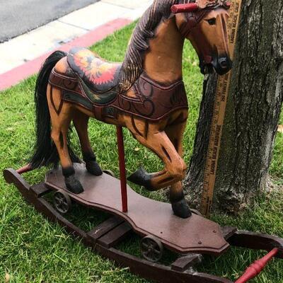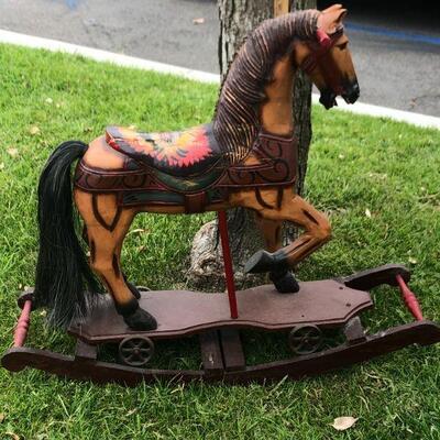 Large vintage carved wood rocking horse. Stands at about 24". Horse stands on a wheeled platform that was connected to a wood platform. It does have a couple cracks in the wood from age but is in wonderful vintage condition. Displays lovely, not recommended for children because of the cracks, may be unsafe.