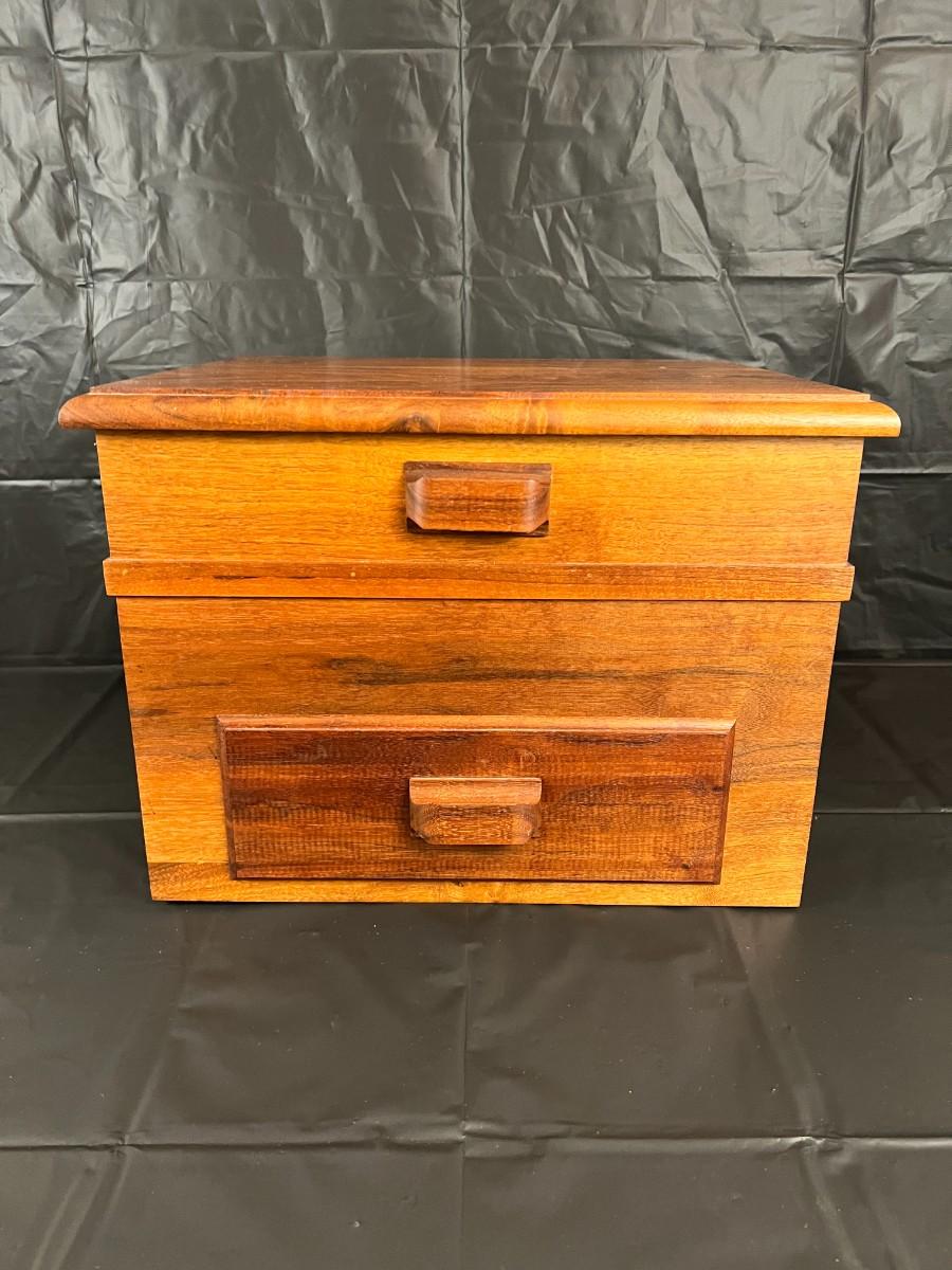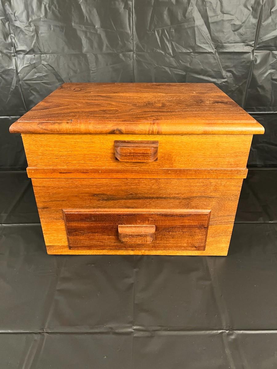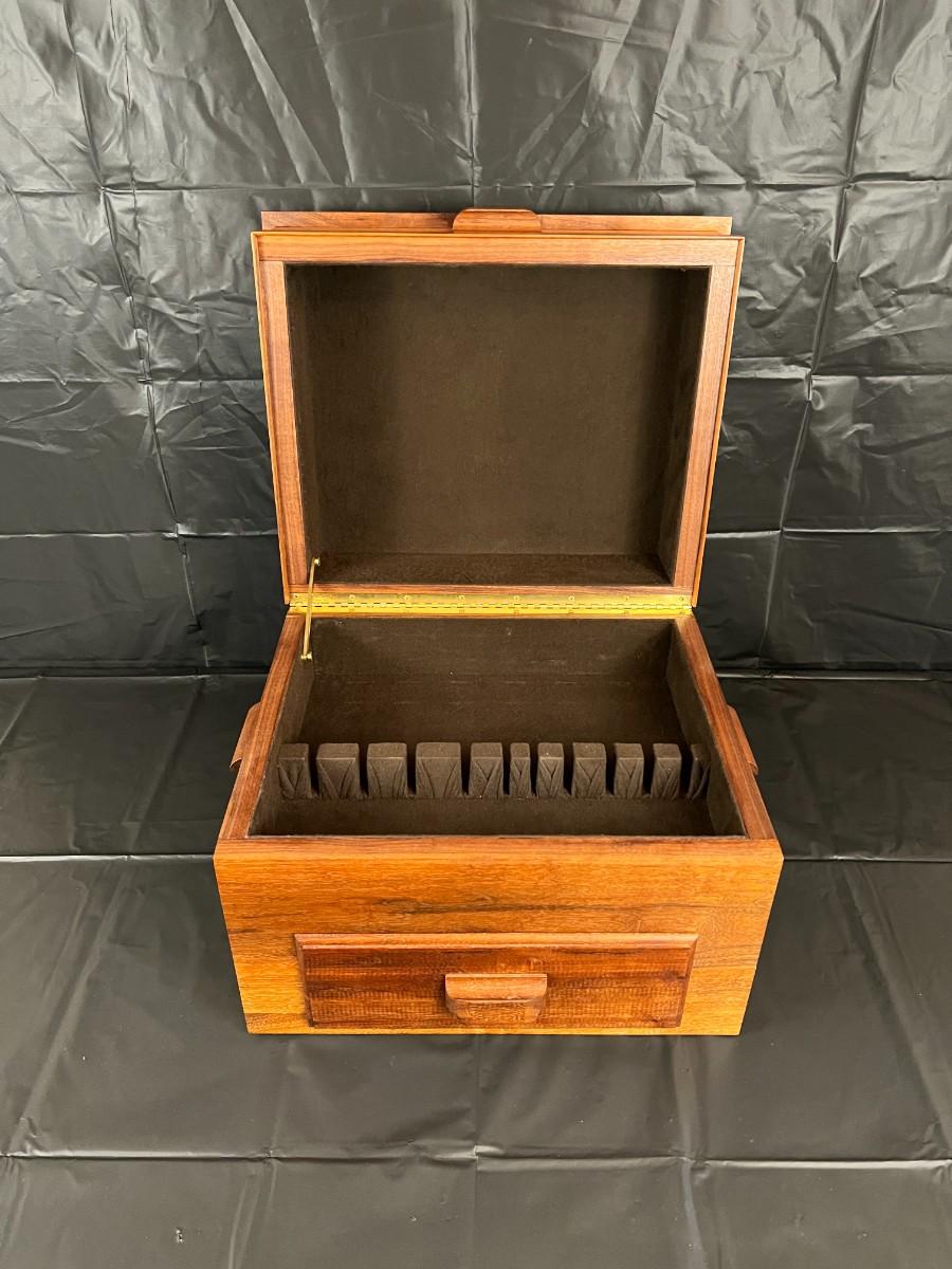 Beautiful Vintage Natural Wood Sterling Flatware Storage Box. Includes one main compartment and one drawer. Lined with a dark brown felt fabric. Light to medium brown wood stain, warm tone.