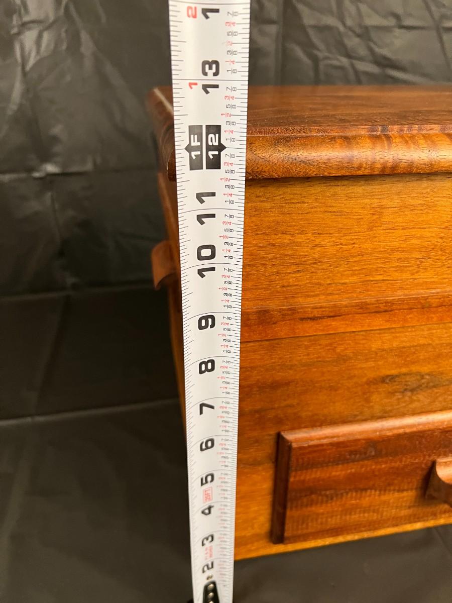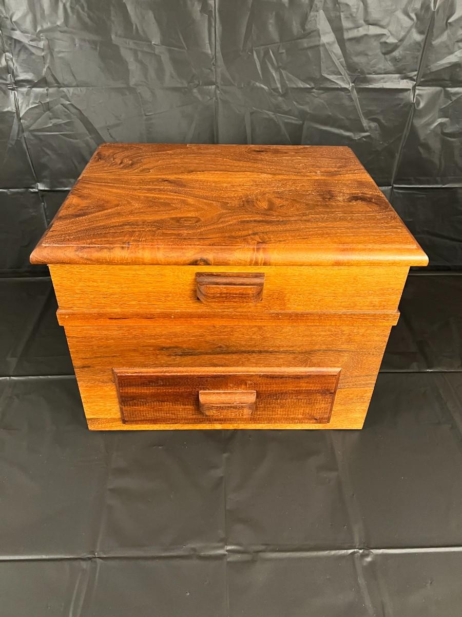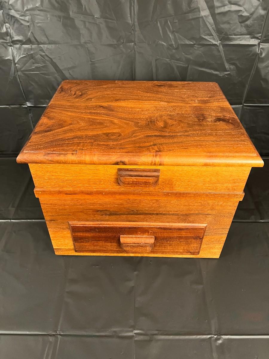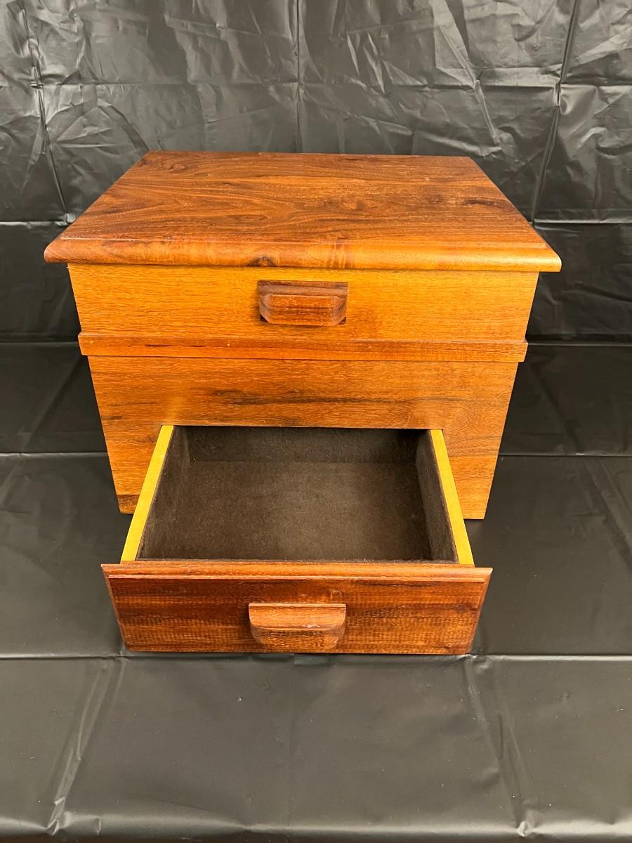 Beautiful Vintage Natural Wood Sterling Flatware Storage Box. Includes one main compartment and one drawer. Lined with a dark brown felt fabric. Light to medium brown wood stain, warm tone.